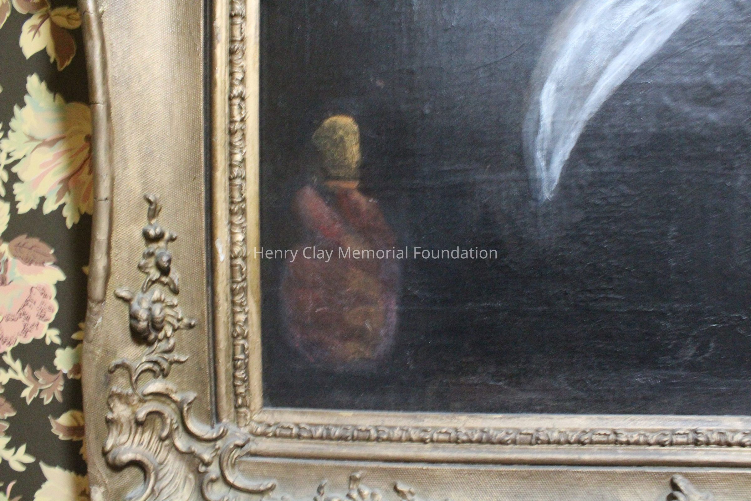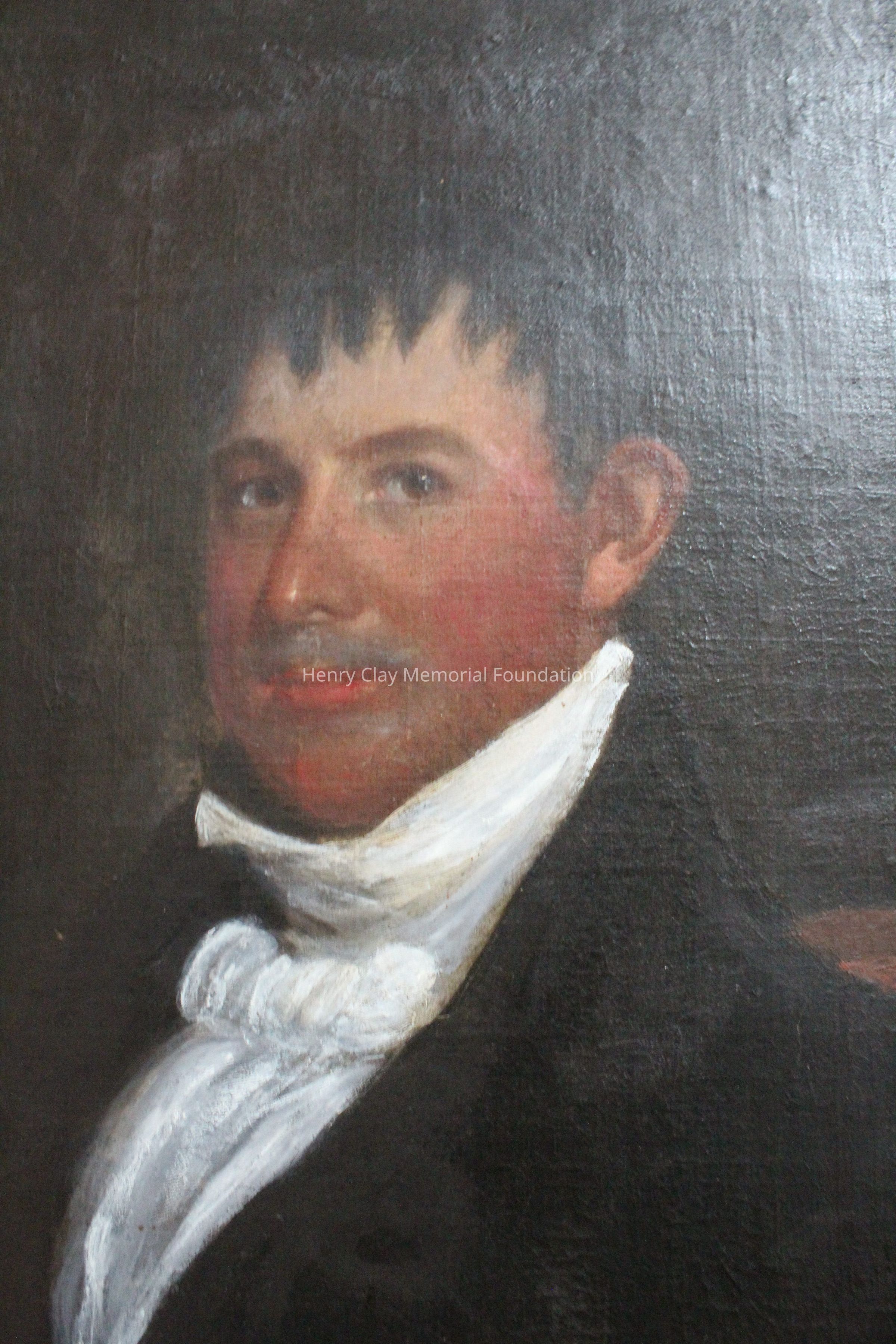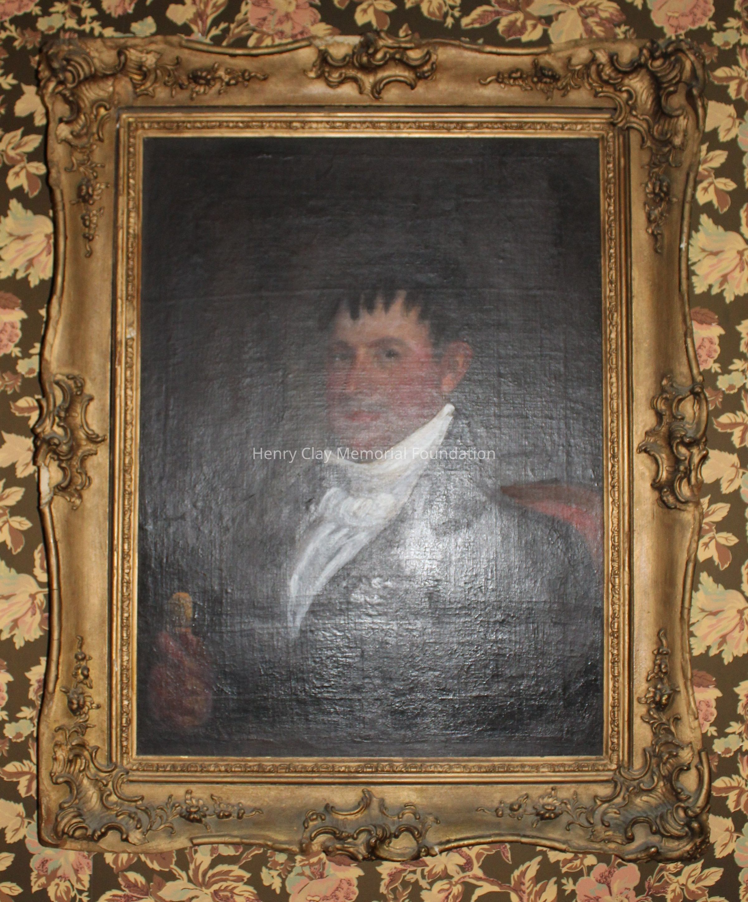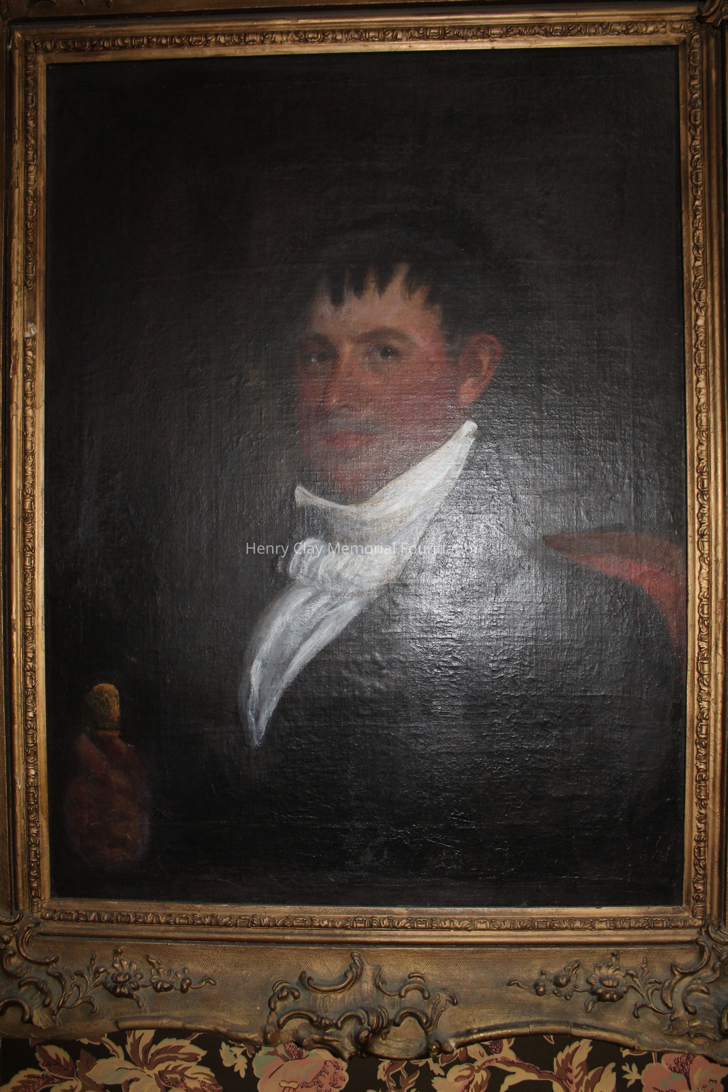 This portrait is of a man in a black coat, white shirt, and white cravat. His right hand is visible and in it he is holding a cane with a gold knob. The portrait is framed in a gilt gessoed Rococo frame. The man's hair is dark and cut into a jagged hairline. The man is seated in a dark wood chair with rose colored upholstery.Dimensions