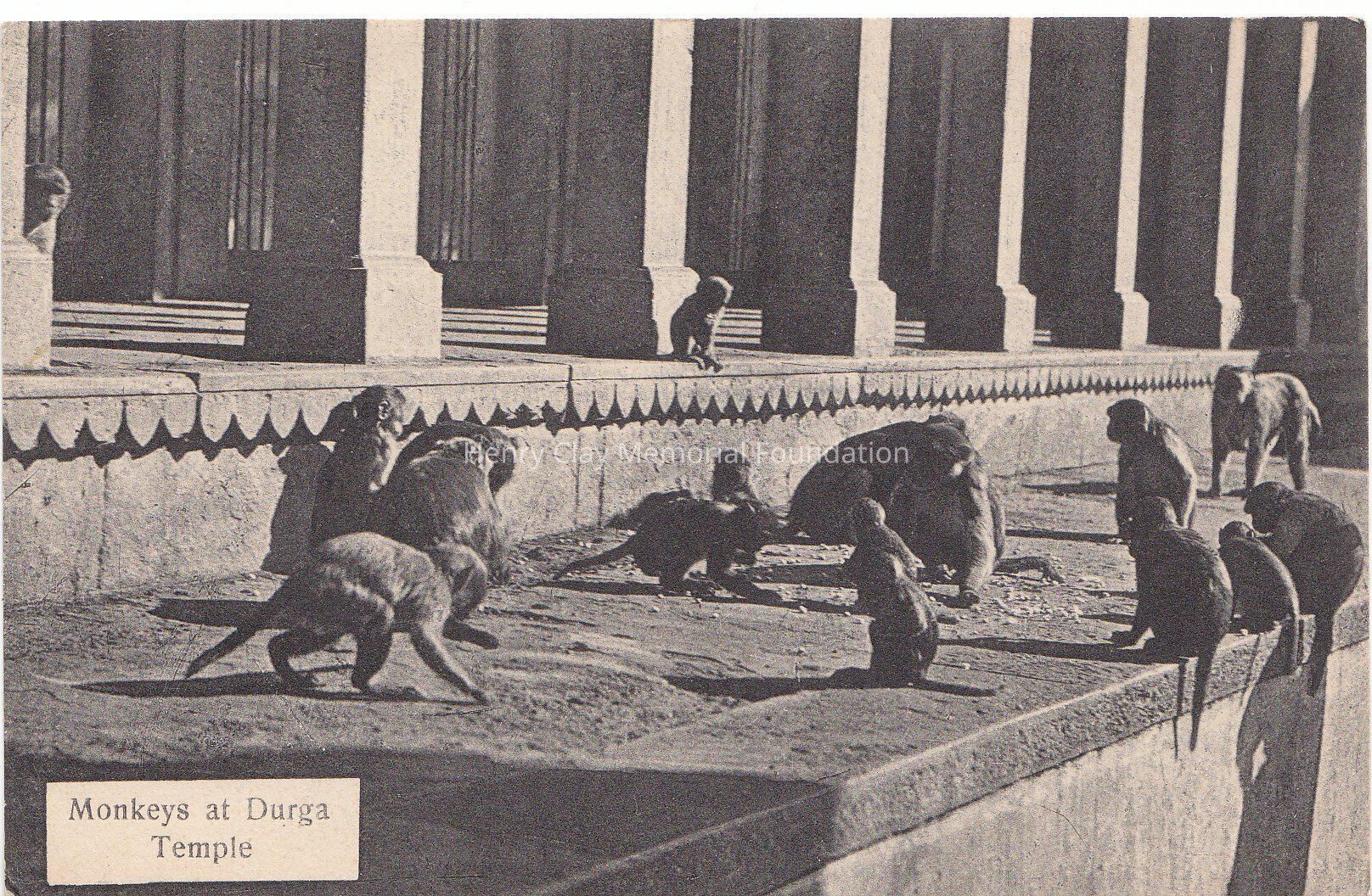 A black and white postcard depicting the Monkeys at Durga Temple