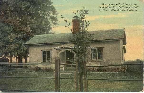 Glossy color postcard of one-story house with central chimney and small front portico with trees to the left and a fence in the front. Printed in black in upper right corner: "One of the oldest houses / in Lexington, KY., / built about 1825 by Henry Clay / for his Gardener." Reverse of postcard has a line splitting the left side from the right side. In fine green print up left side: "Published by F.M. Kirby & Co. Made in U.S.A."Dimensions