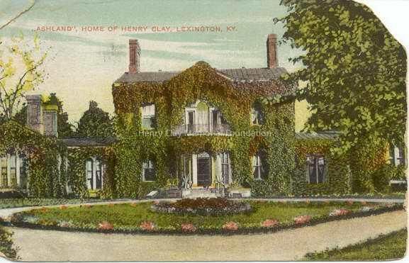 Color postcard depicting the front of the house at Ashland. The house is covered with ivy. In the upper left corner printed in pink: "'Ashland', Home of Henry Clay, Lexington, Ky." On the back side of card printed vertically up left side in brown: "F.M. Kirby & Co. -- Printed in Germany" and "17/11" printed in bottom left corner.Dimensions