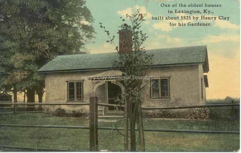Glossy color postcard of one story house with central chimney and small front portico with trees to the left and a fence in the front. Printed in black in upper right corner, "One of the oldest house / in Lexington, KY., / built about 1825 by Henry Clay / for his Gardener." Reverse of postcard has a line splitting the left side from the right side. A one cent green George Washington stamp is in in right upper corner. Postcard is postmarked Lexington, Apr. 6, 1915 and addressed to "Mrs. Millie Cloyd / Harrodaburg / Ky." In fine green print up left side, "Published by F.M. Kirby & Co. Made in U.S.A."