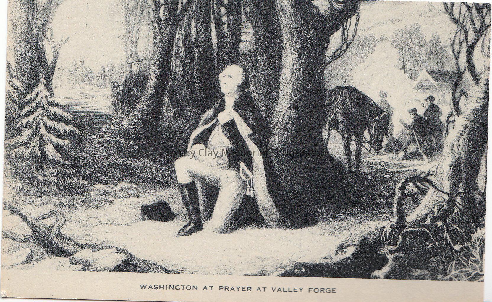 A black and white postcard depicting Washington kneeled praying at Valley Forge. He is in the woods a man is looking at him behind a tree, in the background men are camping.