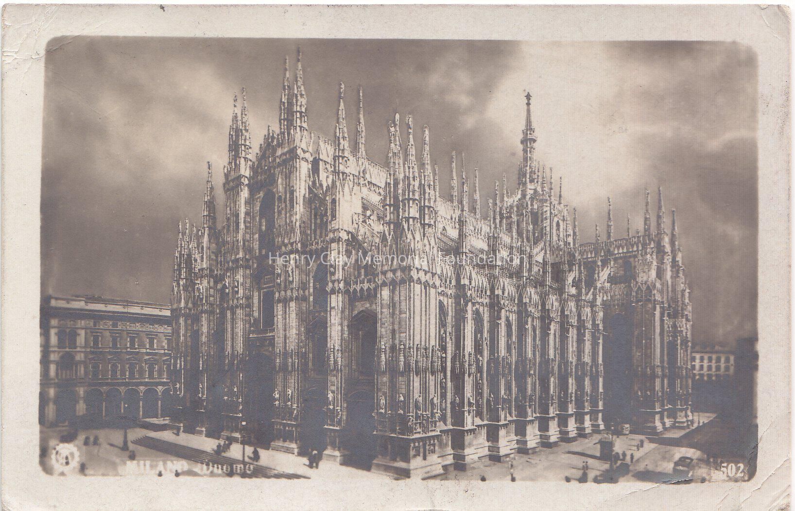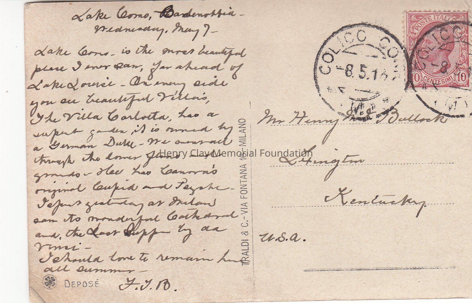 A post card of the Duomo di Milano. In the rear, a 10 centesimi (cents) stamp, The postcard is adressed to Henry Bullock, Lexington, Kentucky. On the left side a description of the visit to Como, on wednesday may 7th 1913. The postcard is signed F.I.B.Dimensions