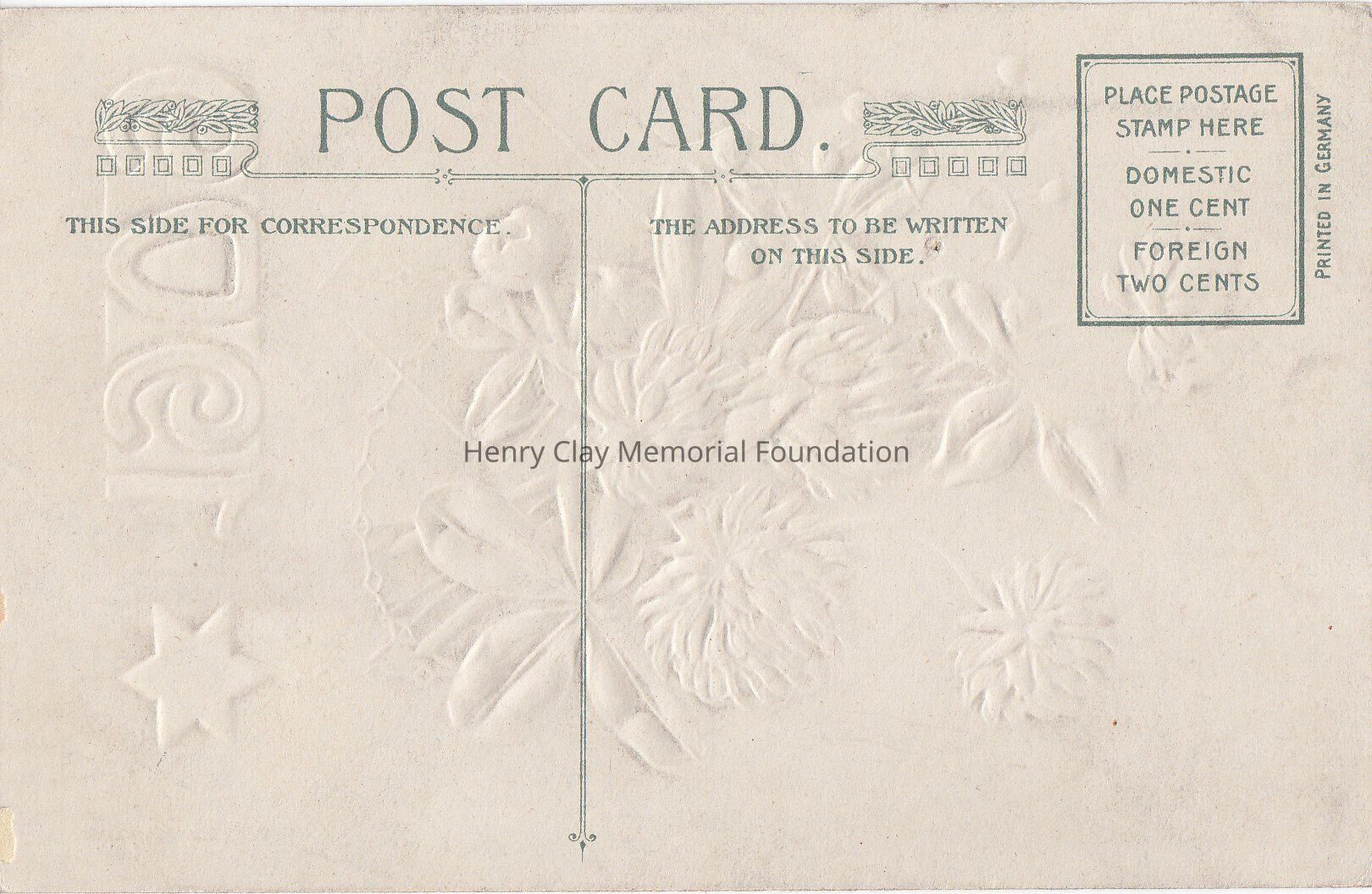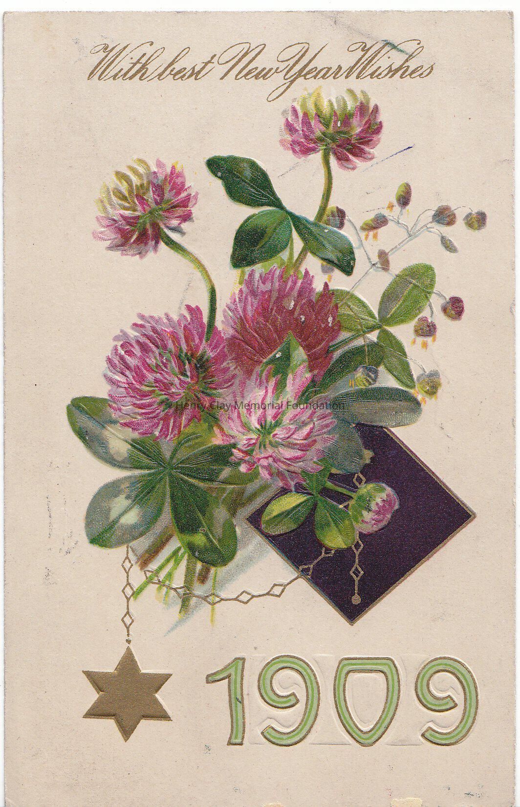 Postcard. In front a colored print with clovers flowers, with a golden chain hanging from them, with a star at the end. On top in gold " With best New Year Wishes" underneath 1909 in green and gold.