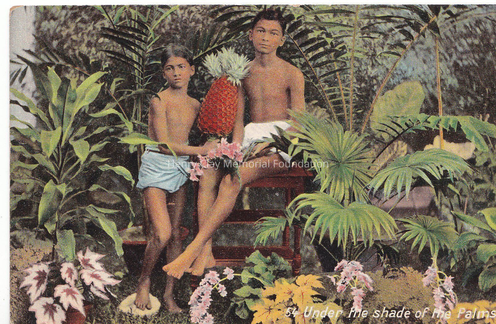 A colorized postacard with two young boys in a tropical settings. Underneath on the bottom right corner " 54 under the shade of the palms On the rear "Union Postale Universelle Ceylon (Ceylan)