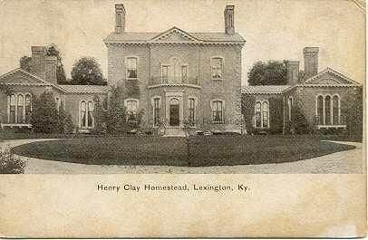 Rectangular card with black and white image of the front of Ashland on the front of card, identified beneath image as "Henry Clay Homestead, Lexington, Ky." Reverse of card has hand-written message to recipient in Jeffersonville, Indiana and is postmarked June 4, 1913.