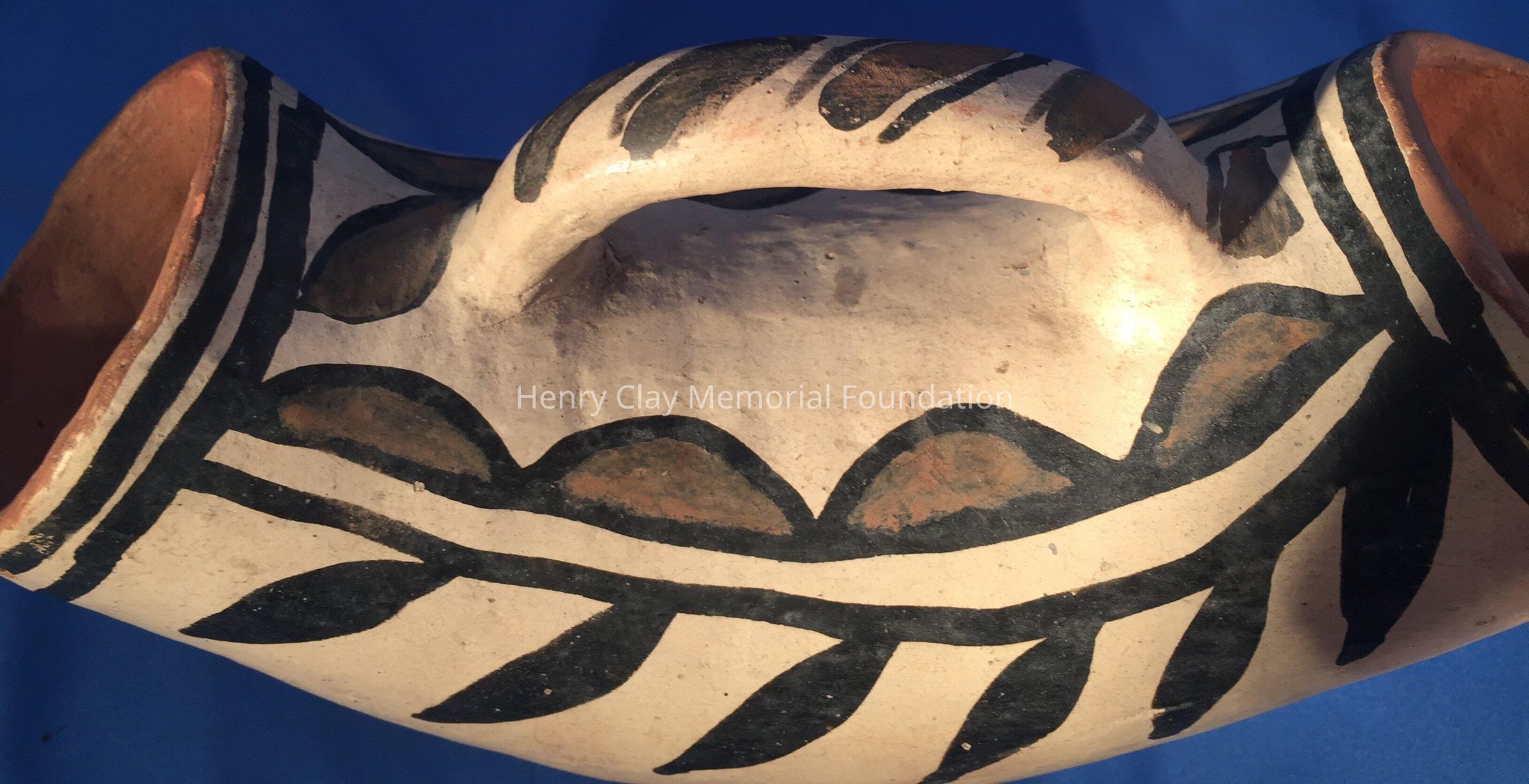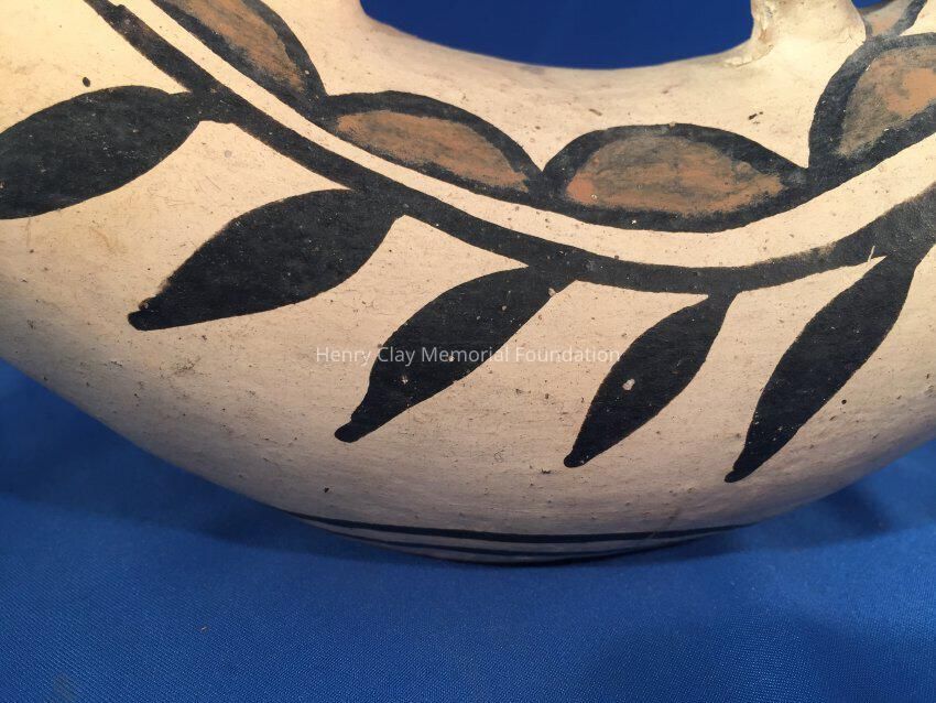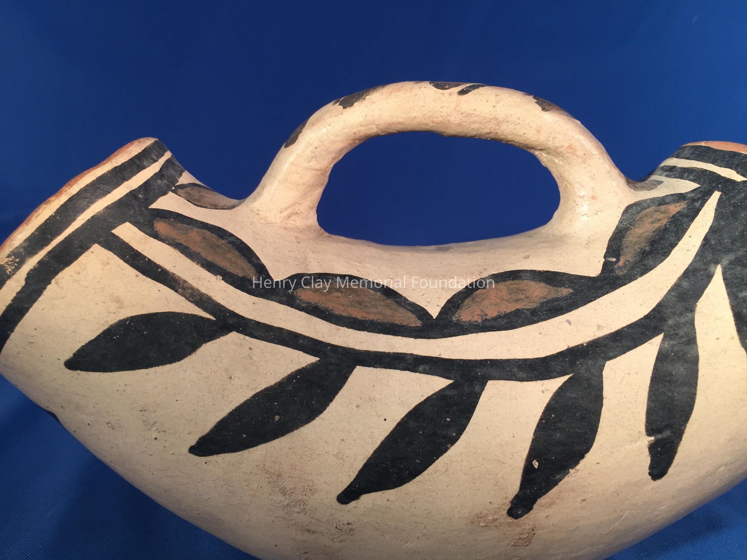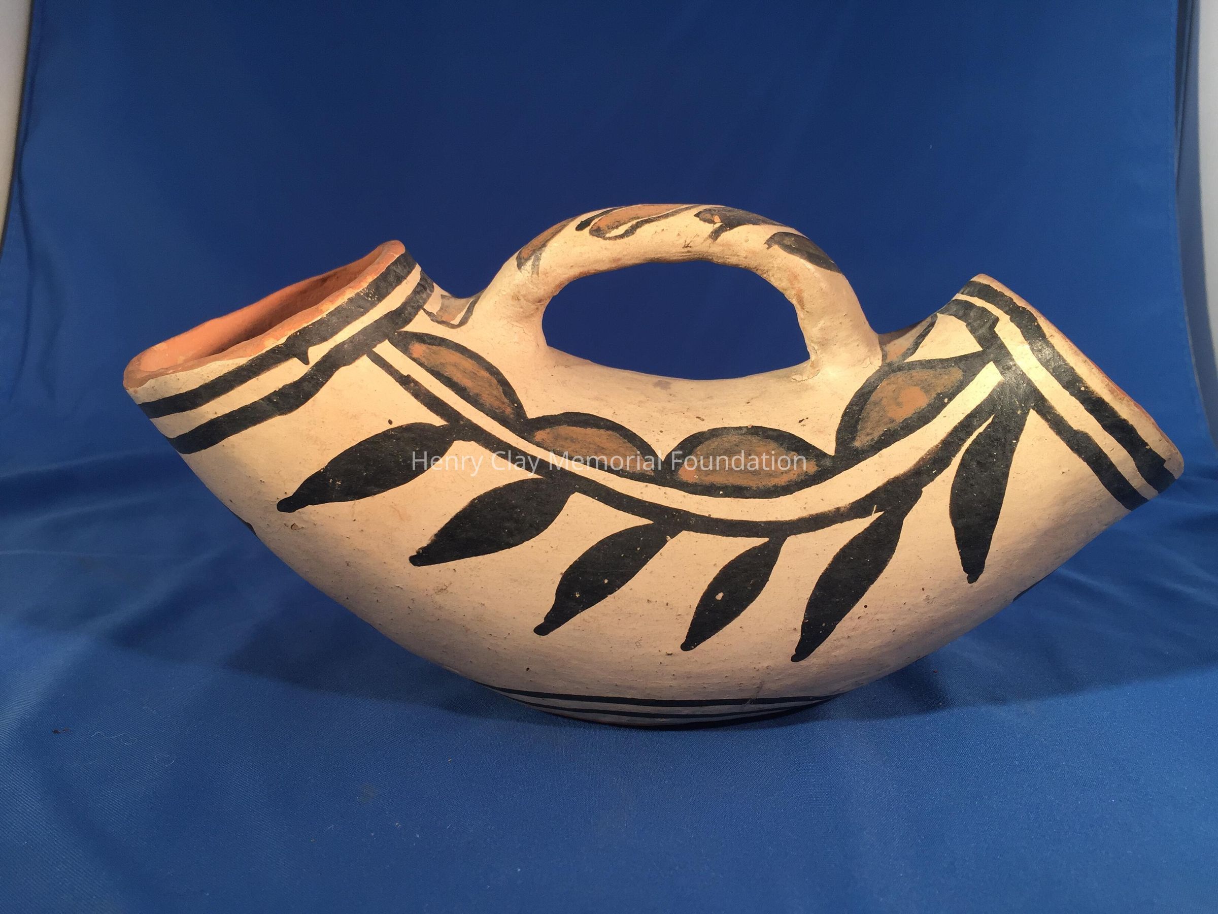 This pottery piece is a curved tube that curves upward at each end from a central base. It has a handle on the top and round openings at each end. It is painted white with black and green leaf shaped designs.