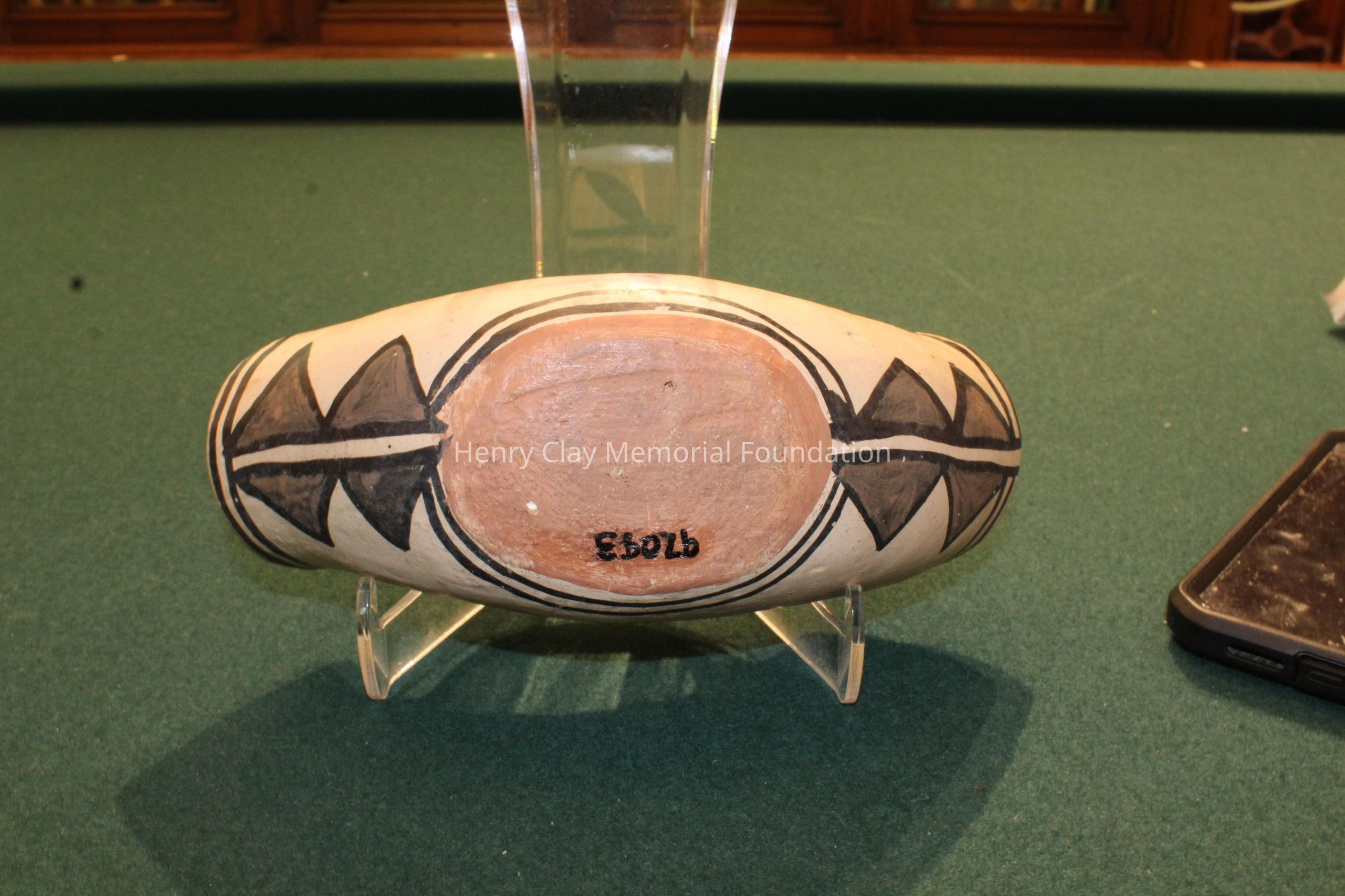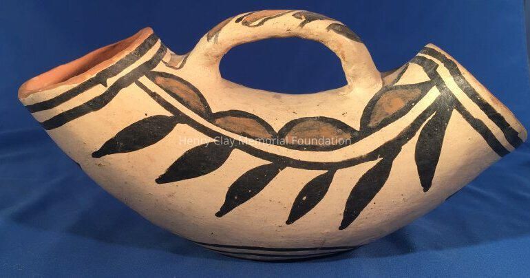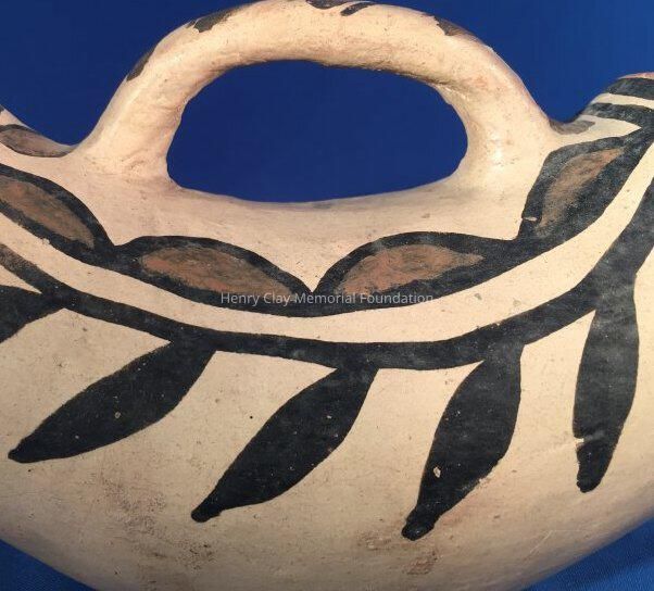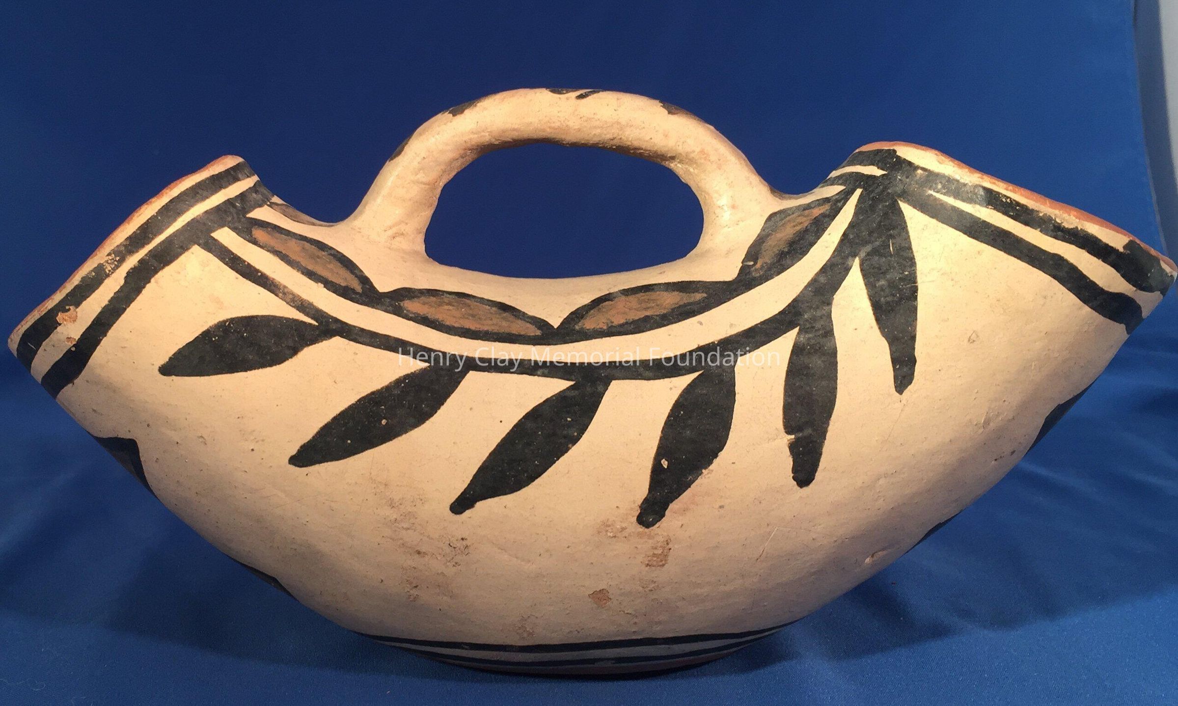 This pottery piece is a curved tube that curves upward at each end from a central base. It has a handle on the top and round openings at each end. It is painted white with black and green leaf shaped designs.