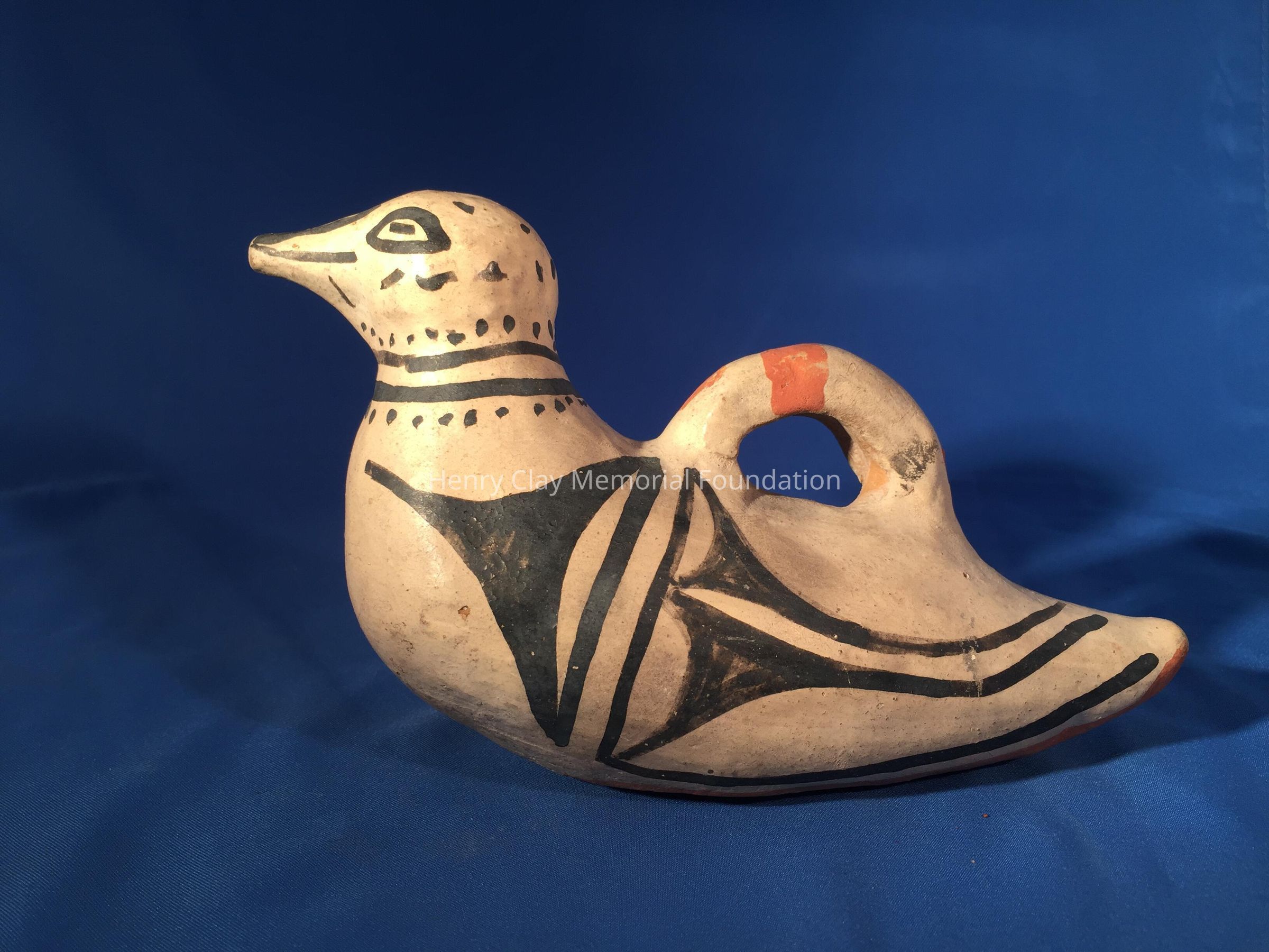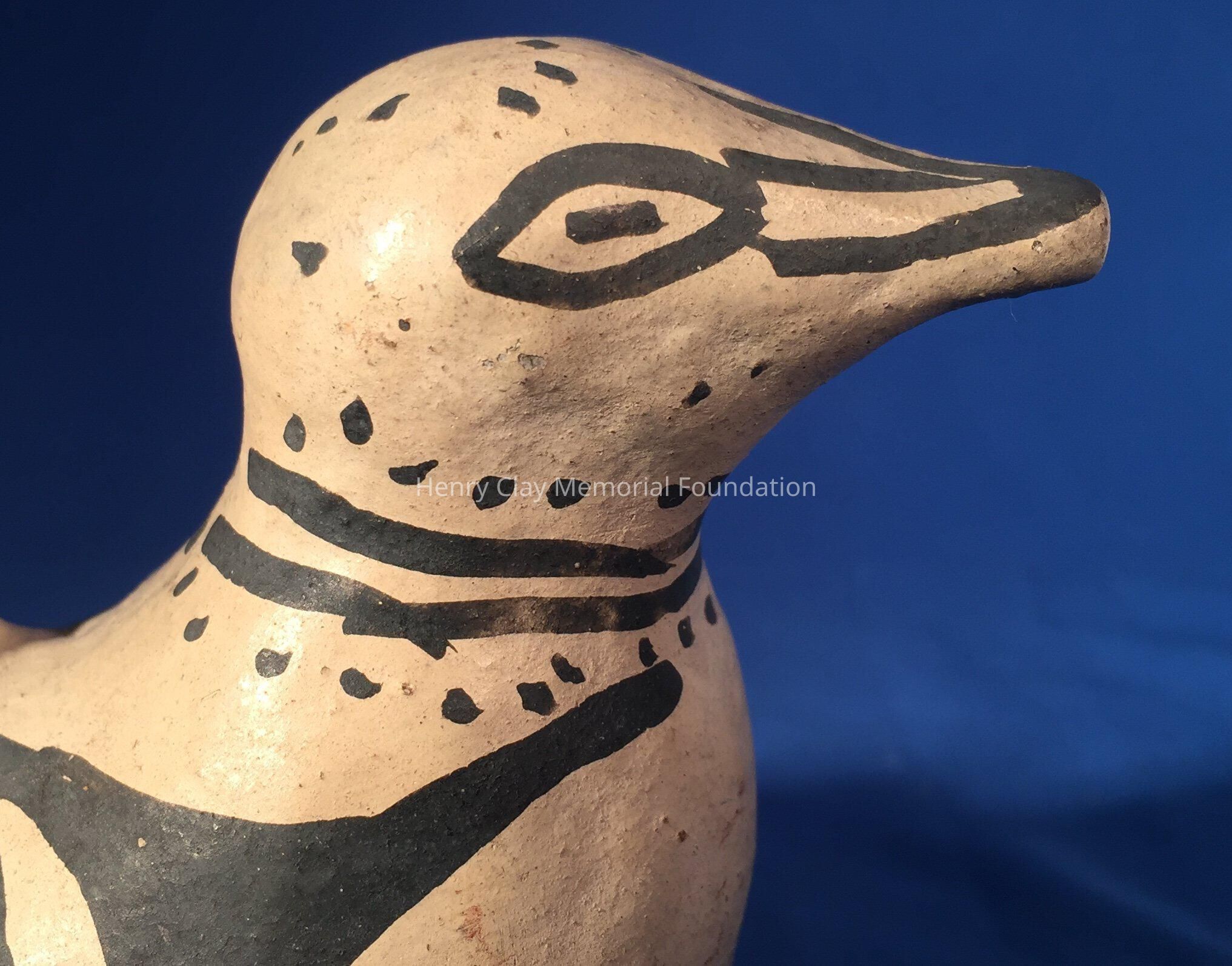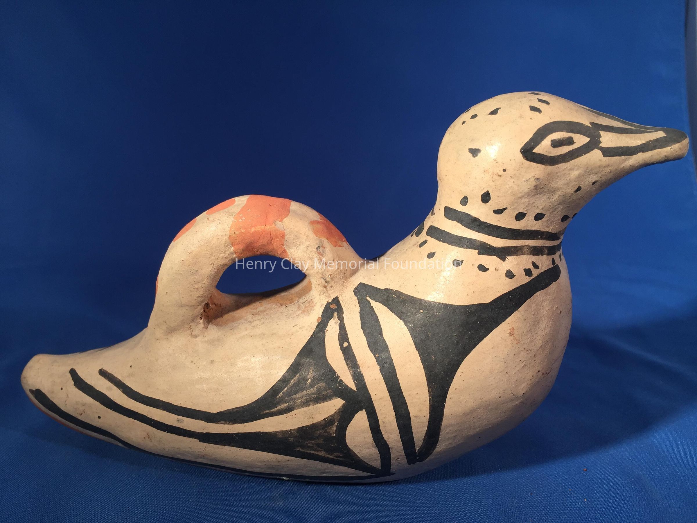Clay pottery bird figure with handle. The bird is painted white with black designs. The bottom is unpainted and has a hole in it.