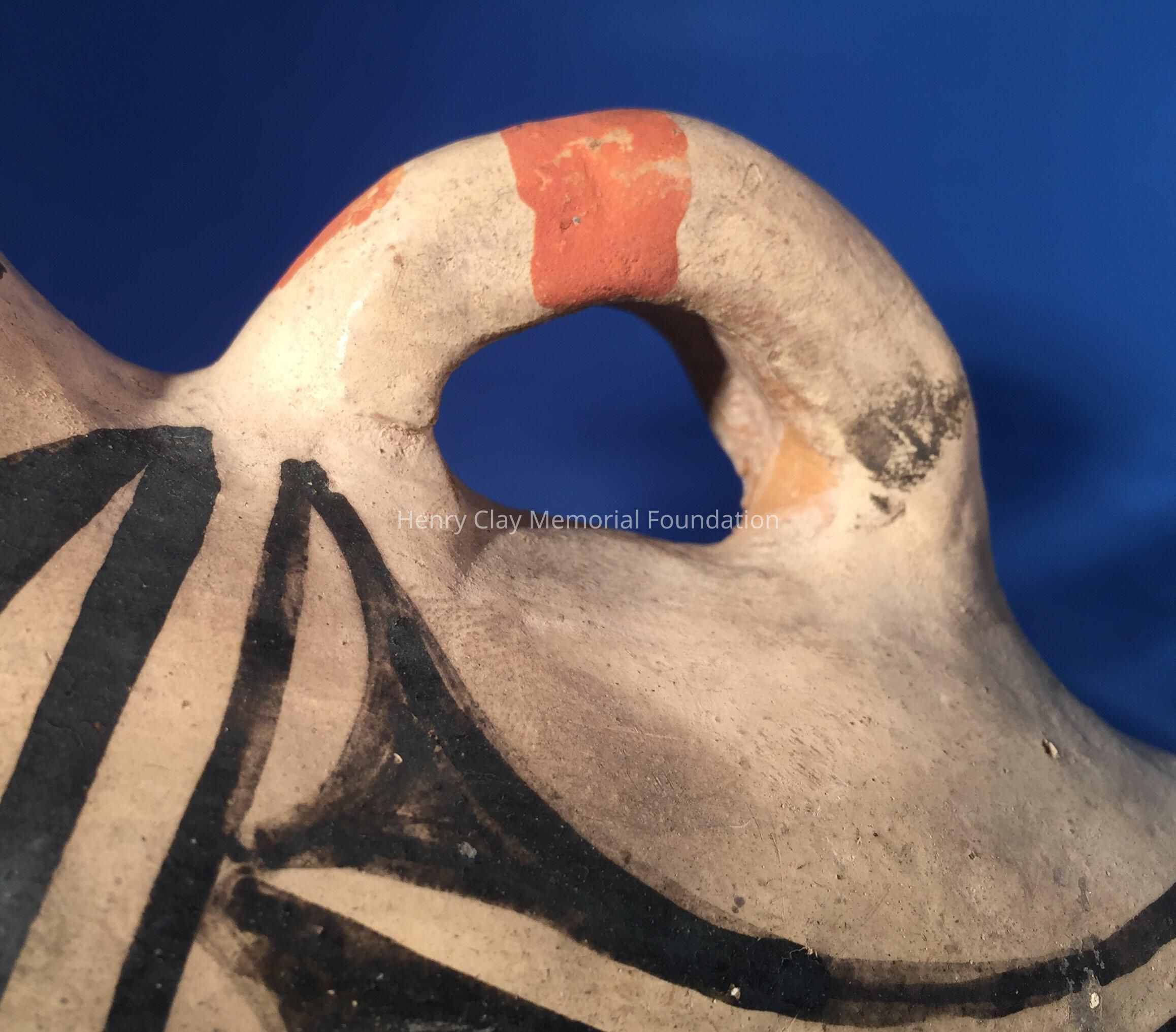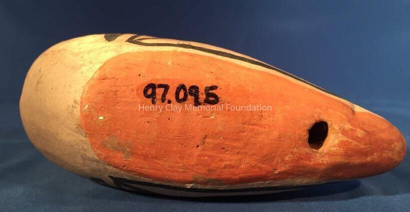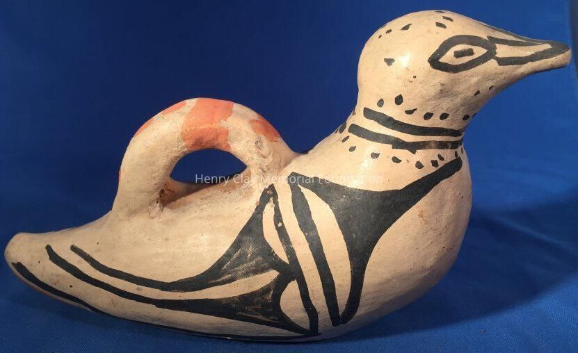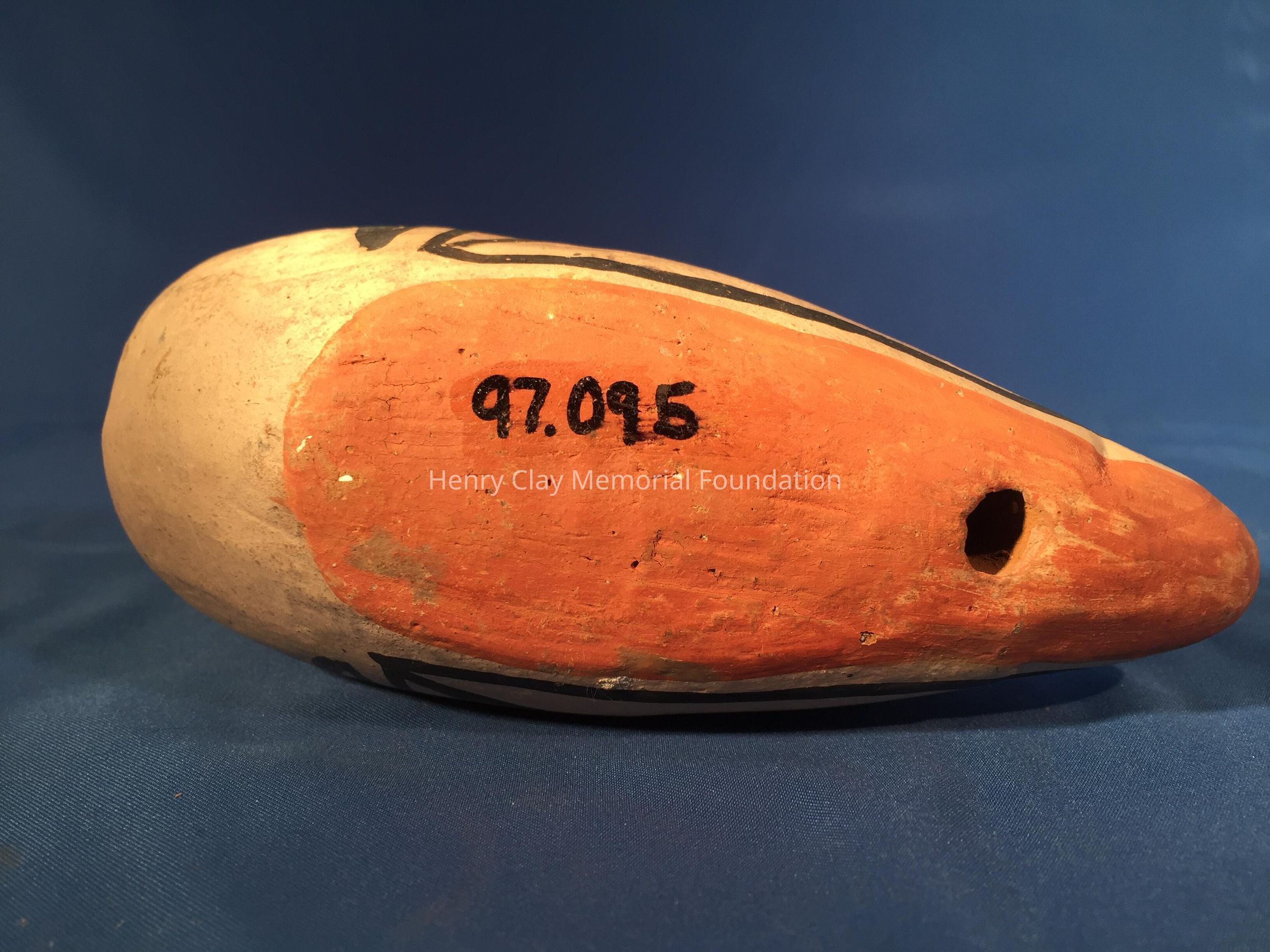 Clay pottery bird figure with handle. The bird is painted white with black designs. The bottom is unpainted and has a hole in it.