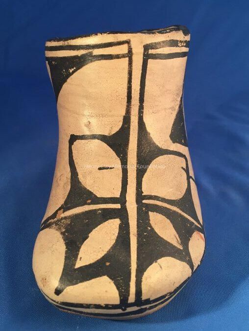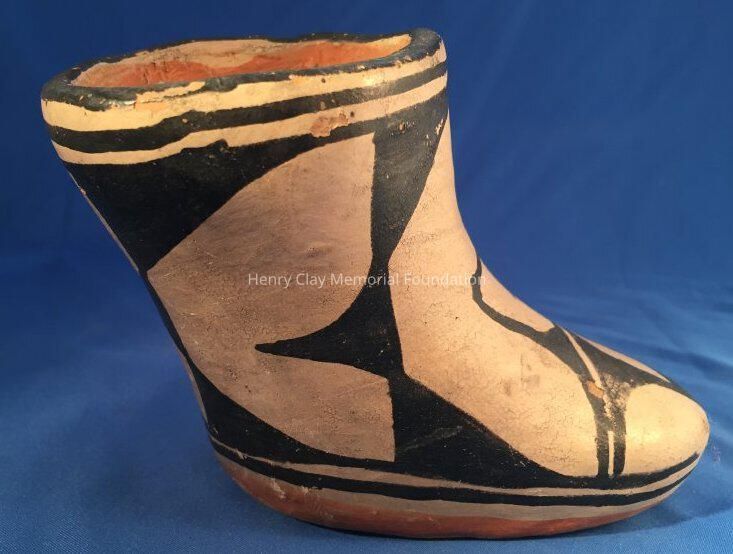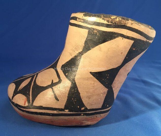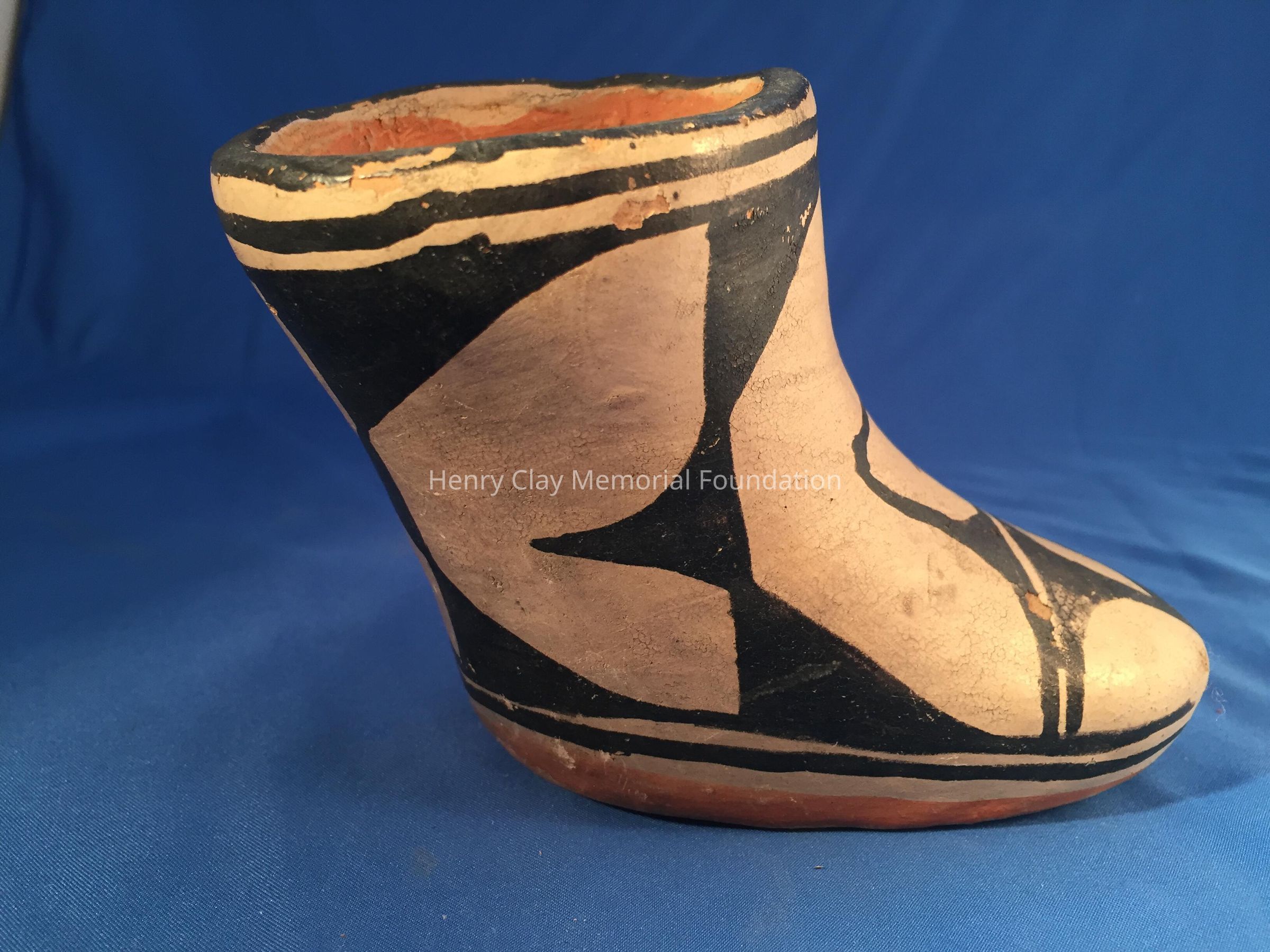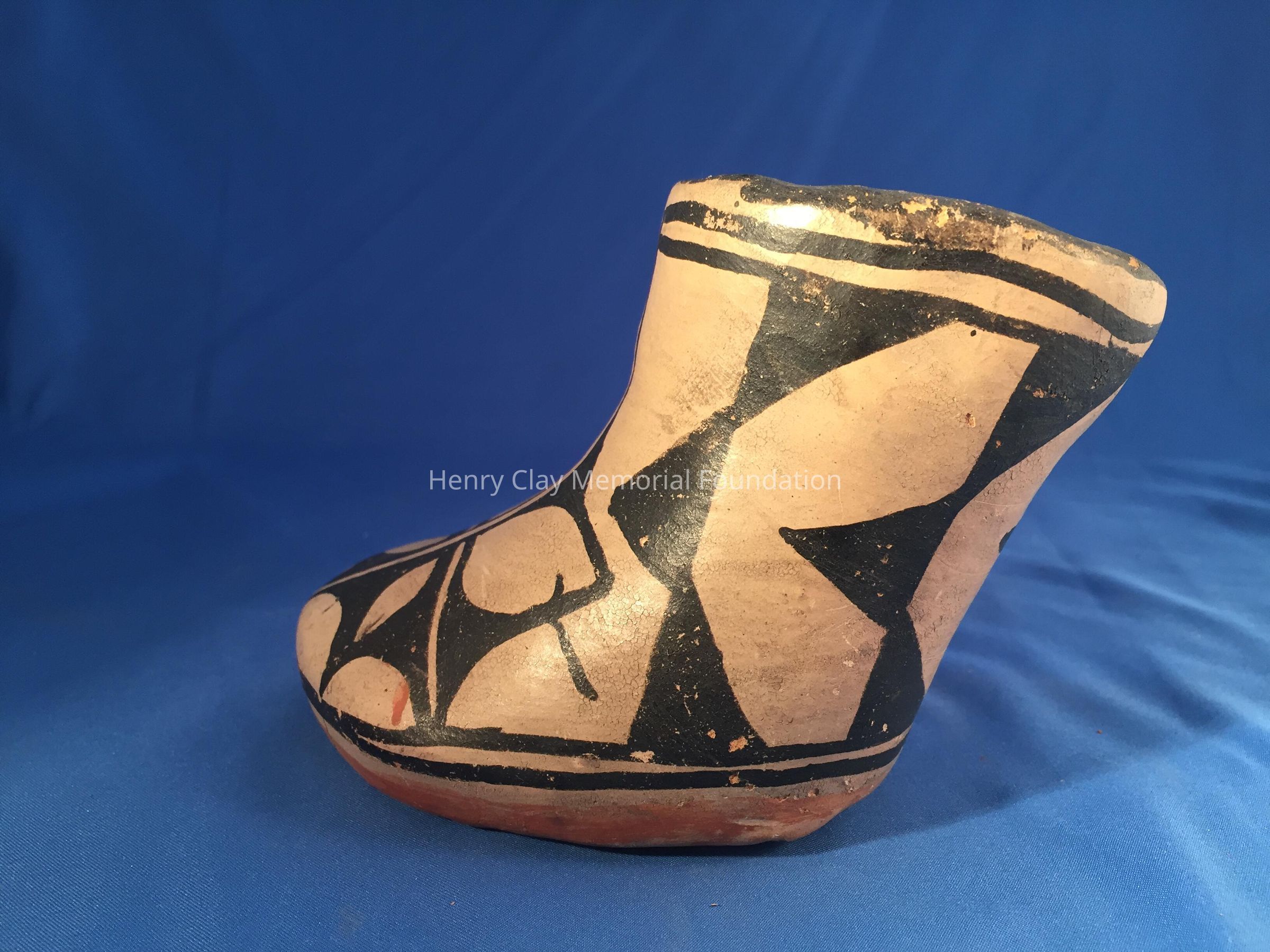 Red clay pottery vessel in the shape of a boot.