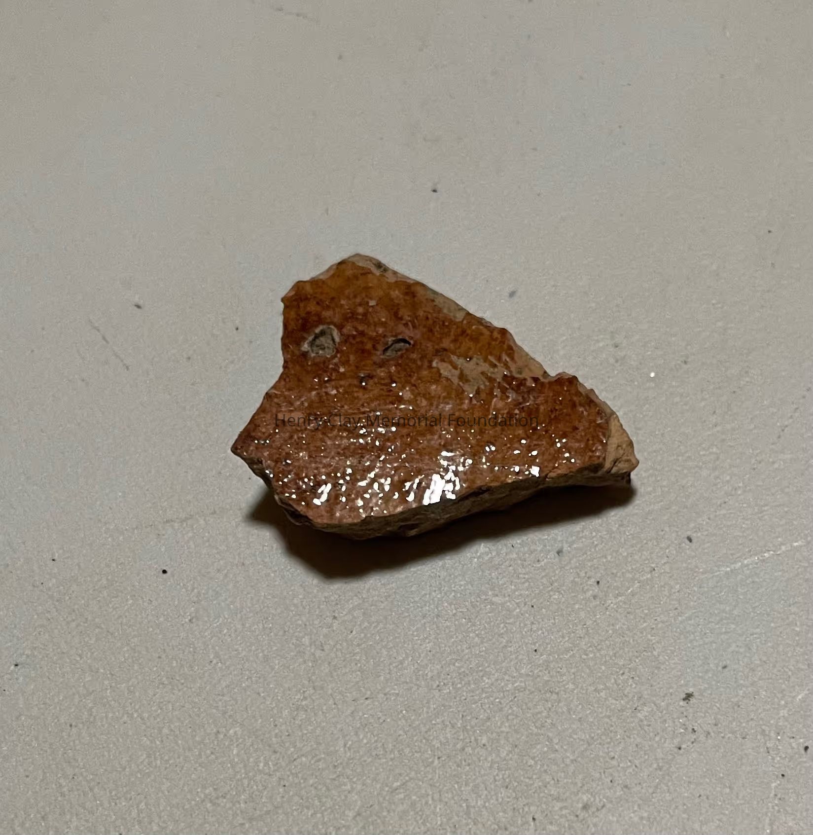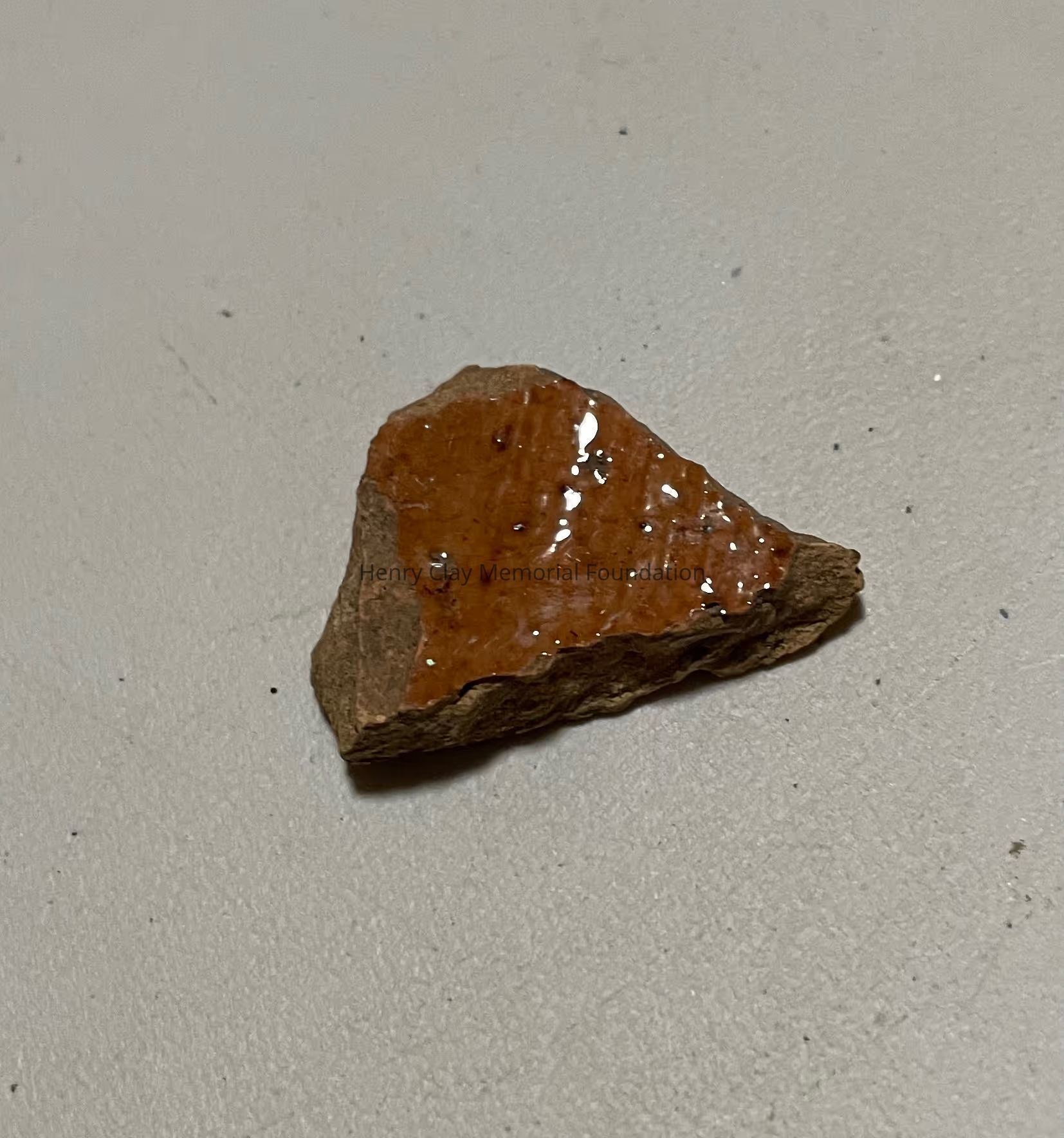 a small fragment of stoneware pottery coated in orange glaze