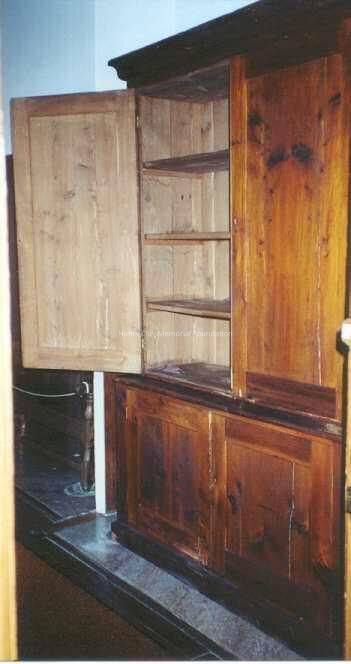 Cedar linen press. Two separate pieces with top sitting back on base. Both top and bottom have two doors, three shelves at top, one at bottom.Dimensions