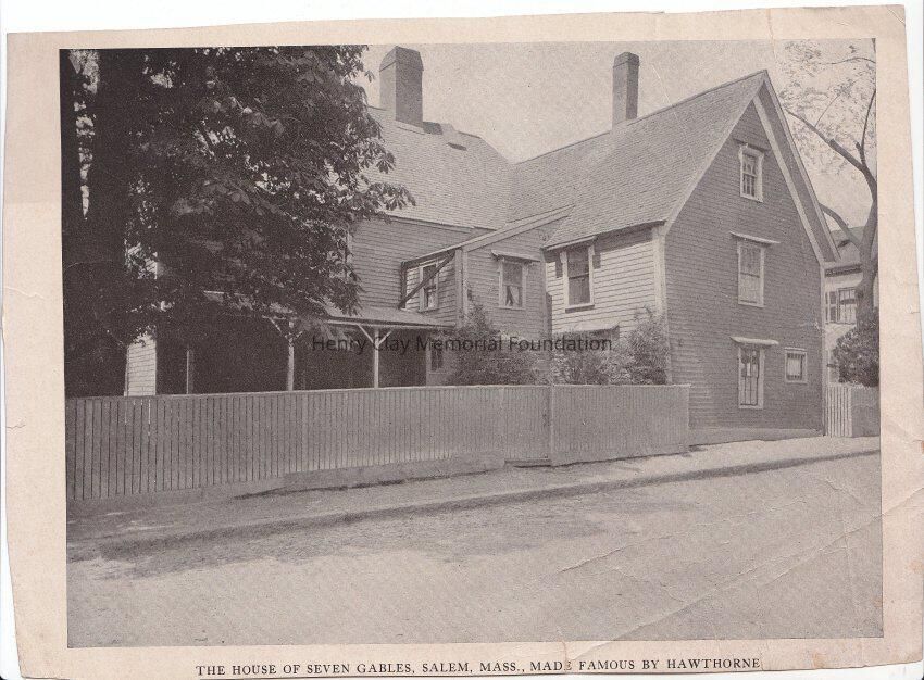 A print of a black and white photograph of the house of the seven gables, Massachusset, Made famous by Hawthorne. Salem. The house is a simple construction with two chimneys