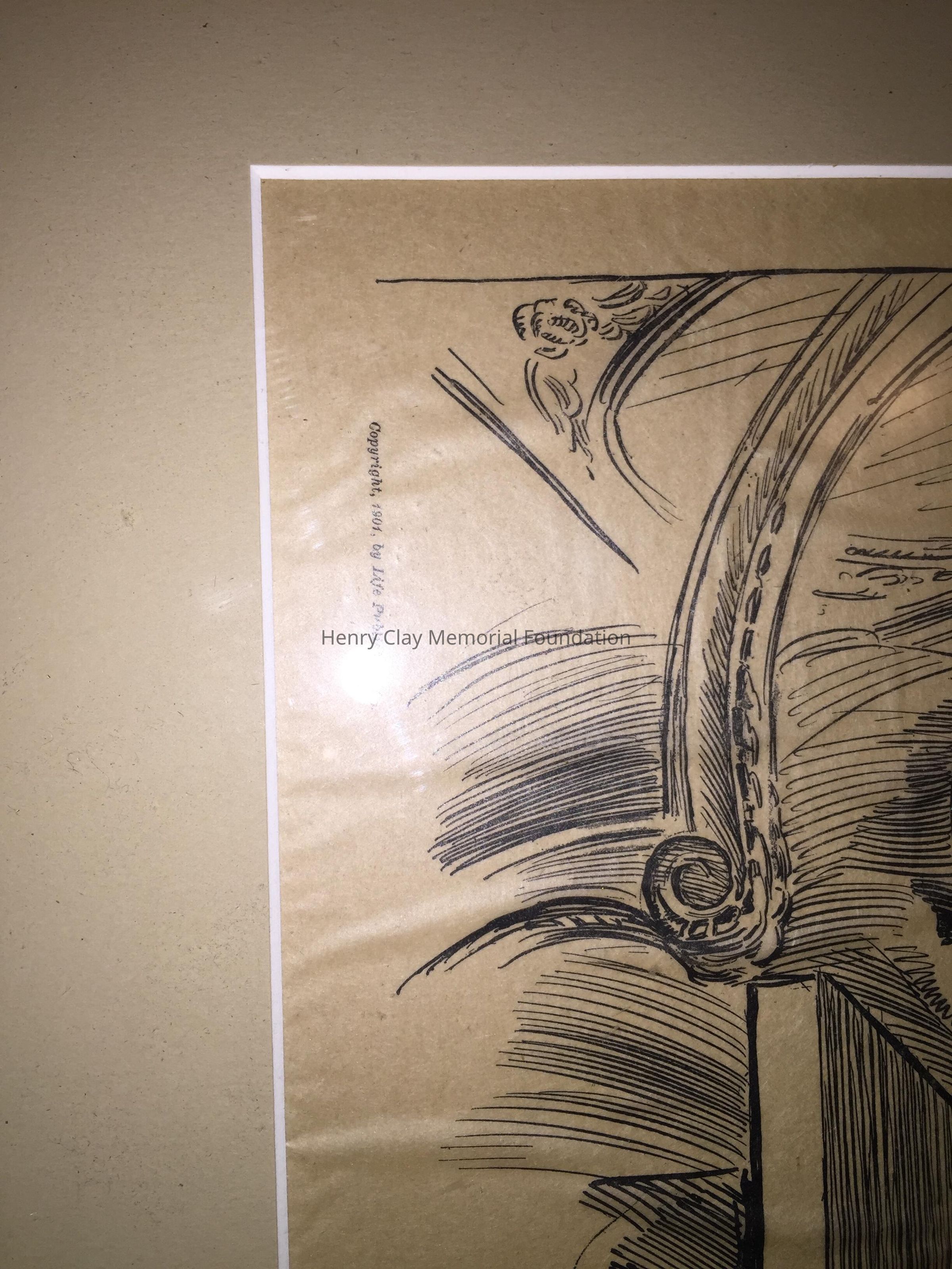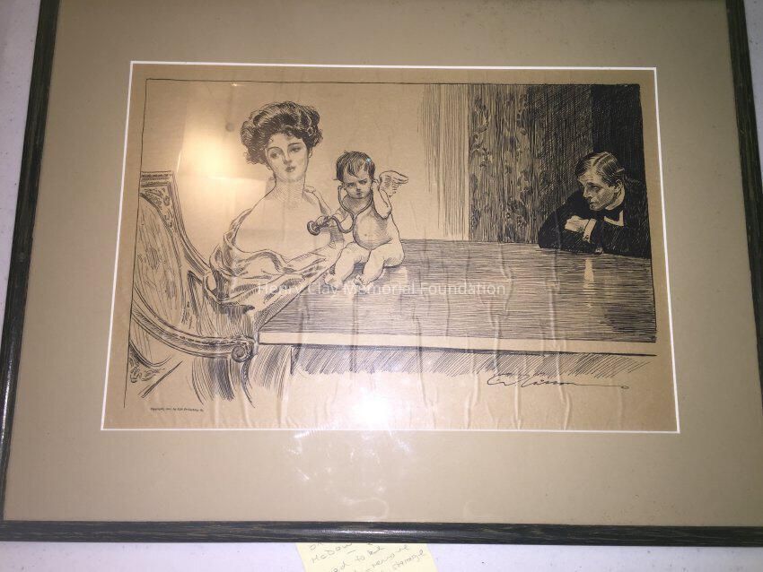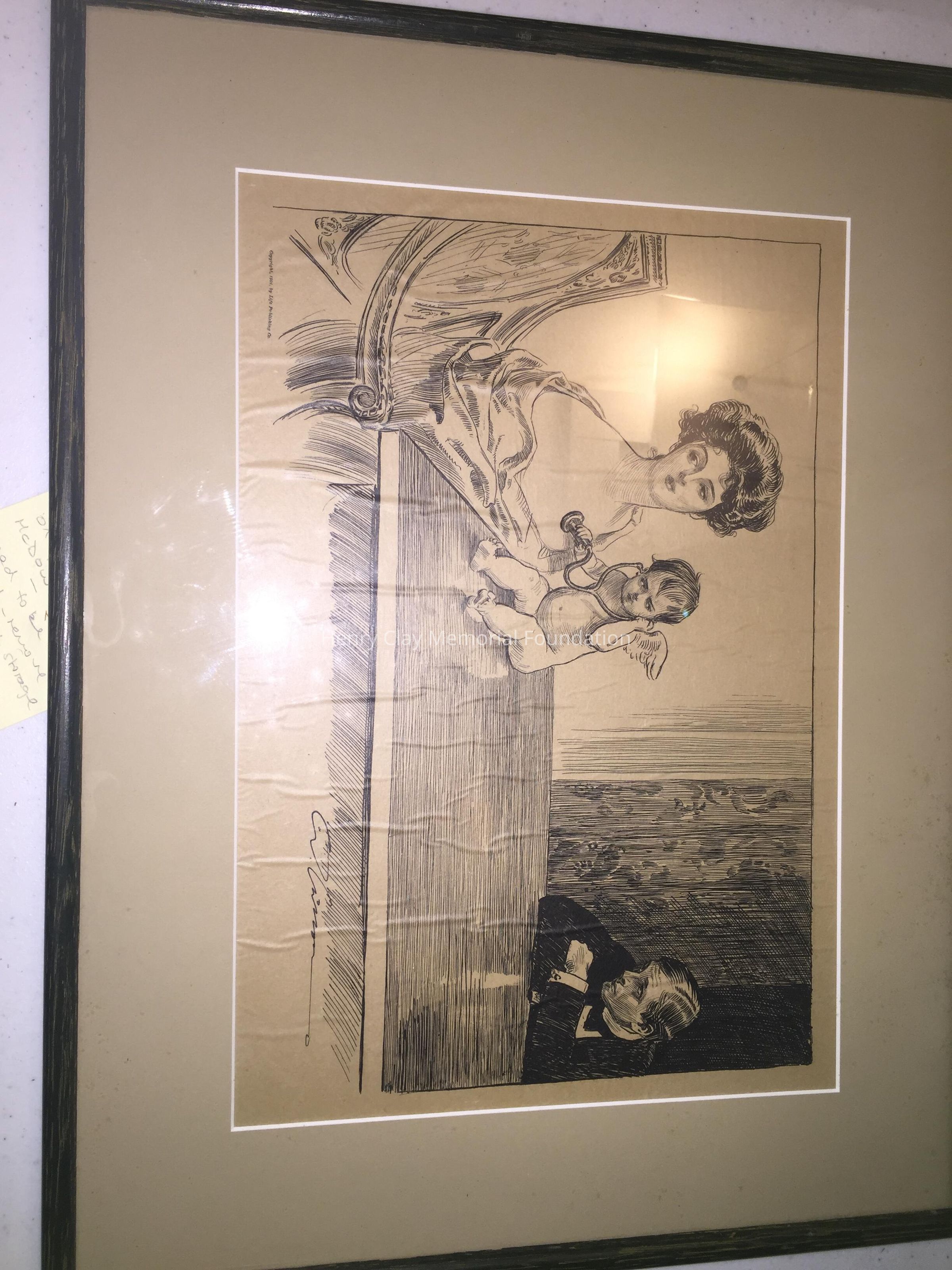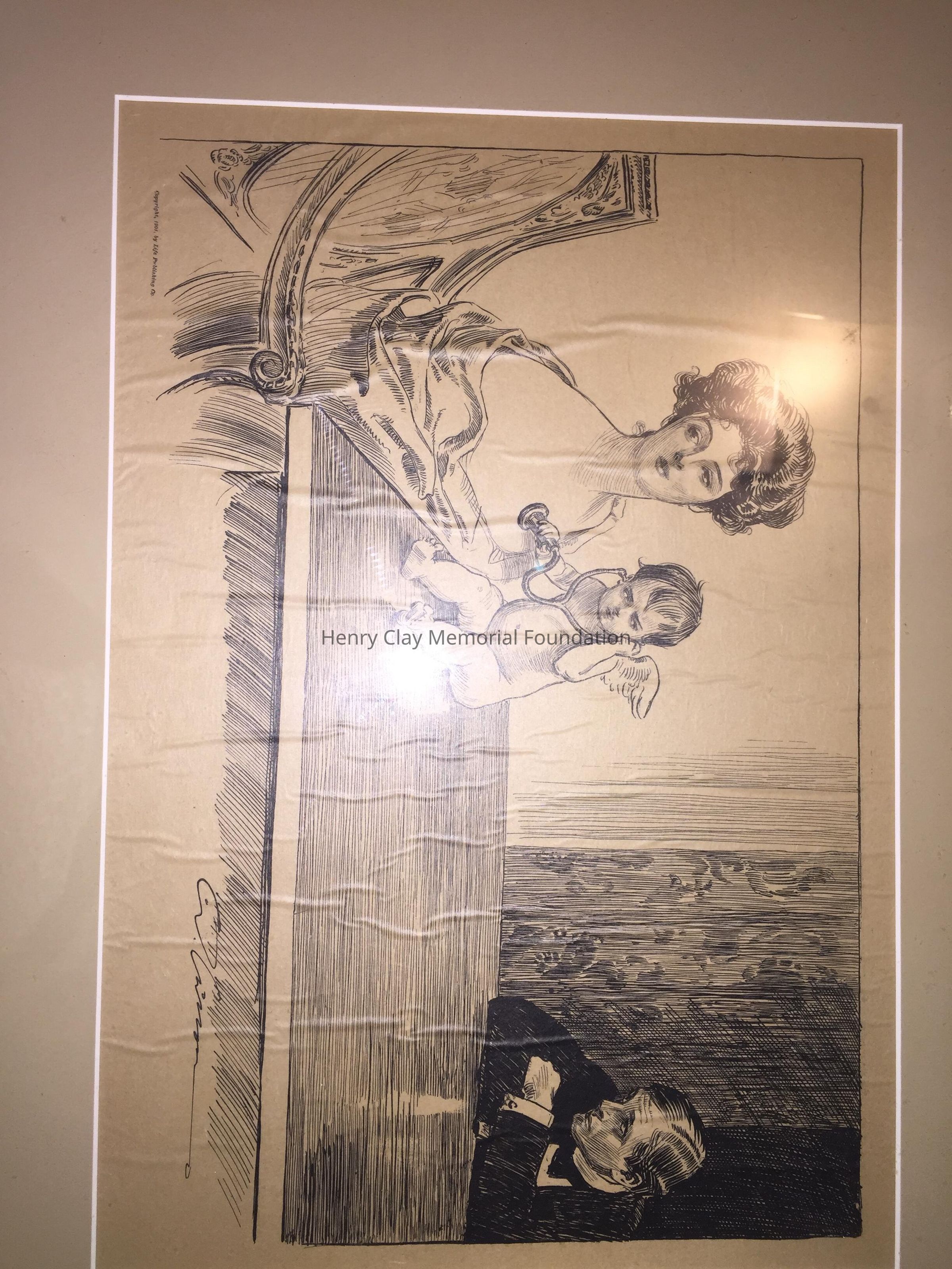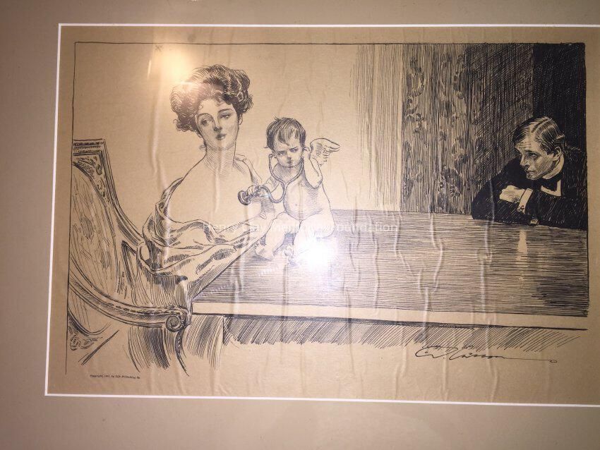 "Has she a Heart" (title?) Gibson girl printed depicting a man, cupid listening to a woman's heart. "Copyright 1901 by Life Publishing Co.", black and white.