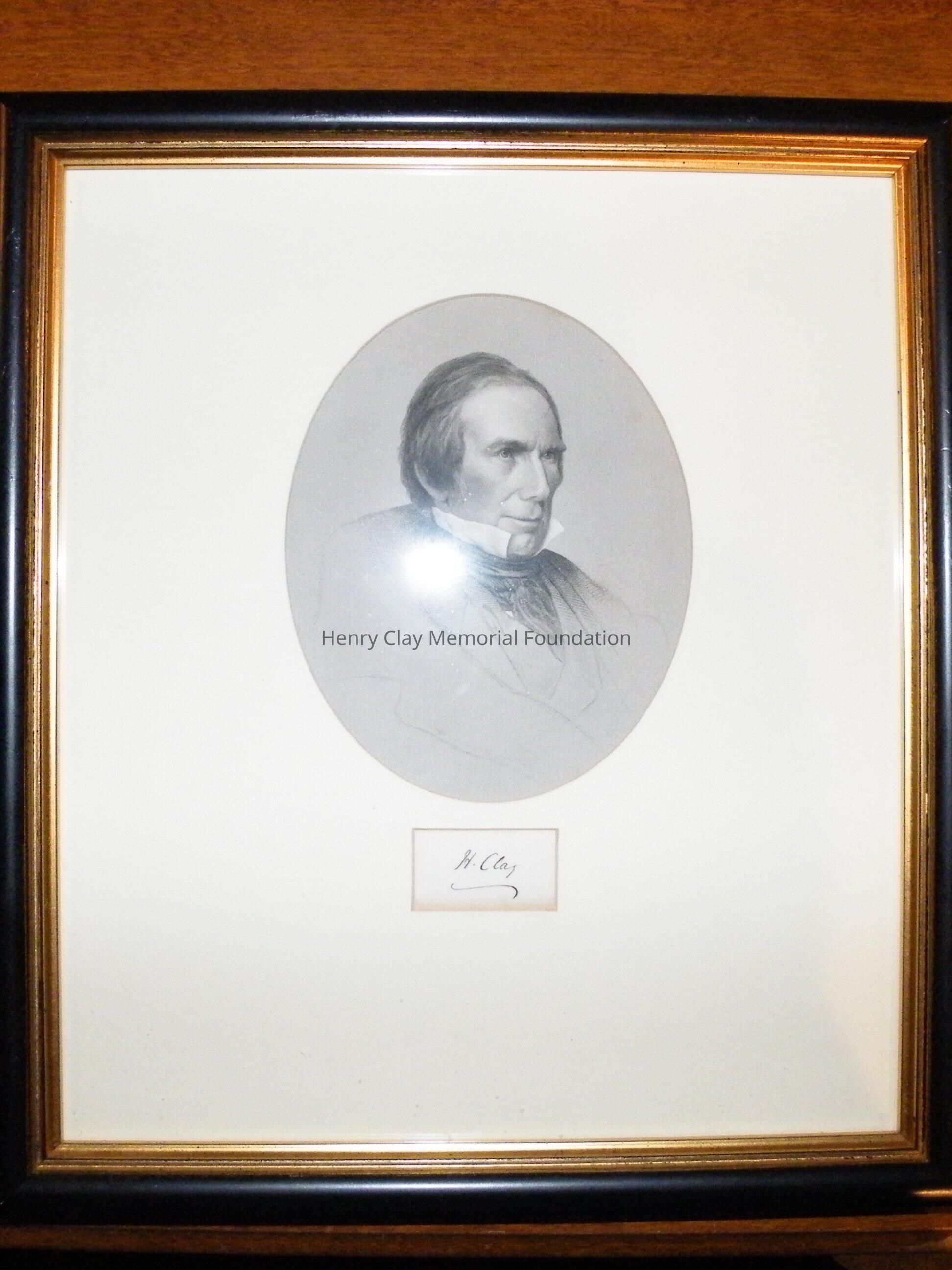 A print of Henry Clay. The print is a bust portrait of Clay facing right. He is in an overcoat, coat, white shirt, and cravat. The print is framed in a black frame with gold inner molding. The mat is cut with an oval opening for the portrait and a small rectangle for Clay's signature.