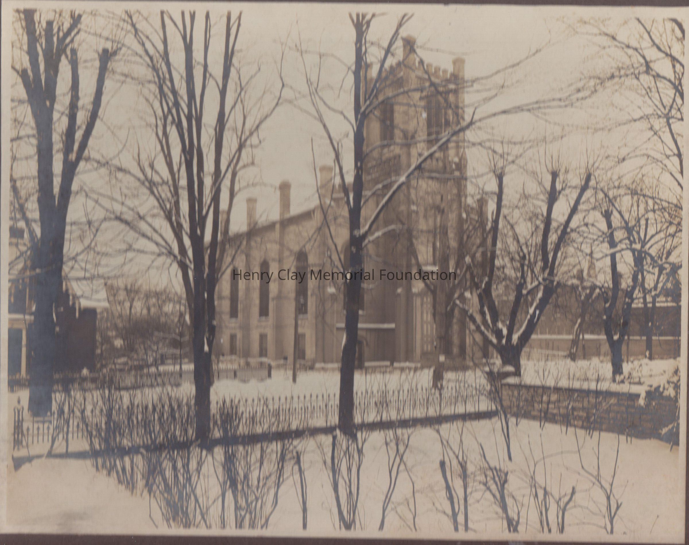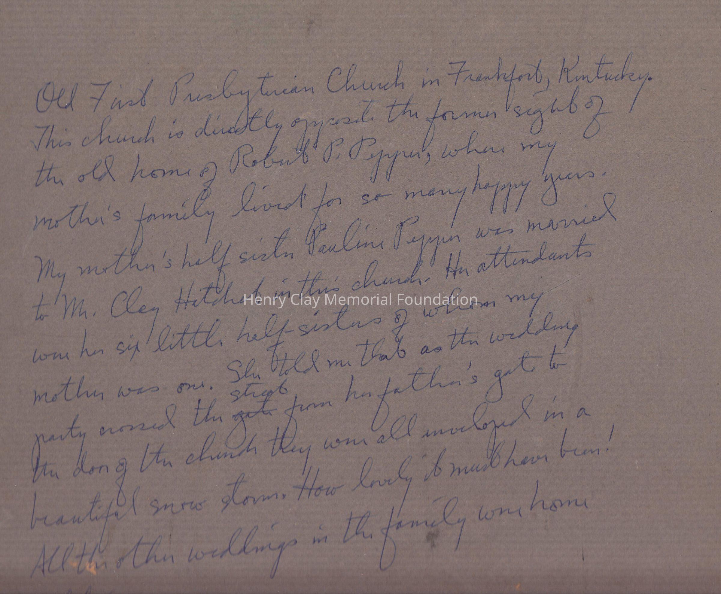 In the rear in pen " The Old Presbyterian Church in Frankfort, Kentucky. This church is directly opposite the former sight of the old home of Robert P.Pepper, when my mother's family lived for so many happy years. My mother's half sister Paulina Pepper was married to Mr. Clay Hatchet in the church. The attendants came with six little half-sisters of whom my mother was one. She told me that as the wedding party around the street from her father's gate to the door of the church they were all involved in a beautiful snow storm. How lovely it must have been. All the other weddings in the family were home wedding. E.C.B" . On top of the writing a note "January 1910".Dimensions