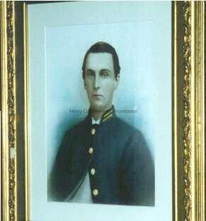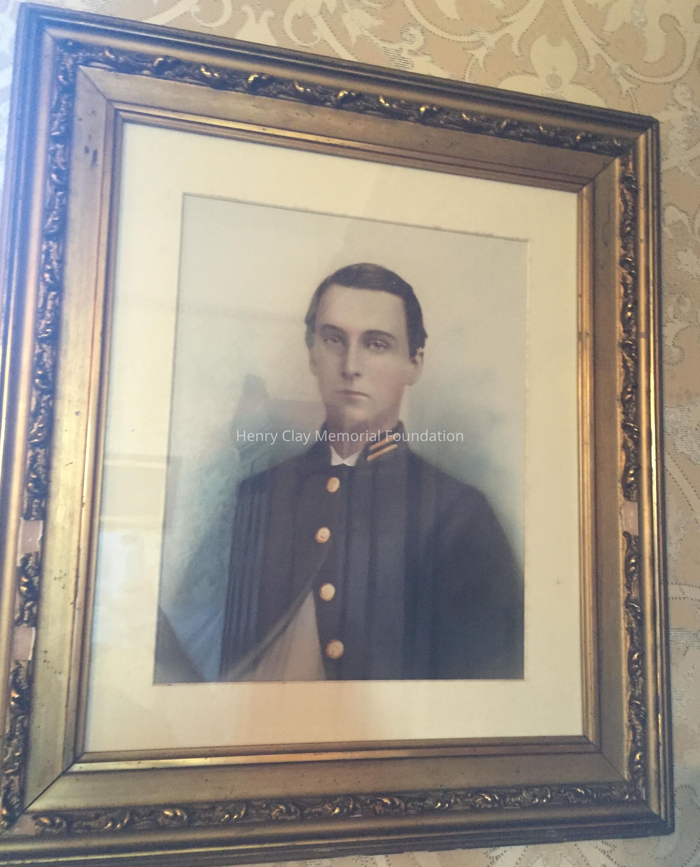 Shows subject (James B. Clay, Jr.) in blue Confederate uniform. Covered with glass. Framed in gilded frame with some ornamentation.