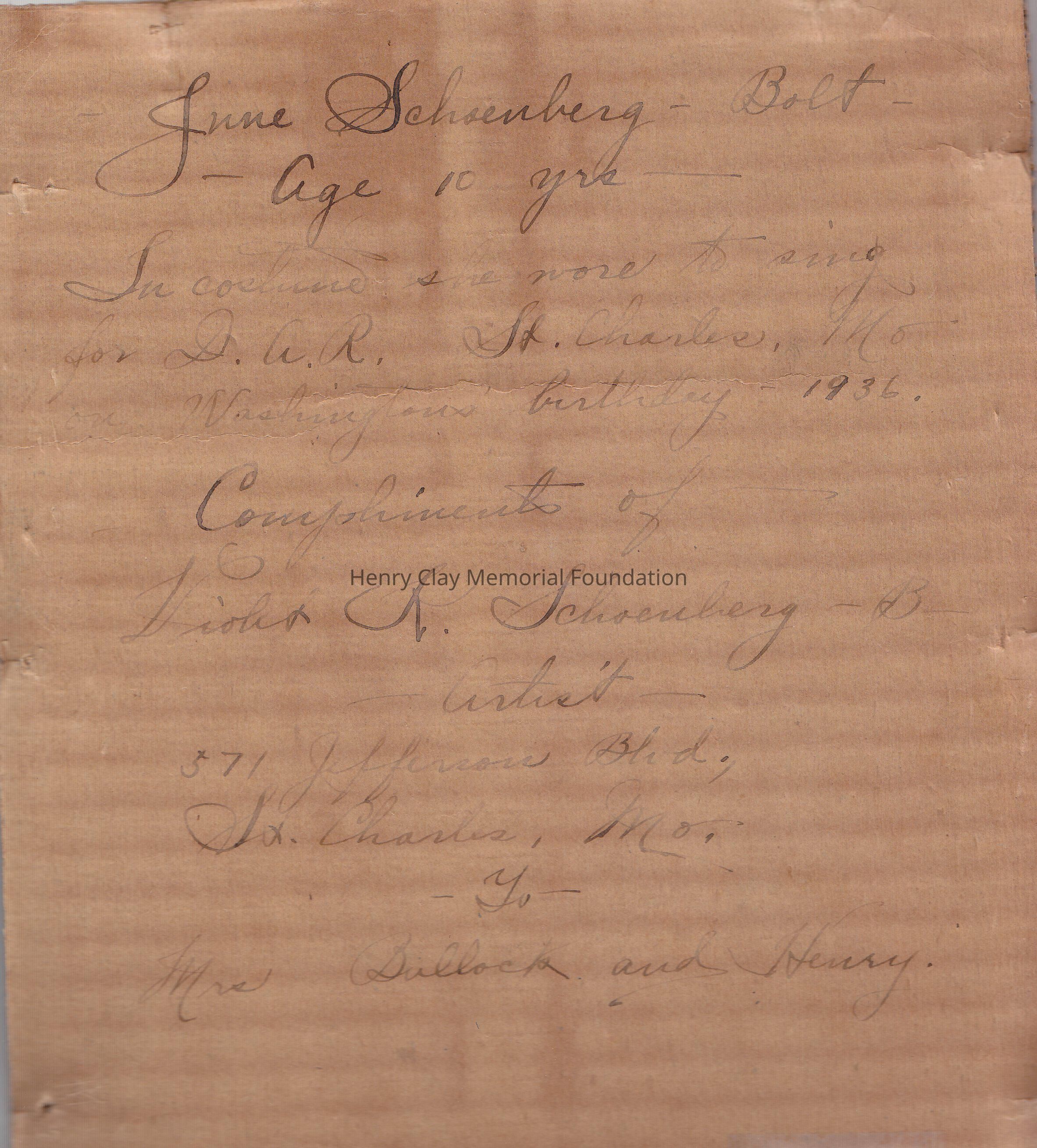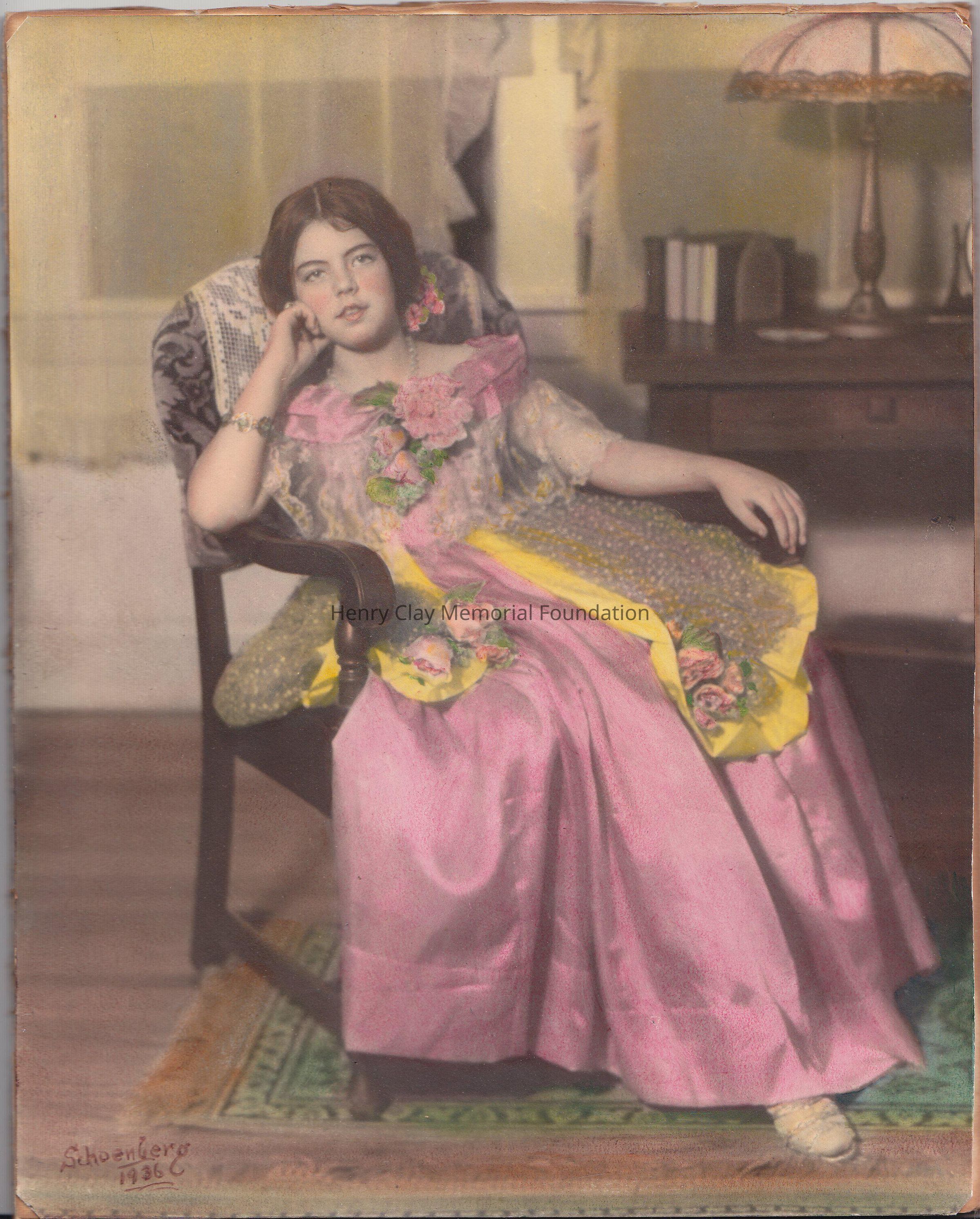 Photograph of a young women sitting in a chair. Vibrant pinks and yellows in her dress, in the left bottom corner handwritten in pen " Shoenberg 1936". In the rear of the photograph handwritten in pen " June Shoenberg Bolt age 10 years. Ju costume she wore to sing for D. A. R. St. Charles, Mo, on Washington's birthday 1936. Compliments of Violet R. Shoenberg B. Artist 571 Jefferson Blvd. St. Charles, MO. To Mrs. Bullock and Henry"