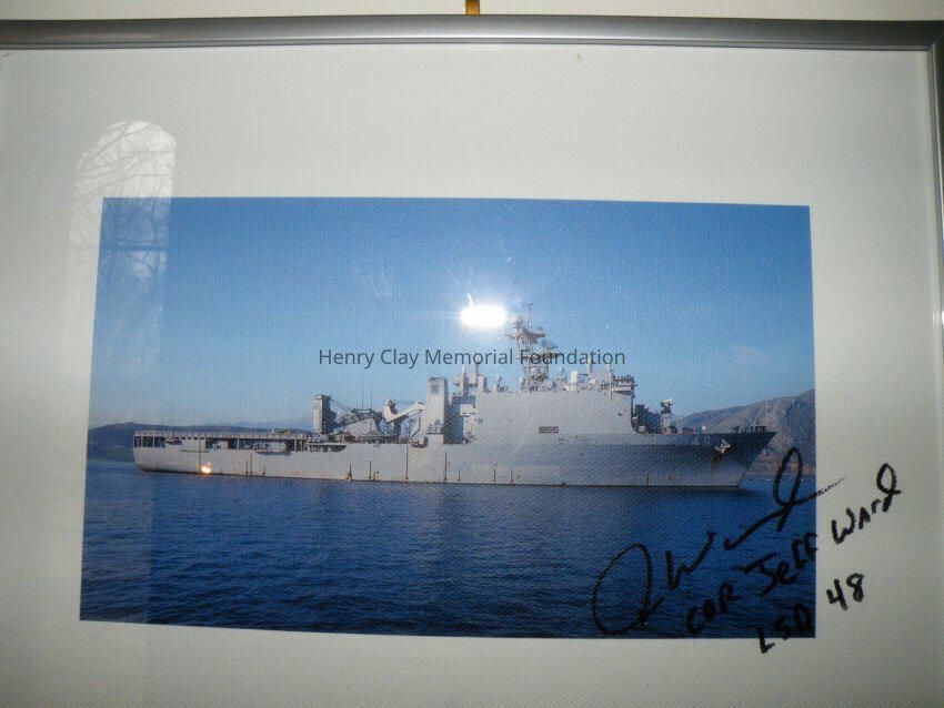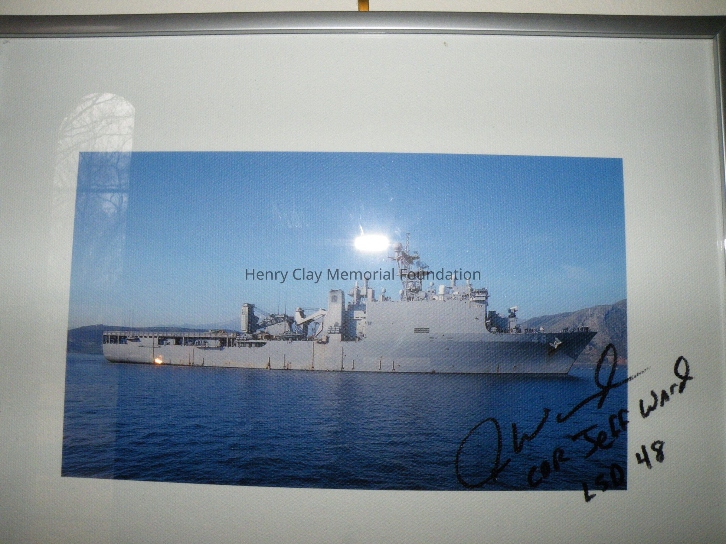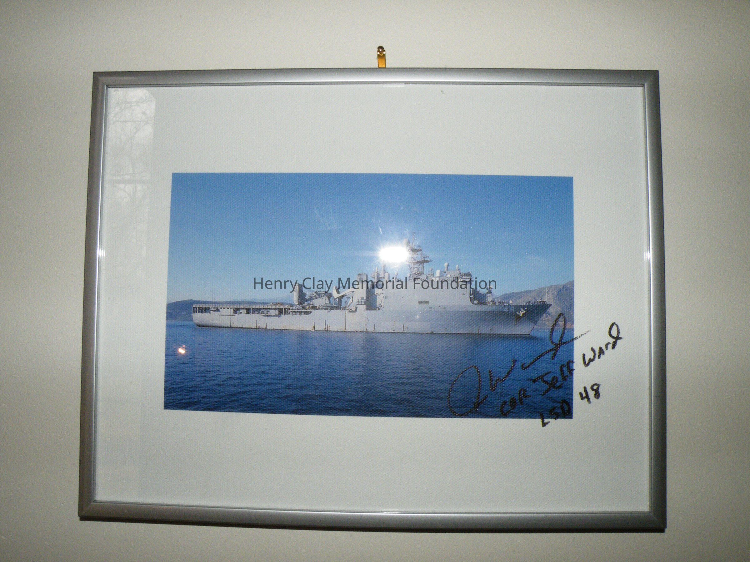 One photo of USS Ashland LSD-48 Framed. The frame is silver and rectangular. The photo is centered within a thick white border between the frame and the actual colored picture. The colored picture shows the USS Ashland LSD-48 on the water with a elevated landscape int he background of what could be mountains. The front of the photo has a signature that appears to say "J Ward" and under it "Cor Jeff Ward LSD 48" in black ink (maybe sharpie). The back of the frame has a note attached that says the following: "070430-N-0780F-001 SOUDA BAY, Crete (April 30, 2017) - Whidbey Island-class dock landing ship USS Ashland (LSD 48) arrives in Souda harbor for a routine port visit. Ashland is homeported at Navy Amphibious Base Little Creek, Va., and is an amphibious warfare ship designed to transport Marines and their combat gear throughout the world and then to launch and support assault landing craft and helicopters during amphibious operations against hostile shores. U.S. Navy photo by Mr. Paul Farley (RELEASED)".Dimensions
