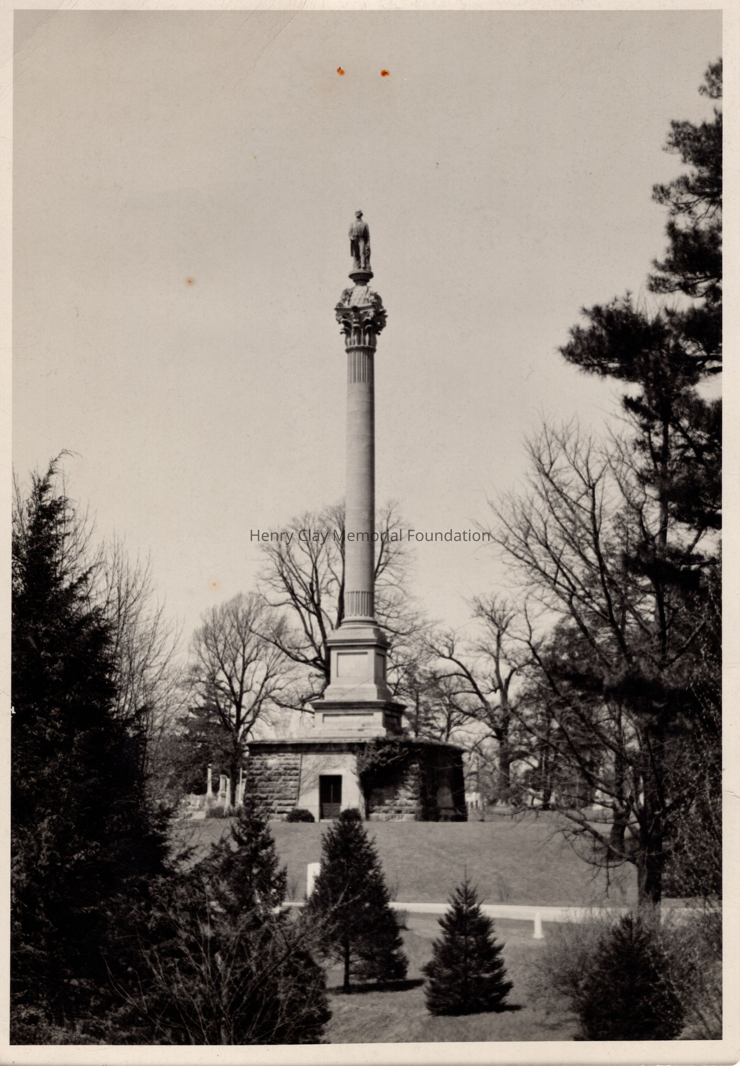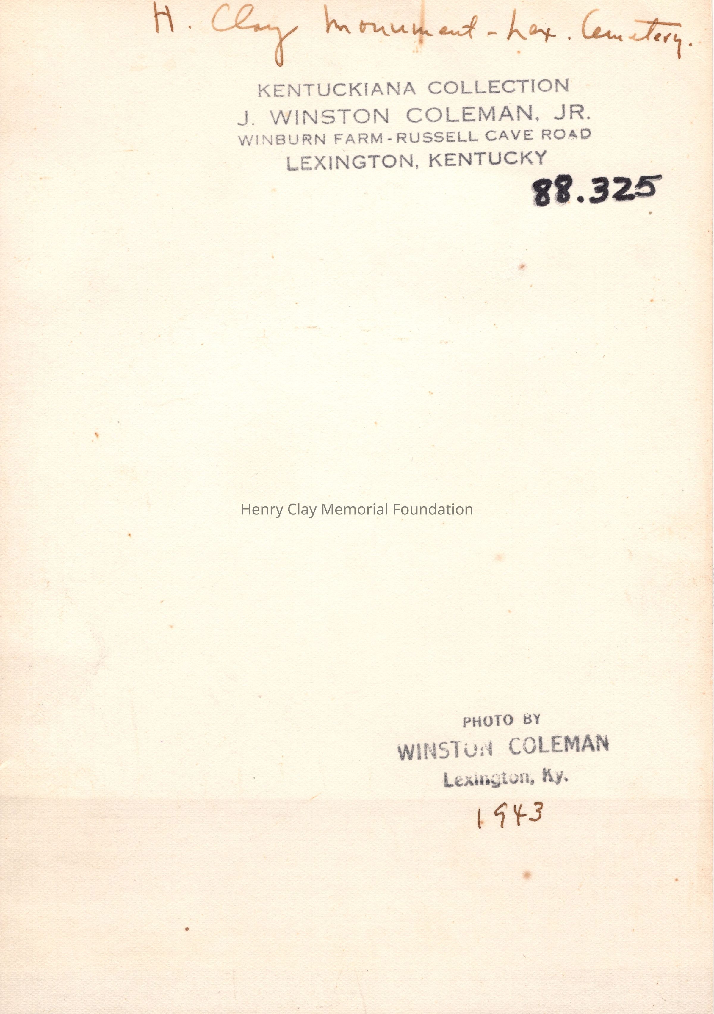 Photograph of the Henry Clay Monument in Lexington Cemetary. Stamped on back: "Kentuckiana Collection / J. Winston Coleman, Jr. / Winburn Farm-Russel Cave Road / Lexington, Kentucky", and "Photo by / Winston Coleman / Leington, KY. / 1943"