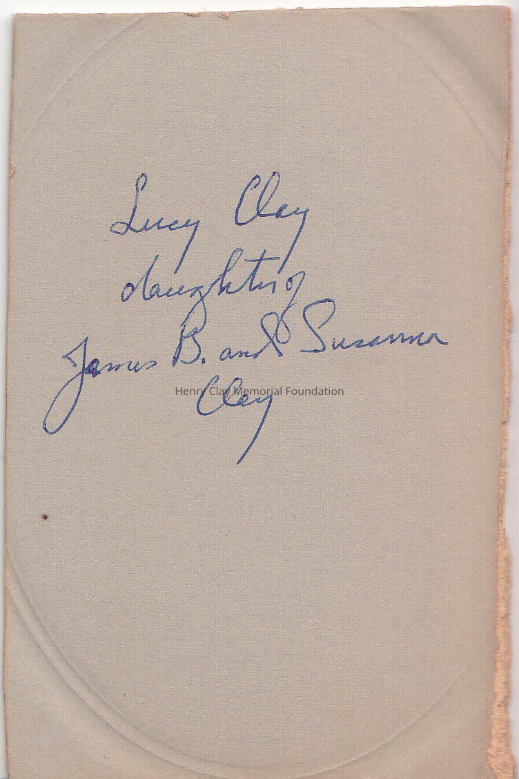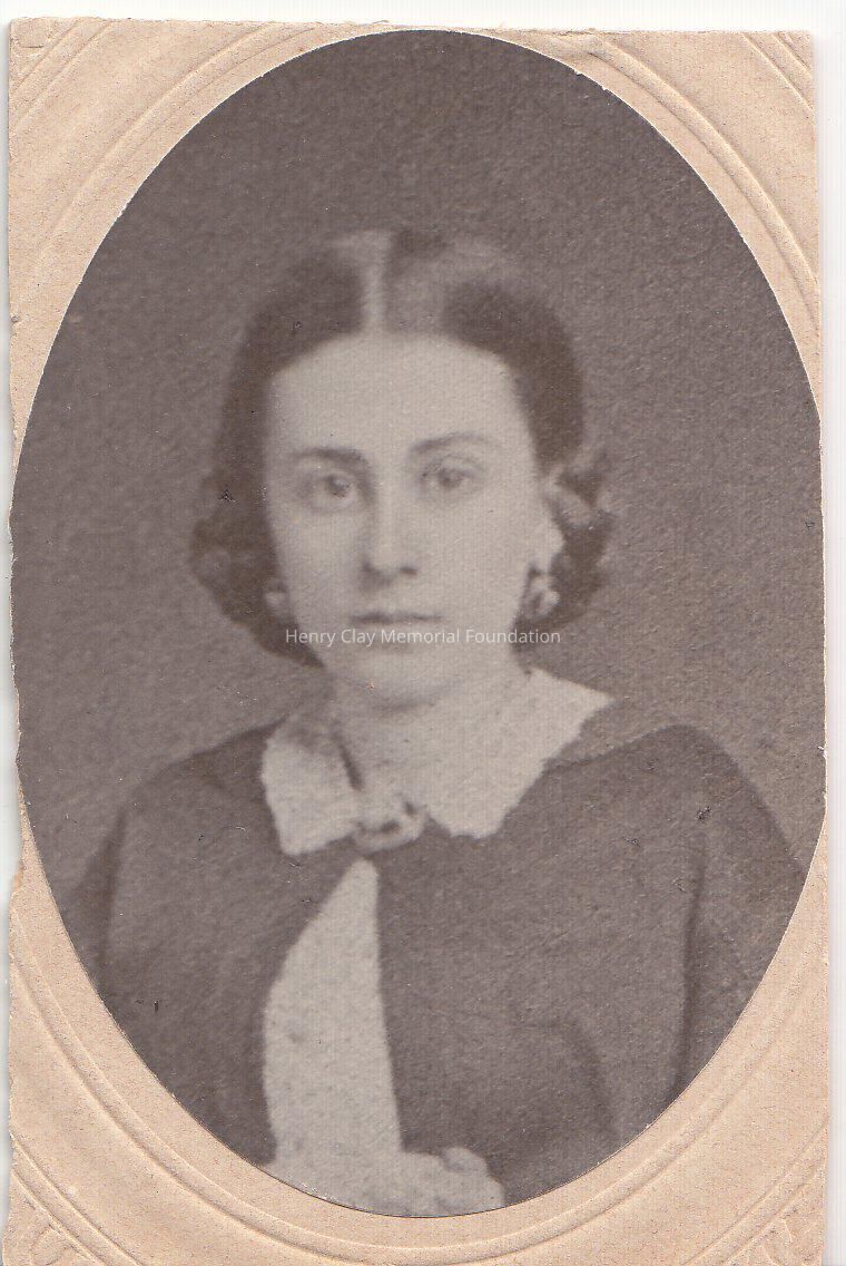 An oval portrait photograph of Lucy Clay. It was off from a paper frame. In the rear in pen " Lucy Clay daughter of James B. Clay and Susanna Clay".