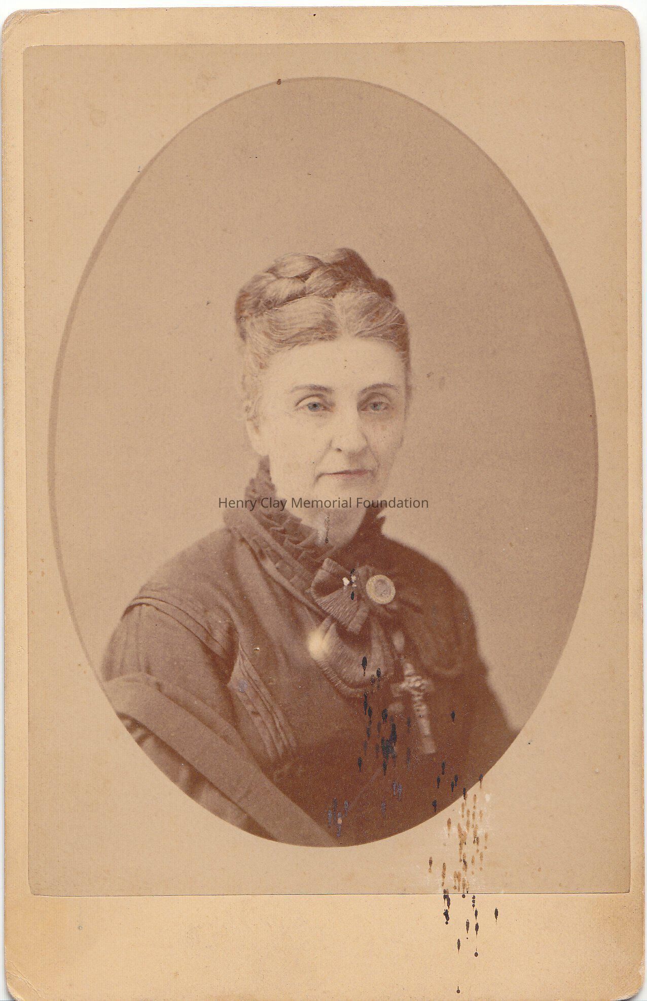 A photograph of Susan Jacob Clay, wife of James B. Clay. The photograph has some color. Her eyes are blue, her lips are pink. She is wearing a dark dress with a big bow in front, and a big cross. In the middle of bow there is someting that shine in gold.