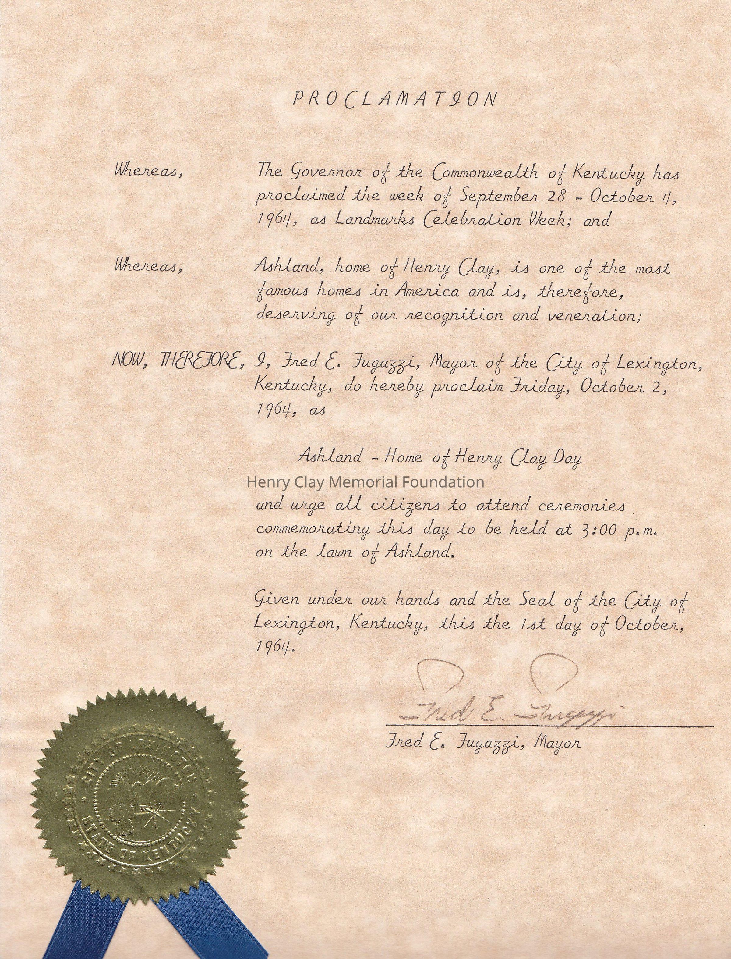 Proclamation. 1964 the mayor of the City of Lexington, Fred E.Fugazzi proclaime Friday October 2 1964 Ashland, Home of Henry Clay Day. Signed by the mayor, and a gold sticker ribbon "City of Lexington State of Kentucky" can be found at the bottom.