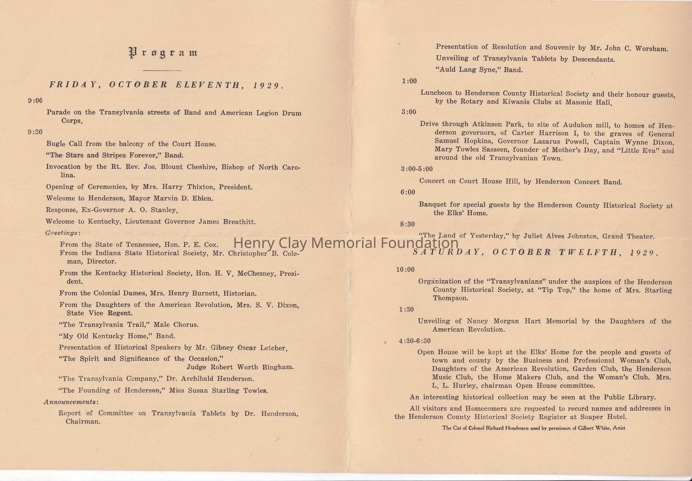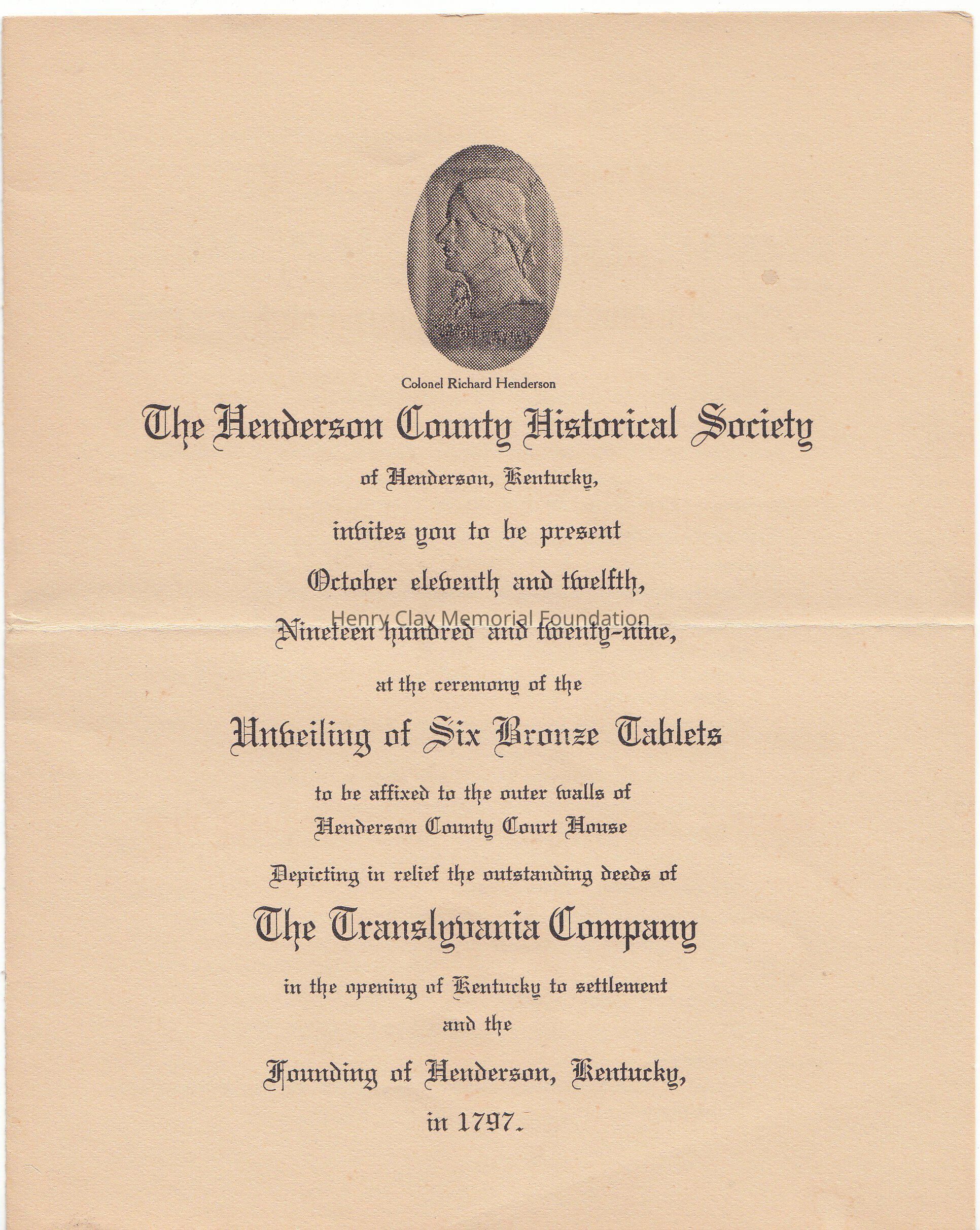 A program from the Henderson Historical Society of Henderson, Kentucky inviting you to be present October 11, and 12, 1929 at the Ceremony of the Unveiling of Six Bronze Tablets to be affixed to the outer walls of Henderson County Court House Depicting in relief the outstanding needs of The Transylvania Company in the opening of Kentucky to settlement and the Founding of Henderson, Kentucky in 1797. Inside the program highlighting the acrtivities for the 2 days.