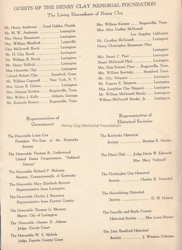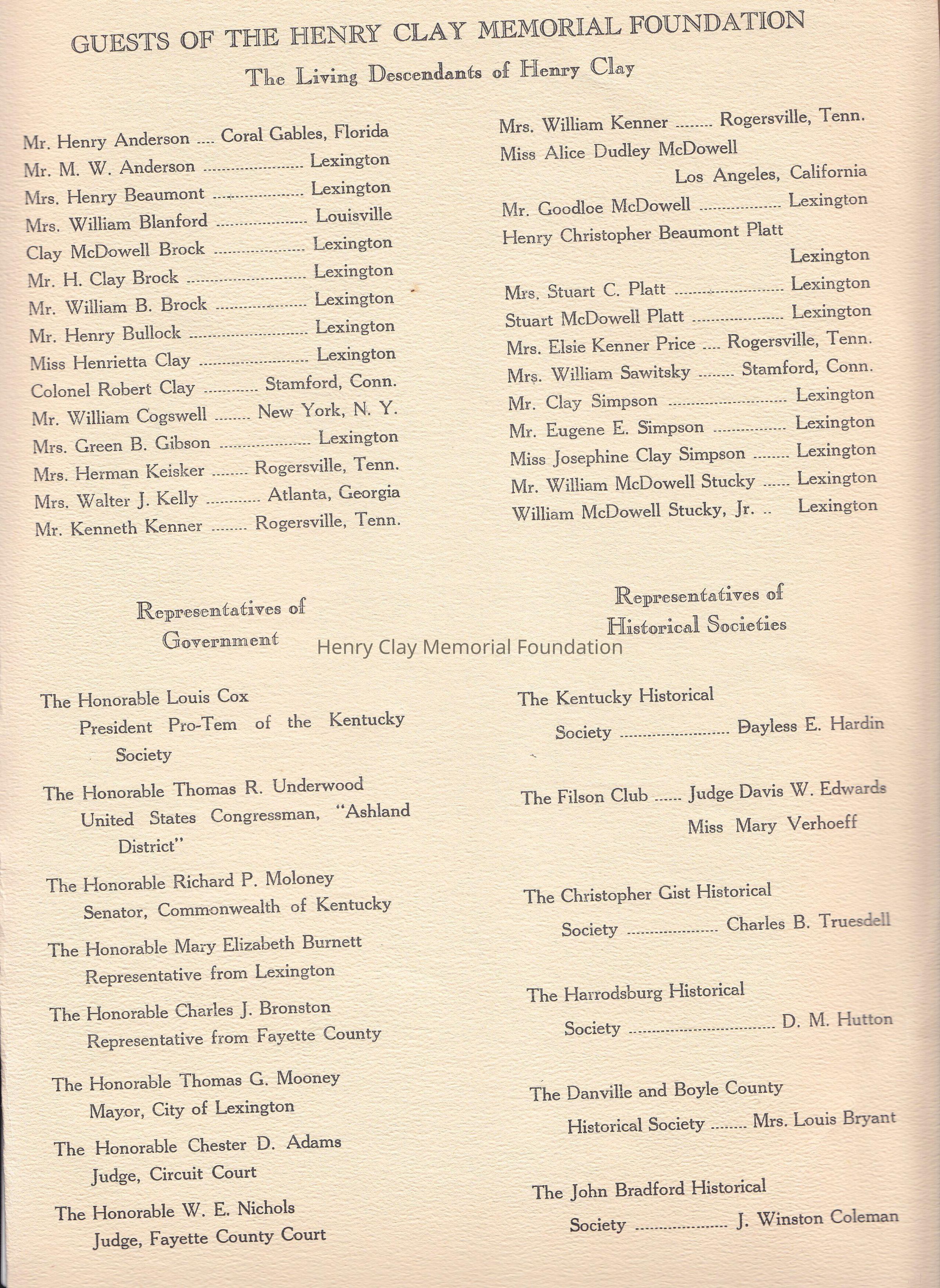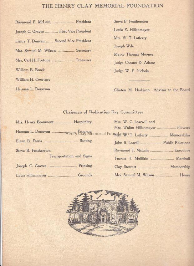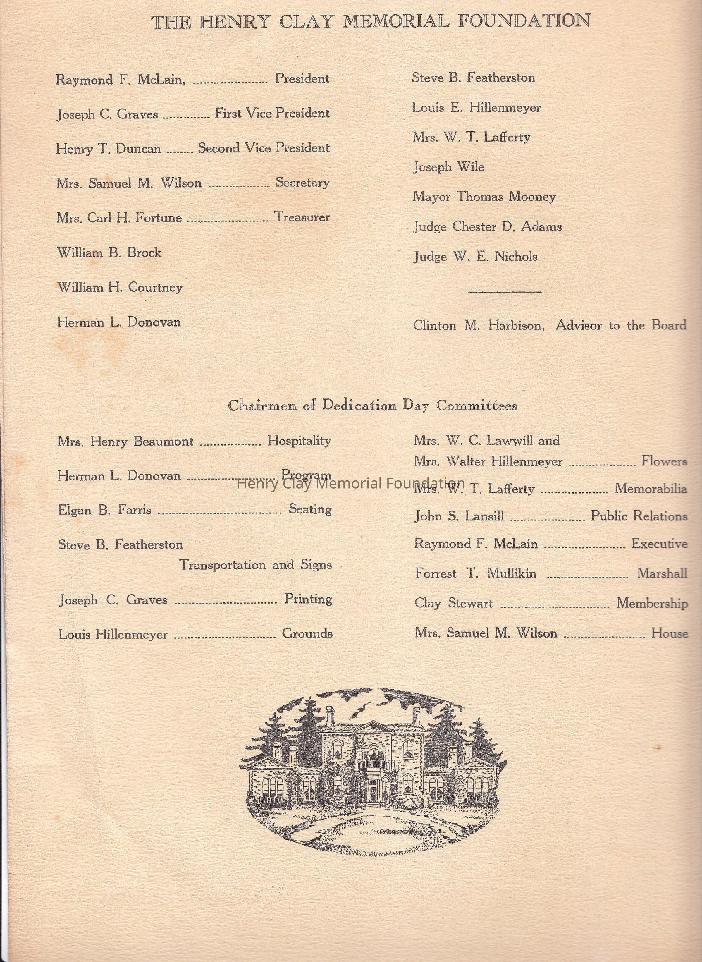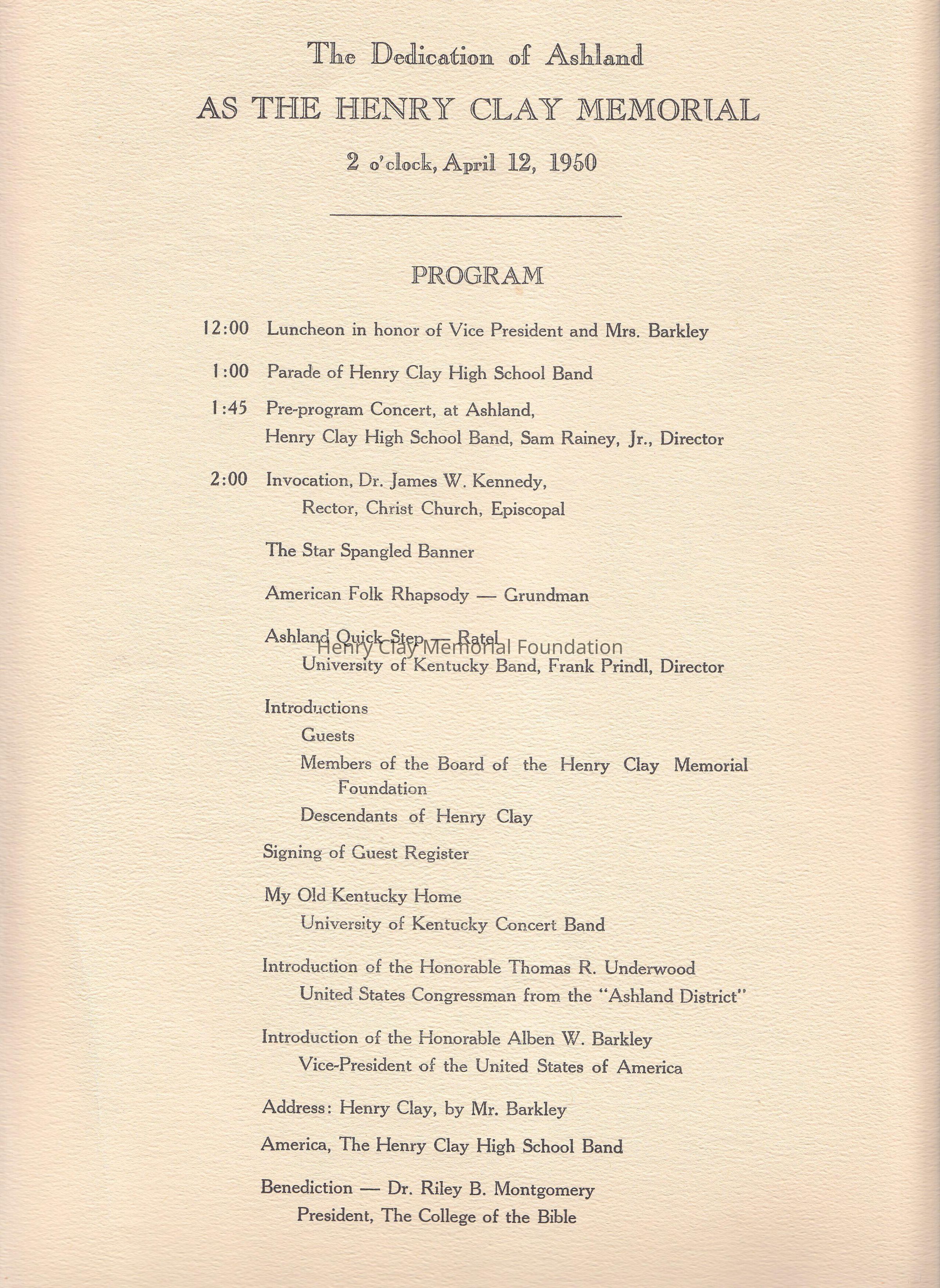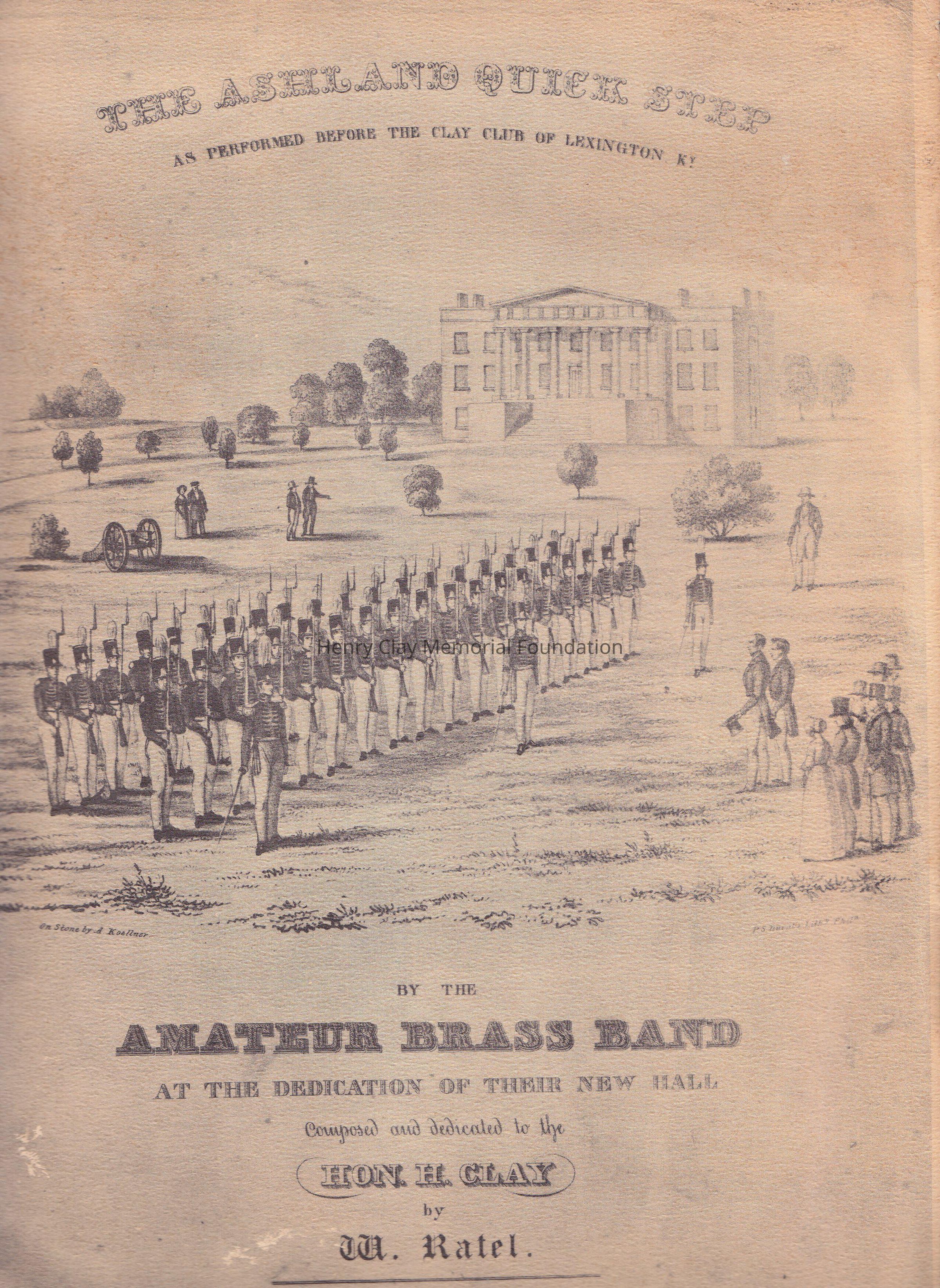 6 identical programs to "The Ashland Quick Setep" as performed before the Clay Club of Lexington, Ky by the Amateur Brass Band at the Dedication of their New Hall. Composed and dedicated to Hon. H.Clay by Ratel. The program include all the events happening from 12:00 to 2:00 pm. The Guests (Living descendant of Henry Clay), the Representatives of Governments, and the Representatives of Historical Societies. Last page has the Members of Board of Managers The Henry Clay memorial Foundation, the Chairman of Dedication Day Committees.