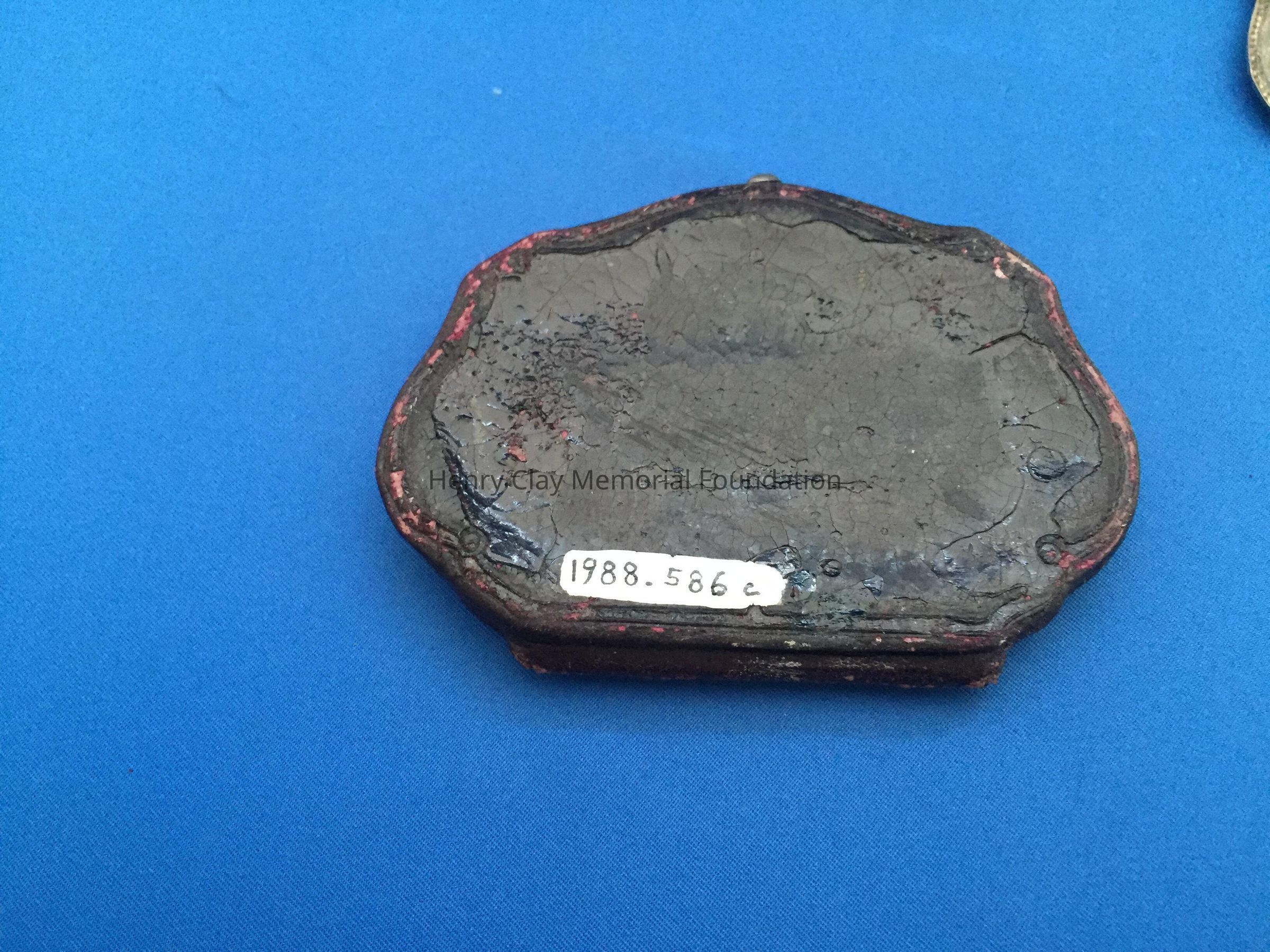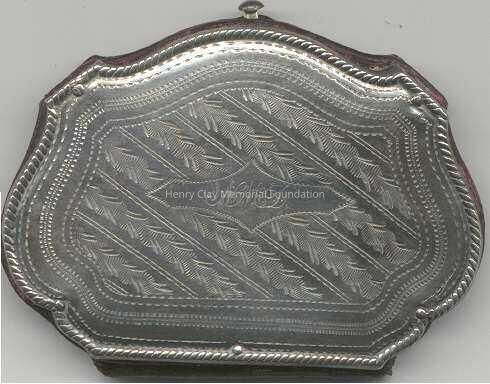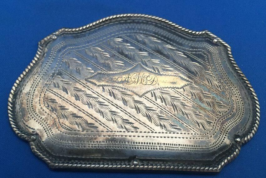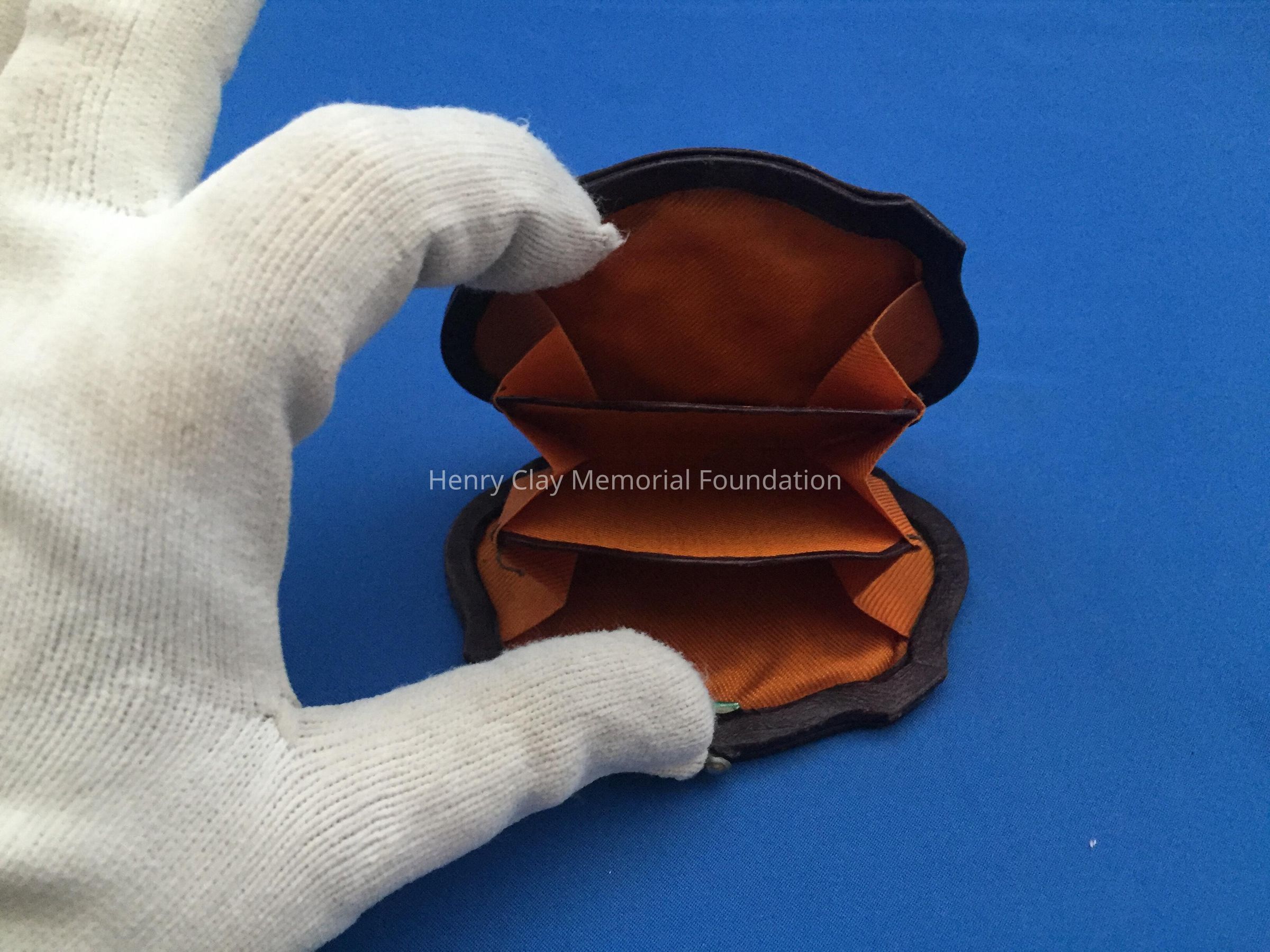 Dark maroon leather coin purse with decorative, incised silver plates on the sides. One has a cartouche on it with the intials, "NMcD". The purse has a metal, push-button clasp that opens to expose three compartments divided accordian style that are lined with orange fabric.