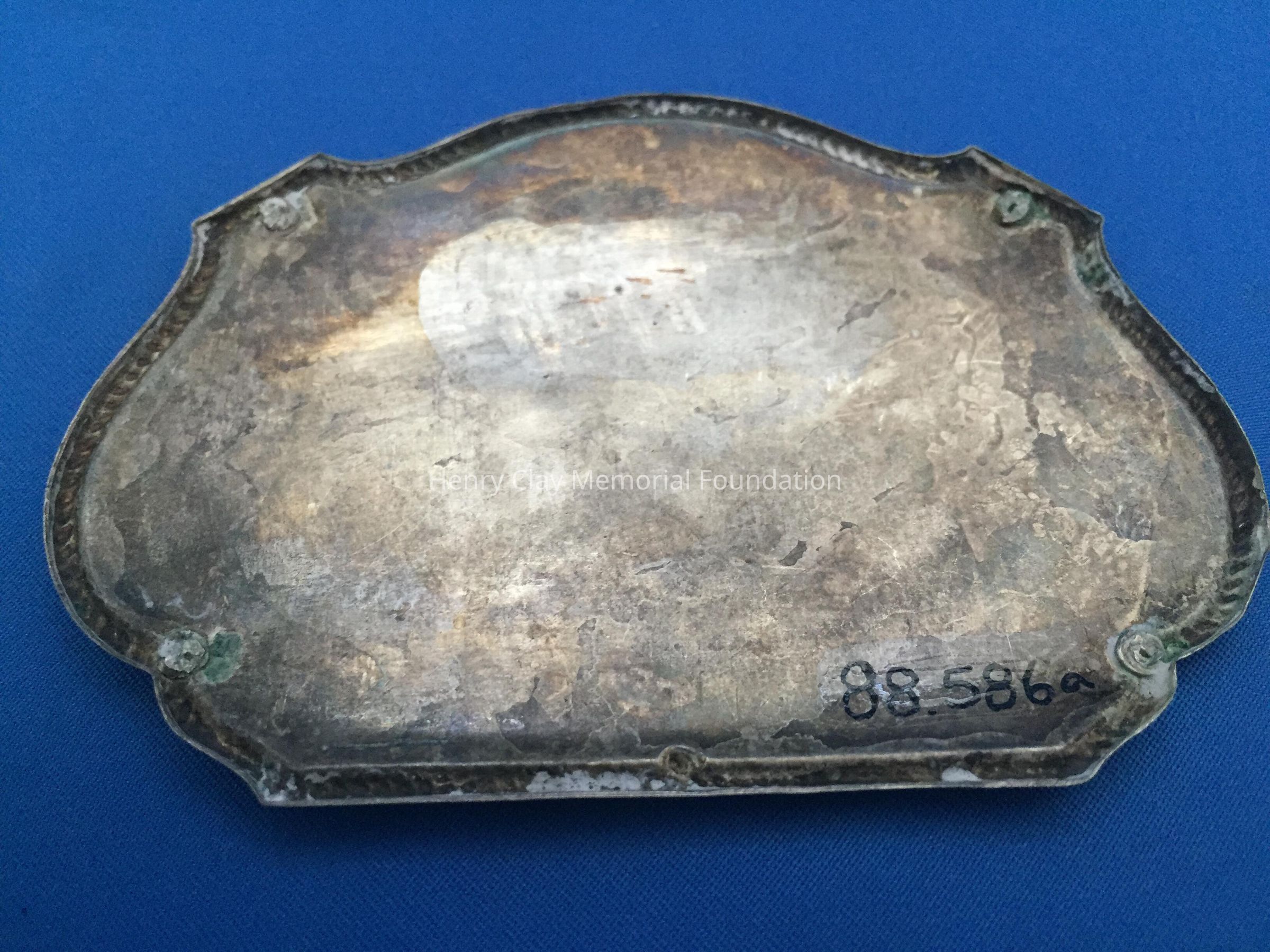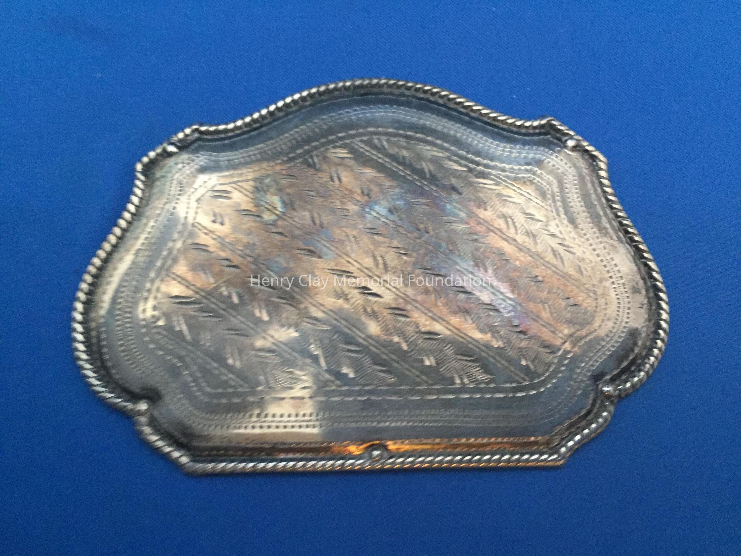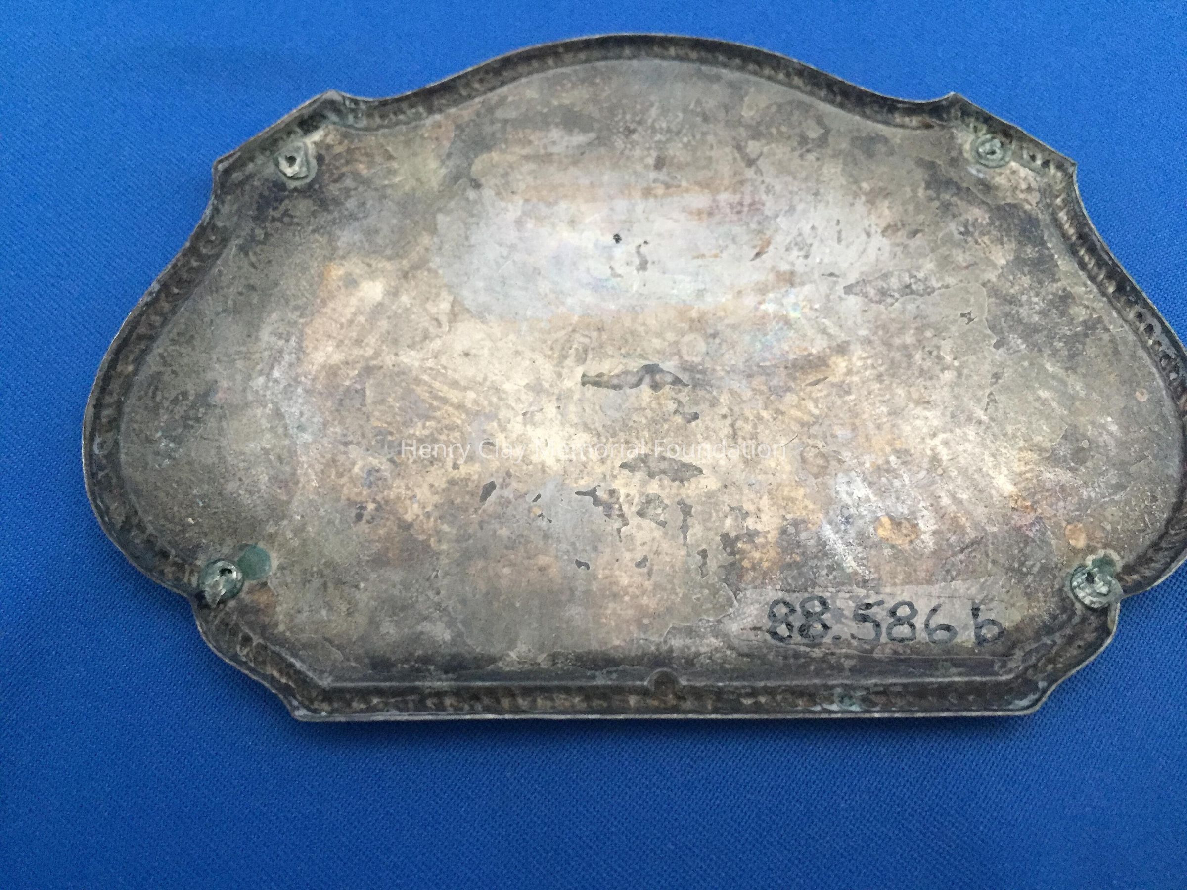Dark maroon leather coin purse with decorative, incised silver plates on the sides. One has a cartouche on it with the intials, "NMcD". The purse has a metal, push-button clasp that opens to expose three compartments divided accordian style that are lined with orange fabric.
