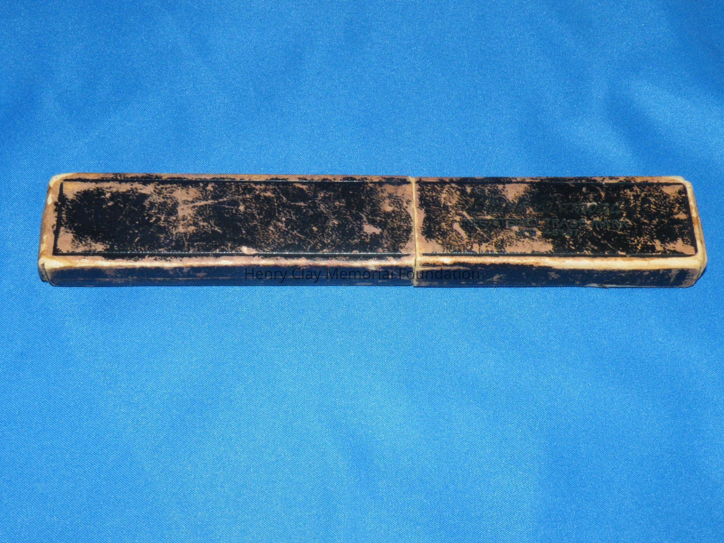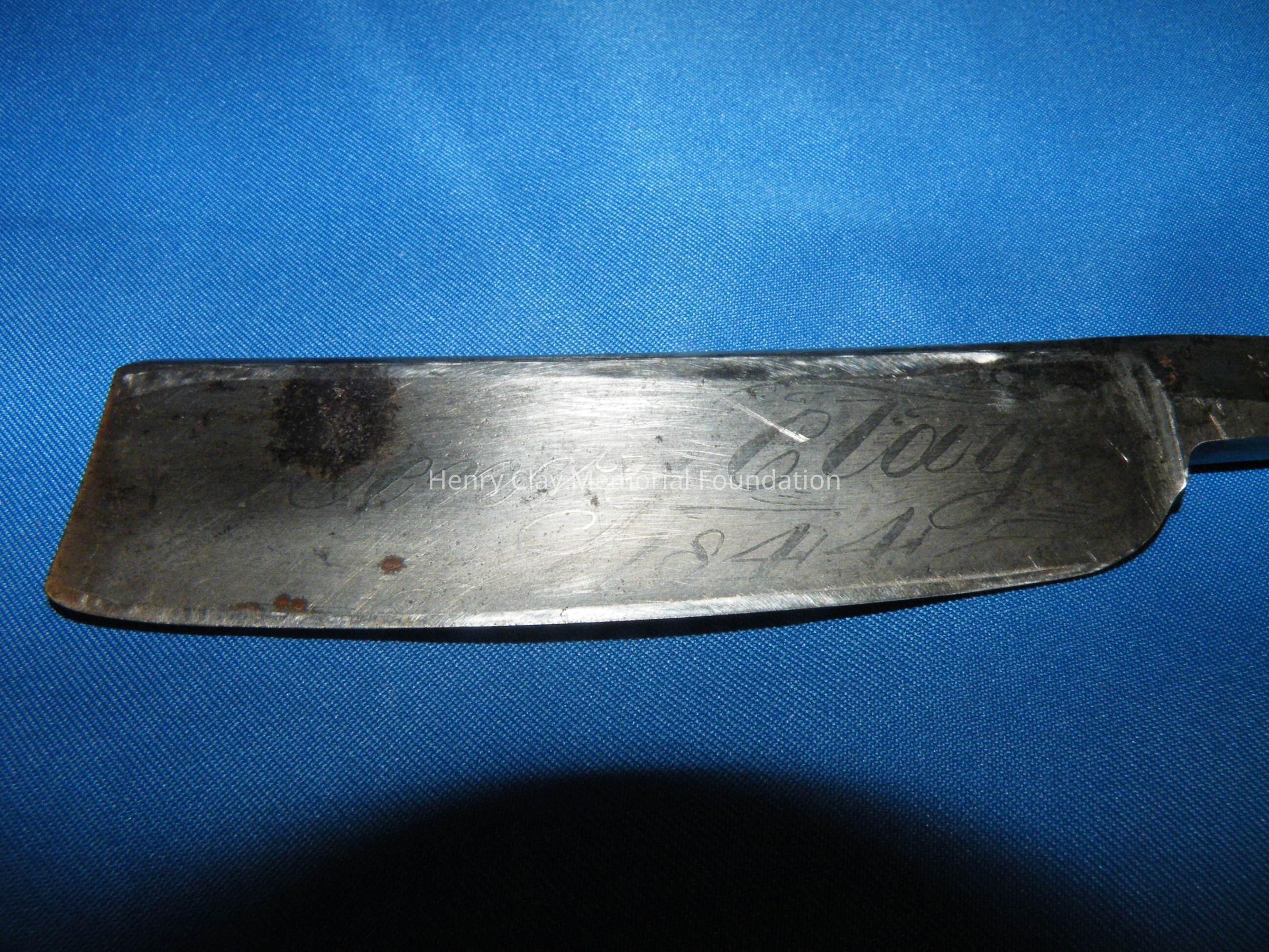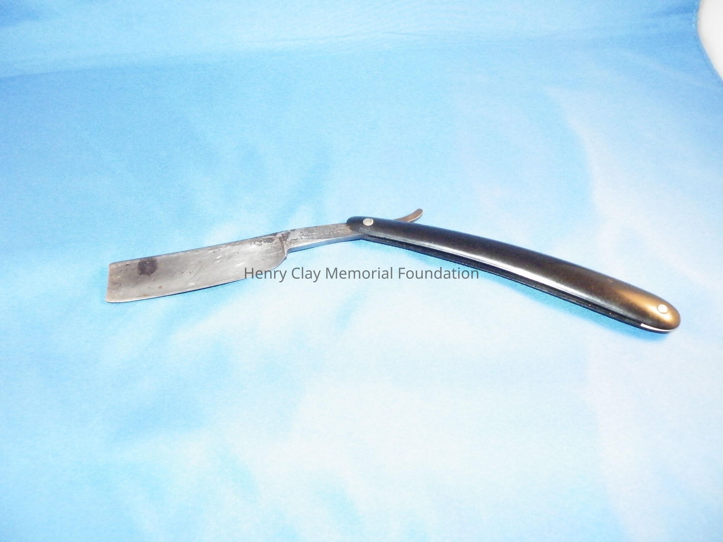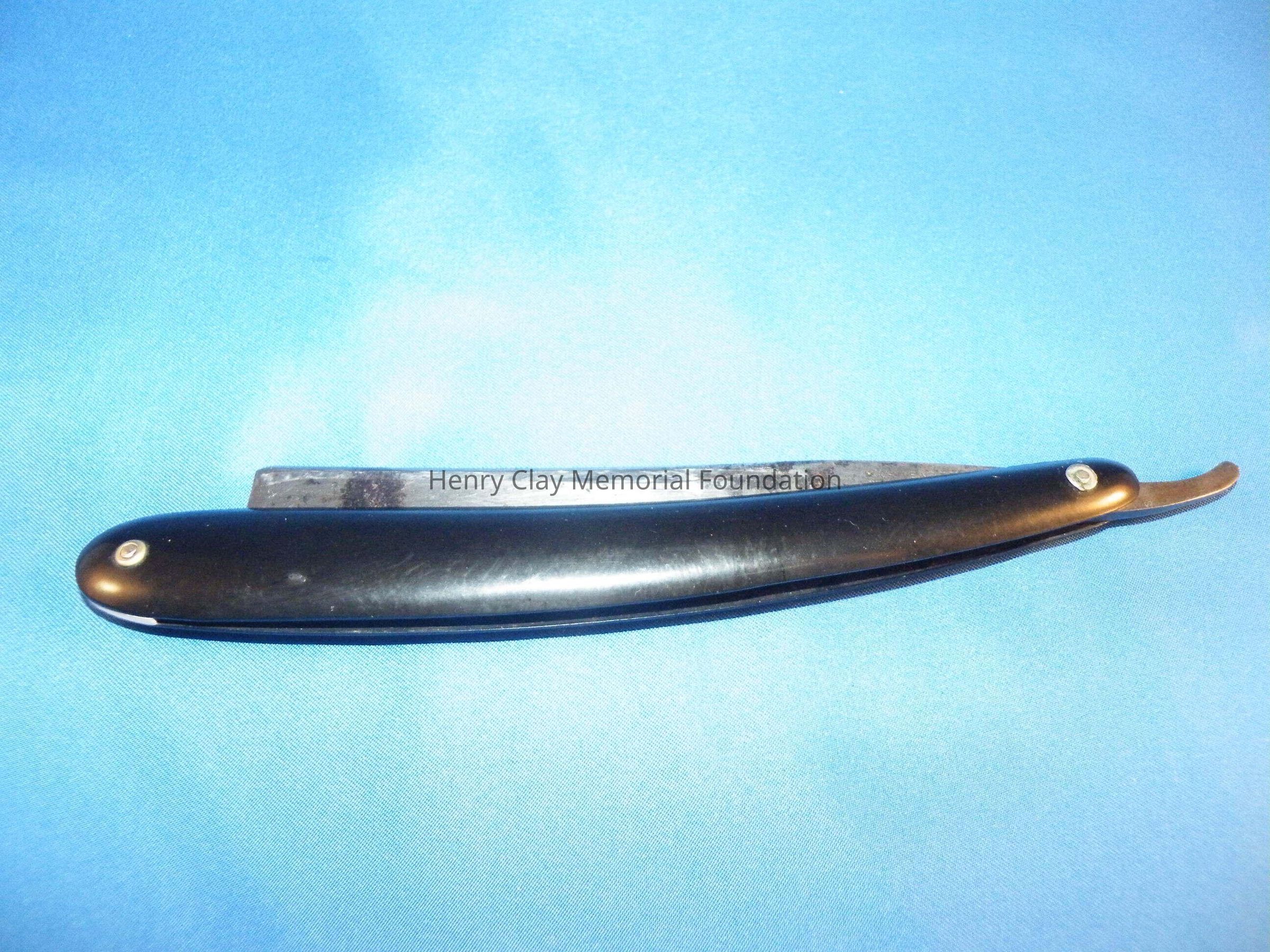 A straight razor with metal blade and black handle/case. The blade is rectangular and has an arm that ends in a thumb piece used to open the razor. The blade is engraved: "Henry Clay 1844." The case is made of a black thermoplastic material. The two sides and the blade are held together with brass rivets. The blade is stamped: "MANUFACTURED BY W. GREAVES AND SONS SHEAF WORKS." The razor is stored in a black cardboard box that was made for another razor.