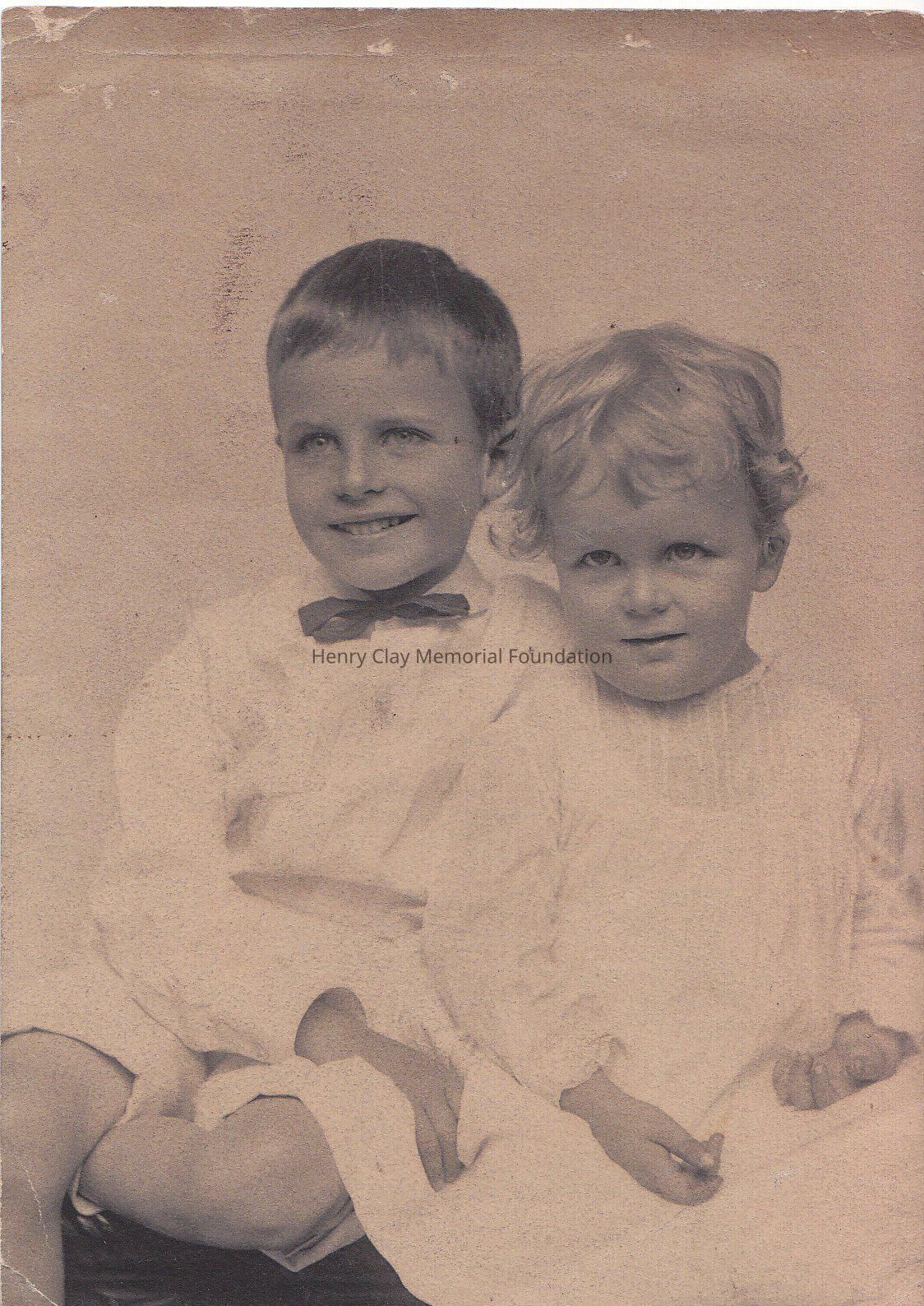 Reprint of a picture depicting two children. One is a little boy wearing a white shirt with white shorts, and a blue bow tie. The other one is younger, possibly a boy as well wearing a white dress.Dimensions