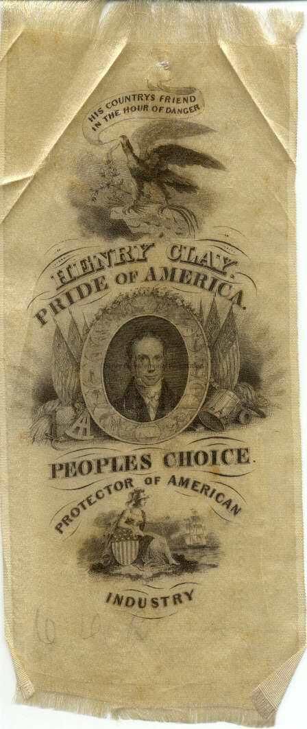 Cream-colored silk ribbon, printed with an eagle at the top, Clay in an oval in the middle flanked by flags drums, etc., and a Roman or Greek figure at the bottom. The eagle is holding a banner in its mouth that reads, "HIS CONTRY'S FRIEND / IN THE HOUR OF DANGER." Also printed in large block letters, "HENRY CLAY. / PRIDE OF AMERICA. / PEOPLE'S CHOICE. / PROTECTOR OF AMERICAN / INDUSTRY." There are indecepherable initials written on the bottom front of the ribbon in pencil and what looks like the word, "commendable" written upside-down in pencil on the lower back.