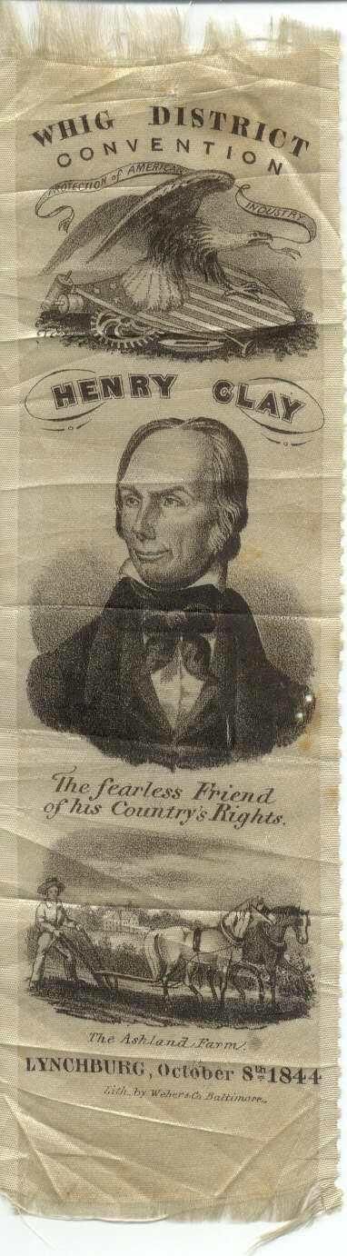 Thin silk ribbon printed with image of an eagle standing on a shield at the top, Clay in the center, and two horses pulling a plow with a farmer in tow at the bottom and a house in the background, identified beneath as "The Ashland Farm." At the top of the ribbon is, "WHIG DISTRICT / CONVENTION." The eagle is holding a banner in its mouth that reads "Protection of American Industry." Inscribed on remainder of ribbon, "HENRY CLAY /The fearless Friend of his Country's Rights /LYNCHBURG, October 8th 1844/ Lith. by Weber and Co. Baltimore."
