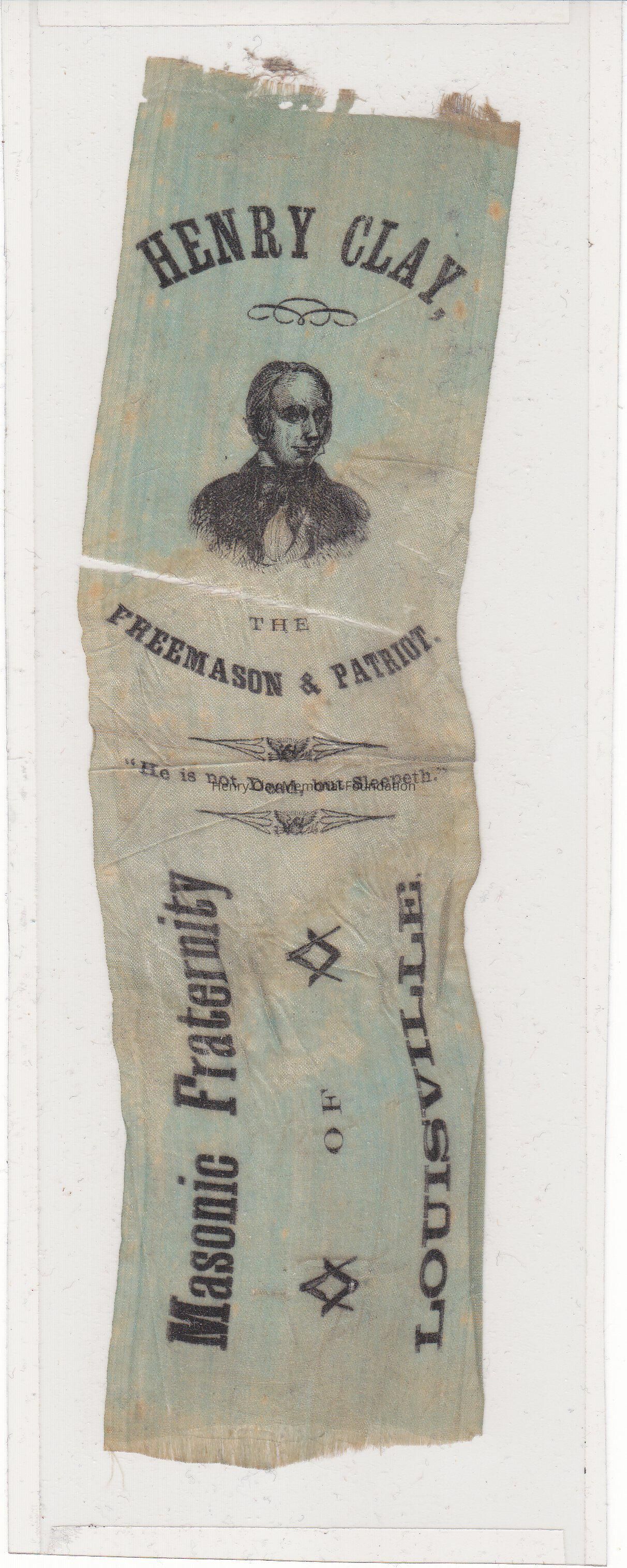 A pale blue silk ribbon. At the top is the name "Henry Clay" above a bust of Clay. Beneath the image of Clay it reads: "The Freemason and the Patriot." In the middle is the quote: "He is not dead but sleepeth." At the bottom the ribbon reads "Masonic Fraternity of Louisville" and there are two sets of squares and compasses.Dimensions