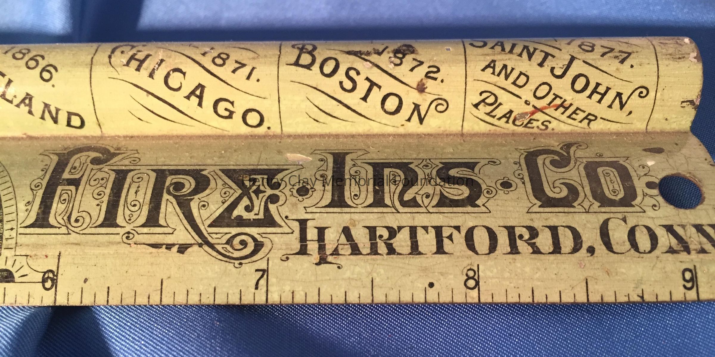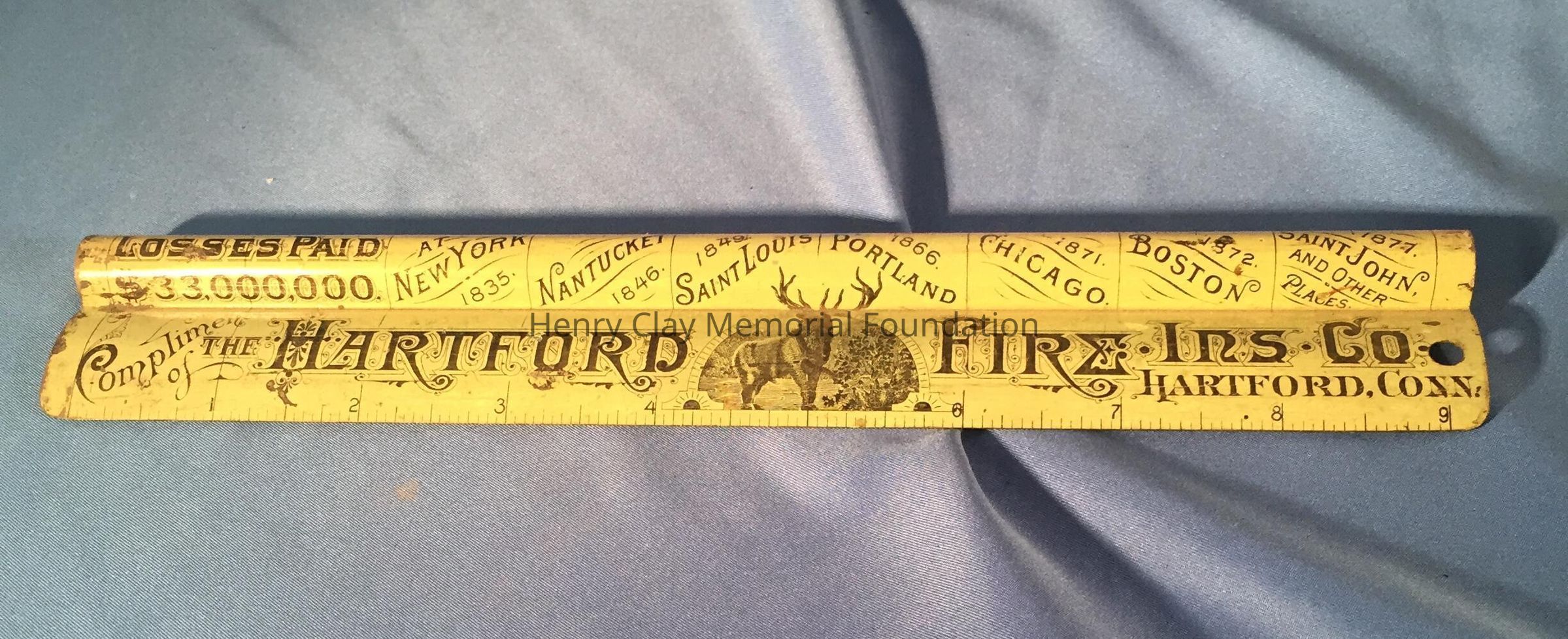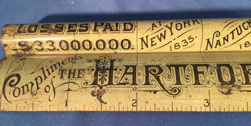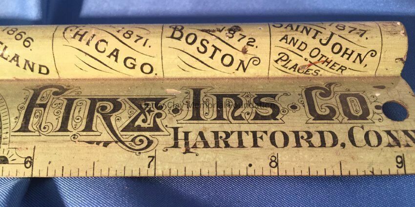 Metal ruler: "Compliments of the Hartford Fire Ins. Co. Hartford, Conn." Patent Sept. 8th, 1885.