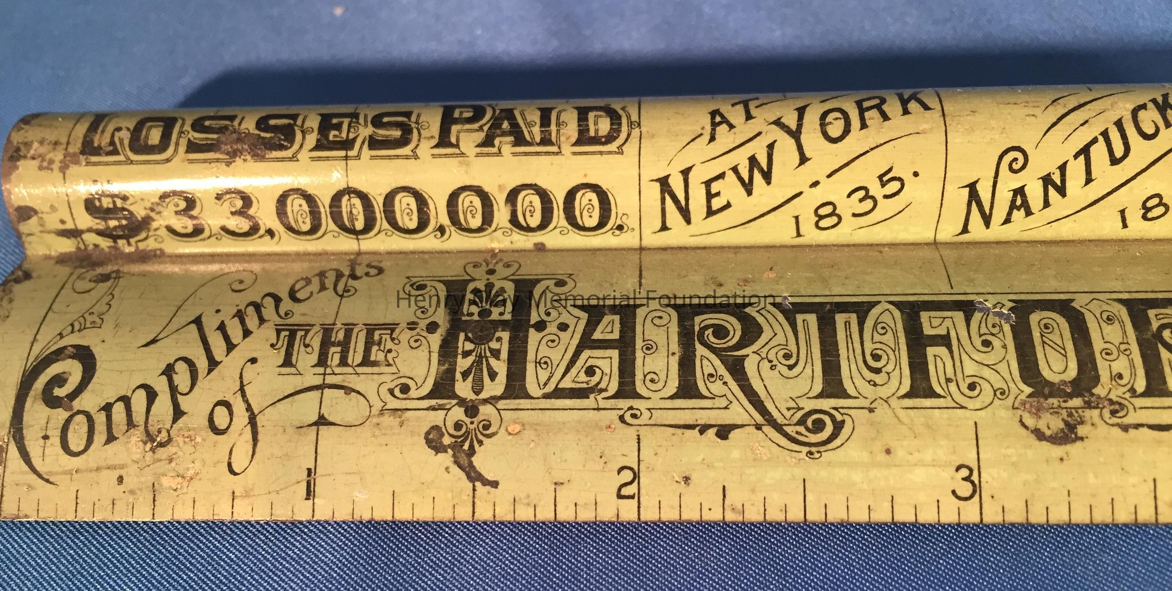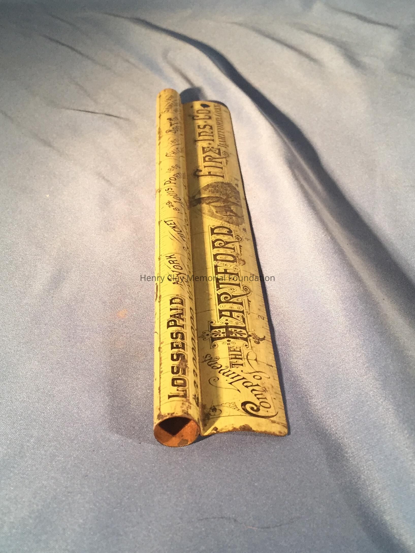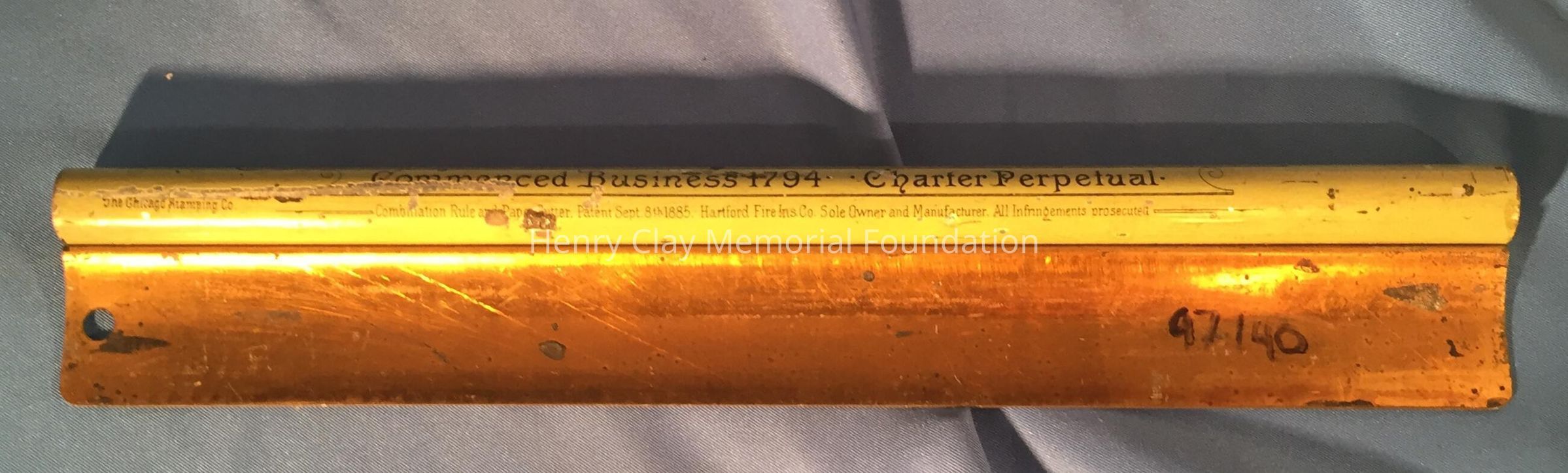 Metal ruler: "Compliments of the Hartford Fire Ins. Co. Hartford, Conn." Patent Sept. 8th, 1885.