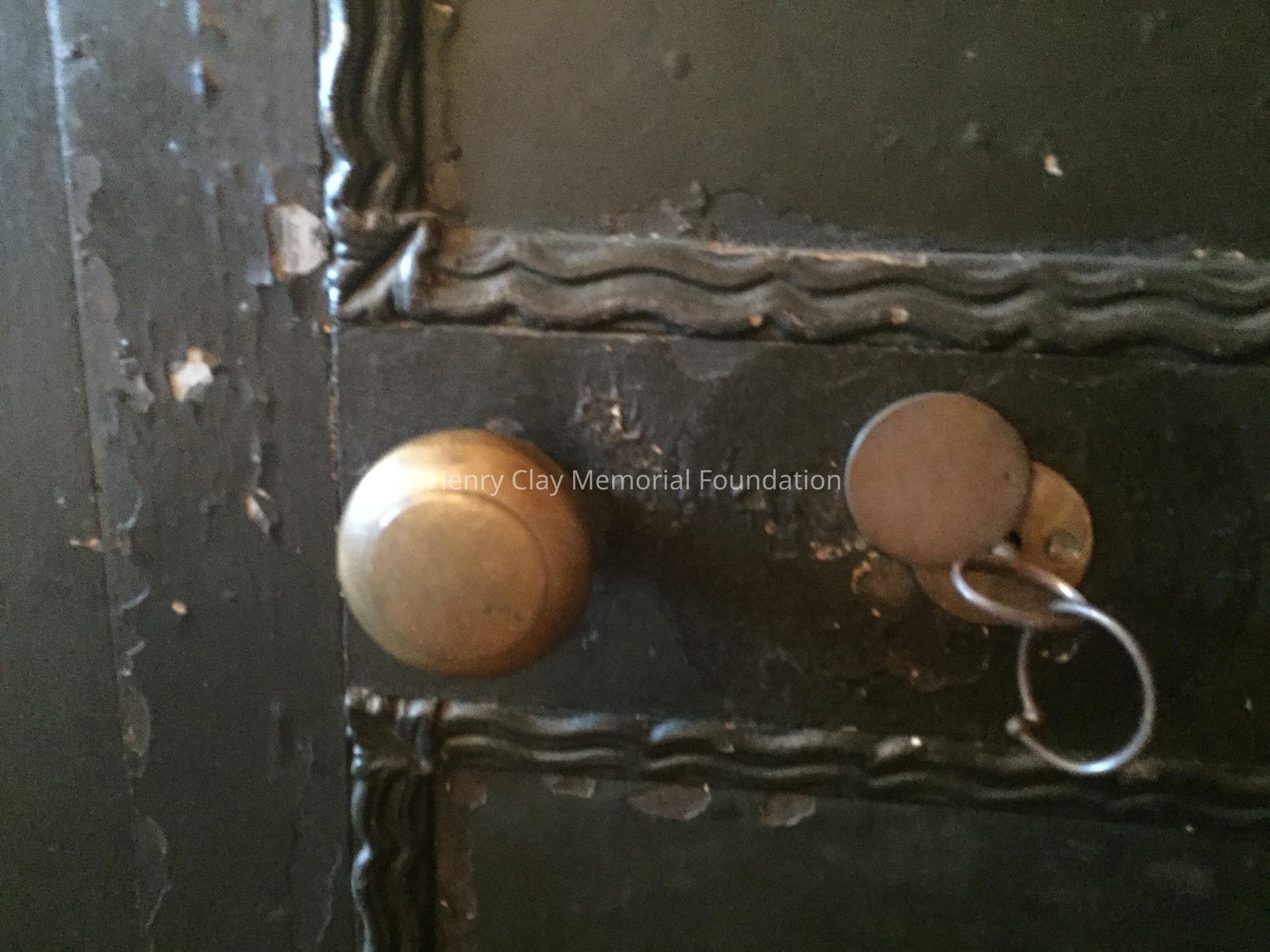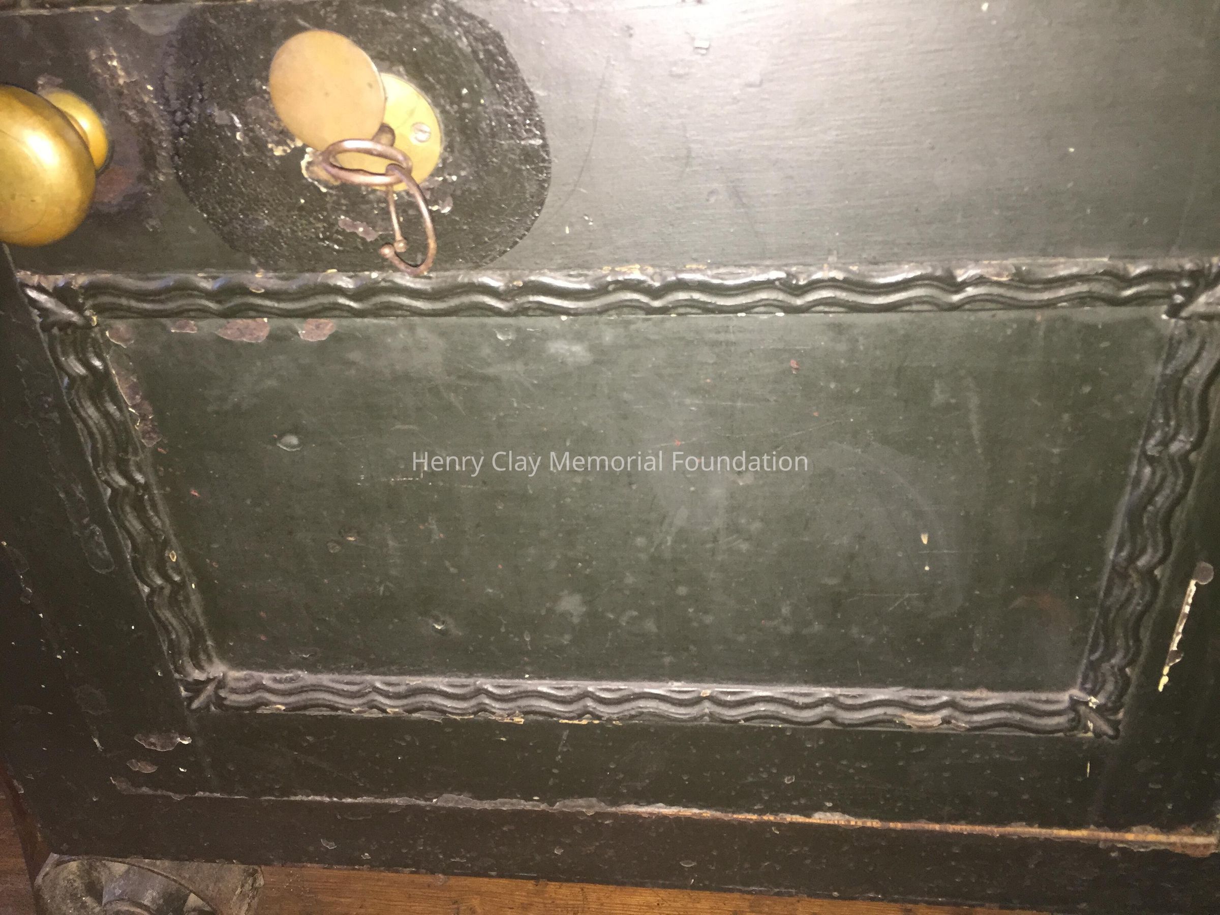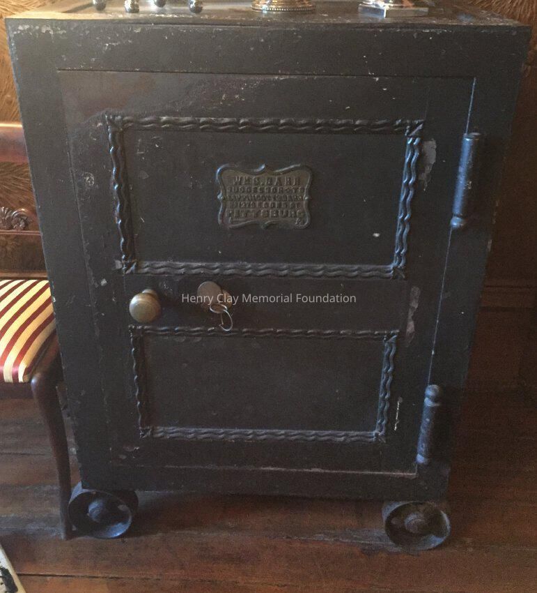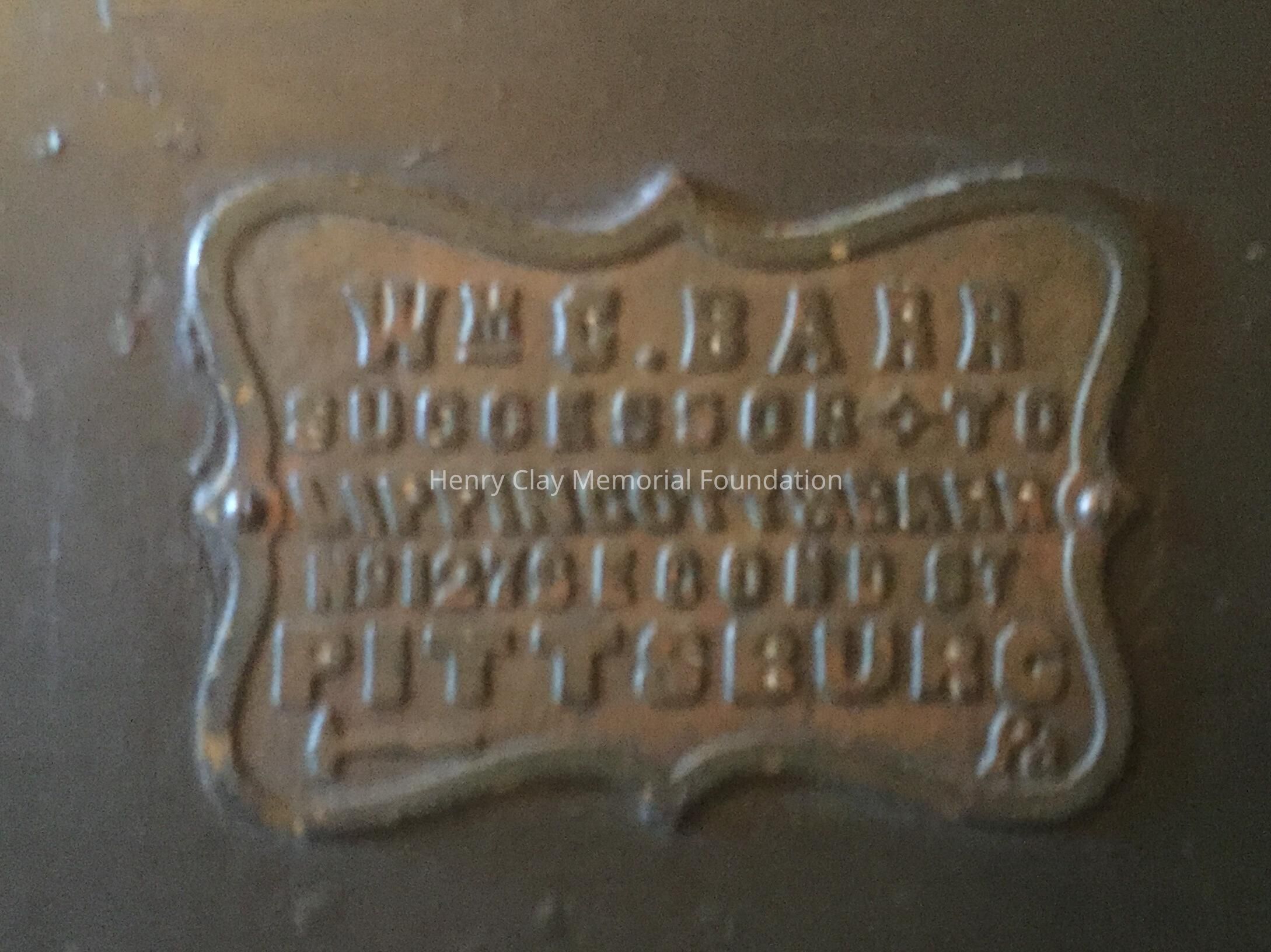 Large safe, painted black. Ring Handles on either side. Door has visible hinges protruding from the right front, a brass knob, brass lock cover, and broken key inserted into lock. Safe rests on four wheels. A brass plate on door reads, "Wm. C Barr / successor to / Lippincott & Barr / No. 127 SE Cond St. / Pittsburgh Pa."Dimensions