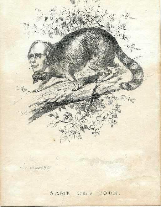 Political cartoon depicting a raccoon on a branch with the head of Henry Clay, titled beneath image, "SAME OLD COON." Printed in lower left corner, "By L. [?] Rosenthal, Phila."