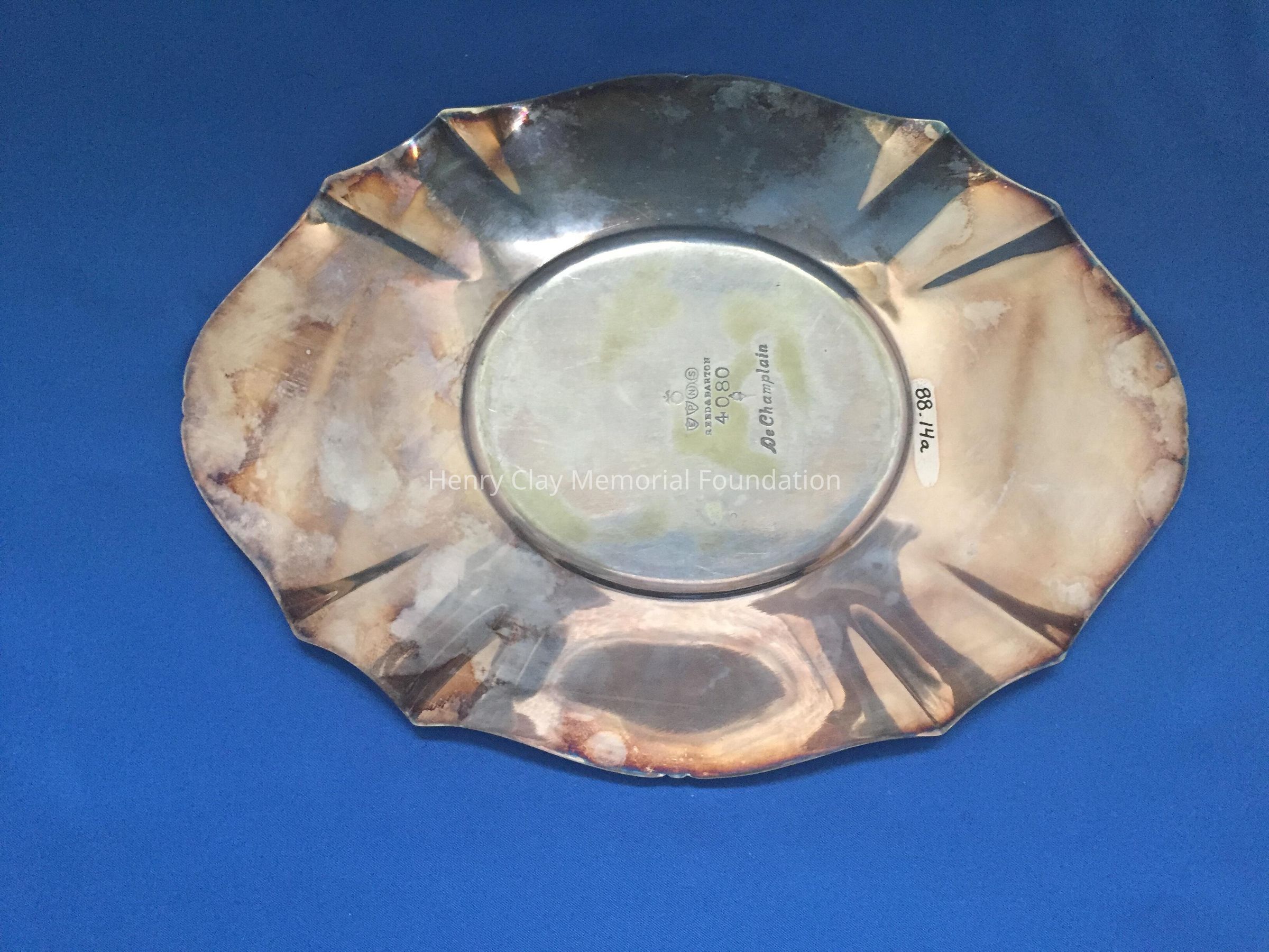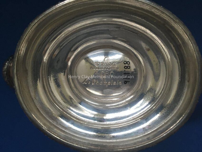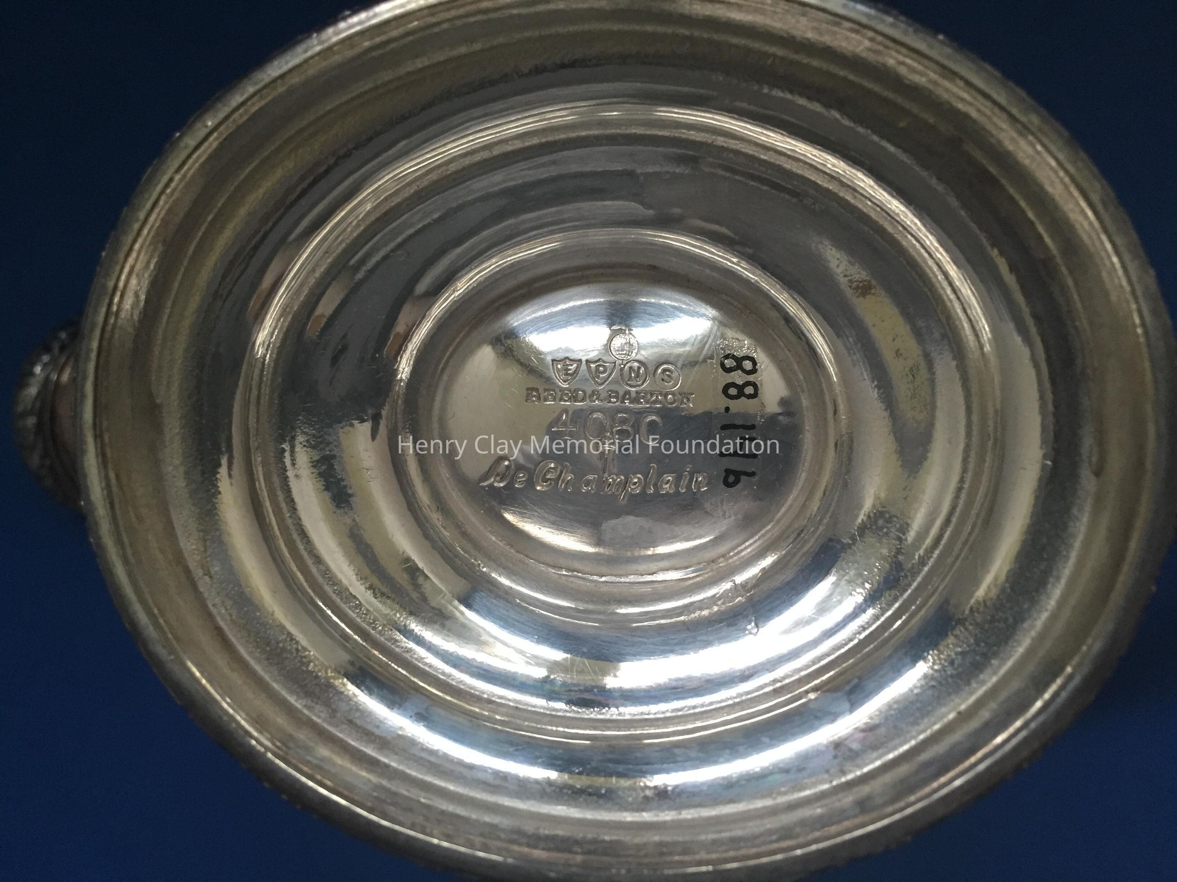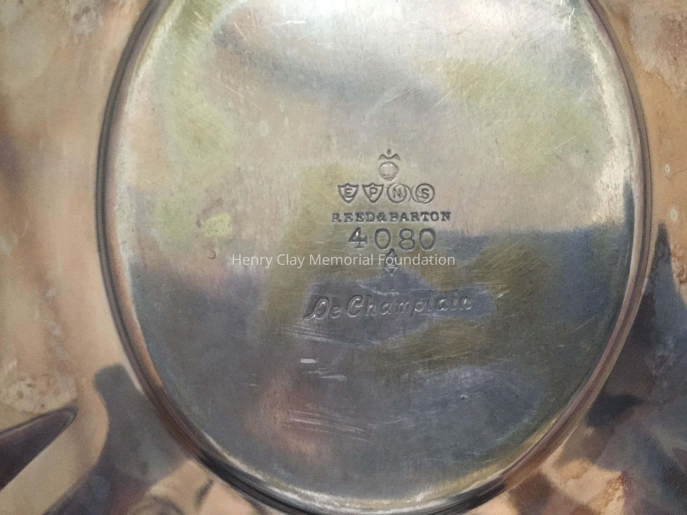 Silver plated with foral design around rim and base. Handle has leaf design on thrumb rest. Monogrammed "B" on one side. Tray included has floral design and reeded rim. Both pieces stamped with hallmark adn "EPNS / Reed & Barton / 4080 / [hallmark] / De Champlain."Dimensions