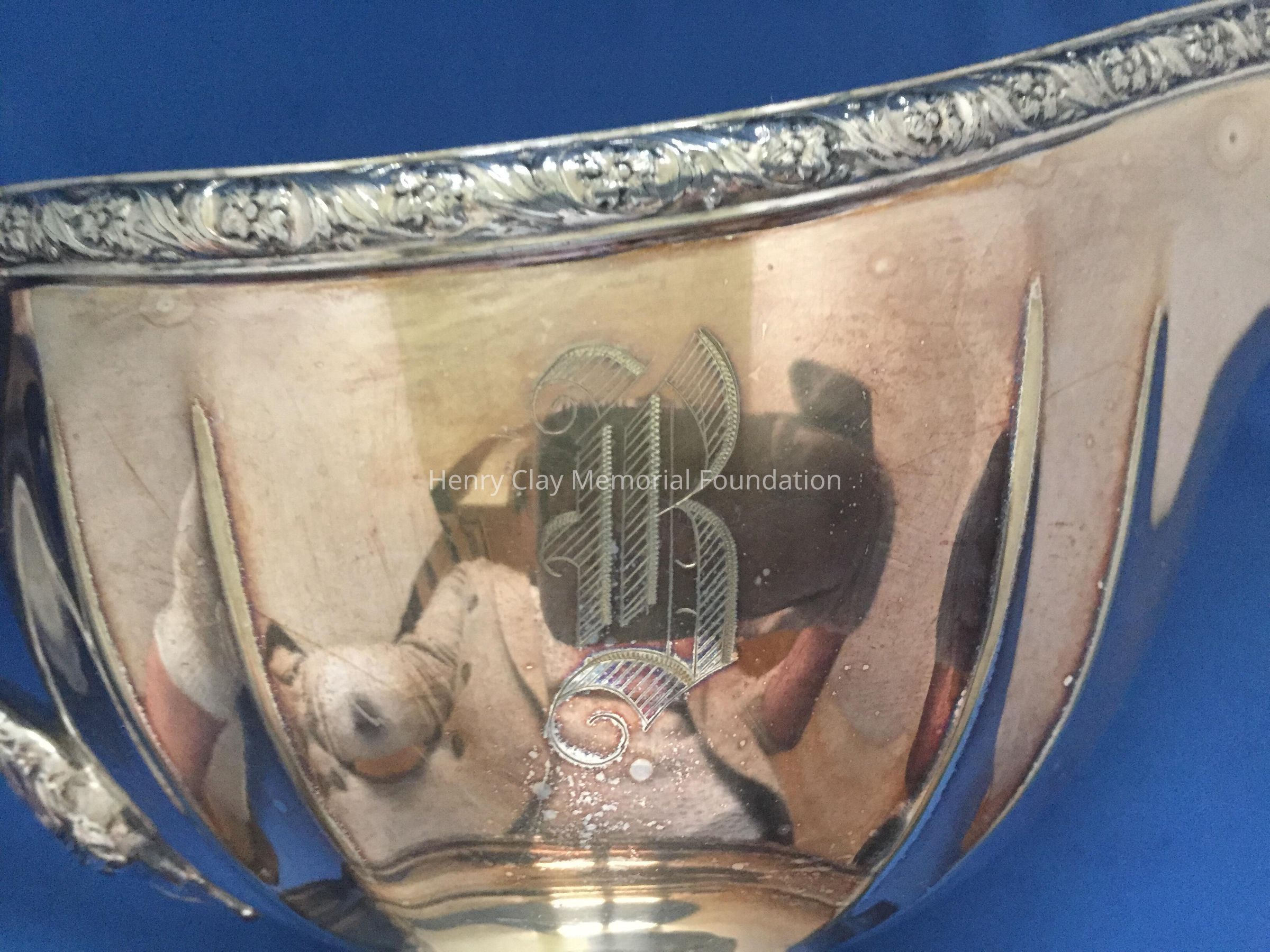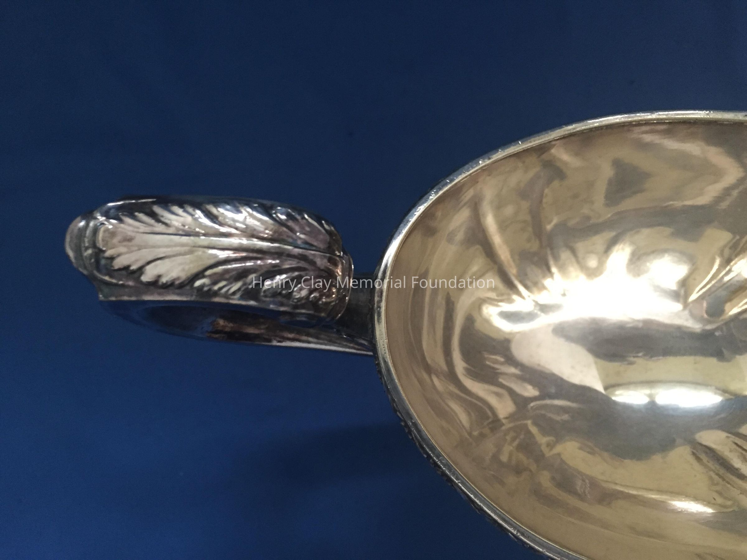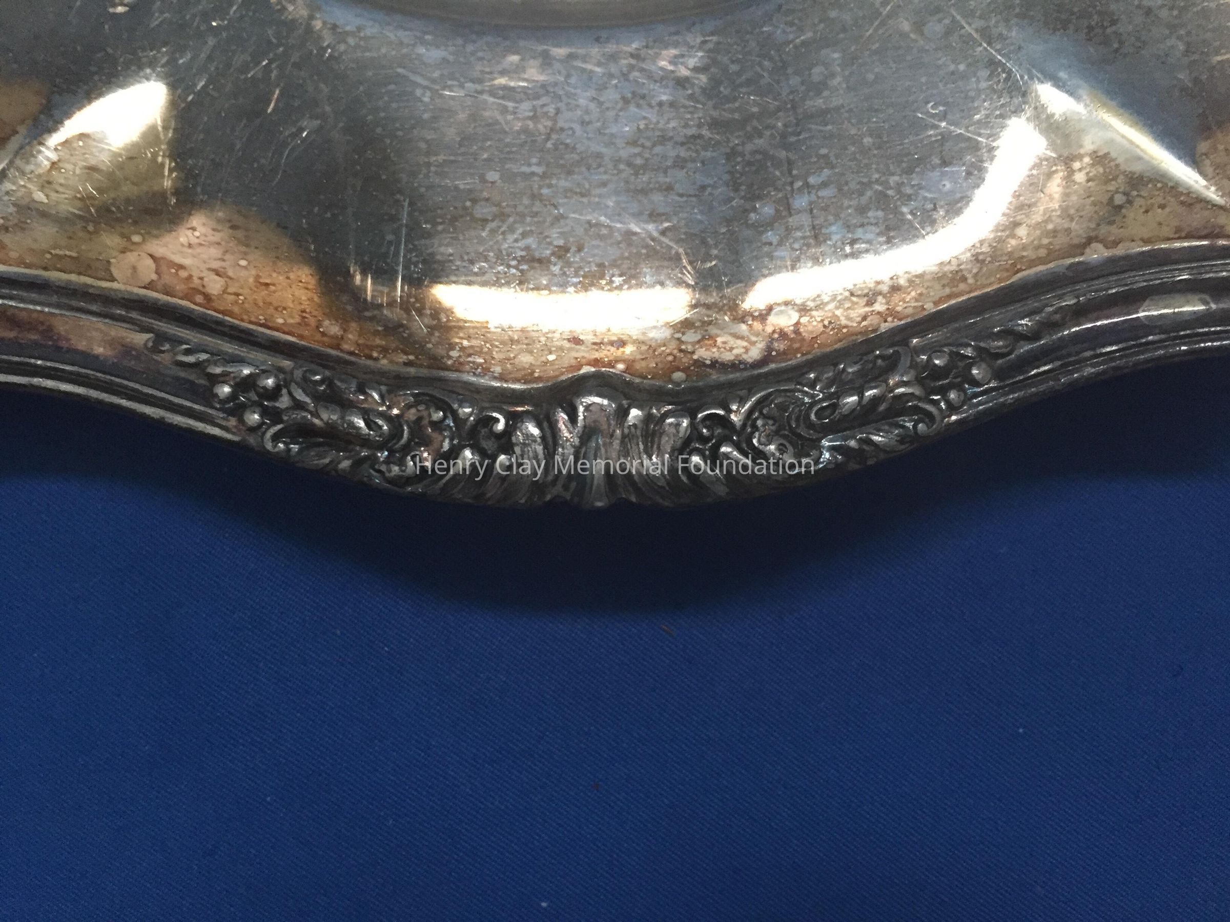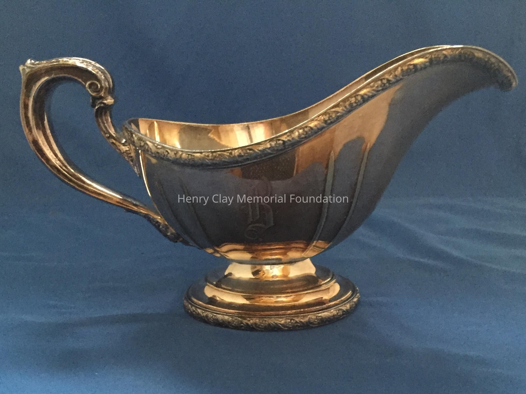 Silver plated with foral design around rim and base. Handle has leaf design on thrumb rest. Monogrammed "B" on one side. Tray included has floral design and reeded rim. Both pieces stamped with hallmark adn "EPNS / Reed & Barton / 4080 / [hallmark] / De Champlain."Dimensions