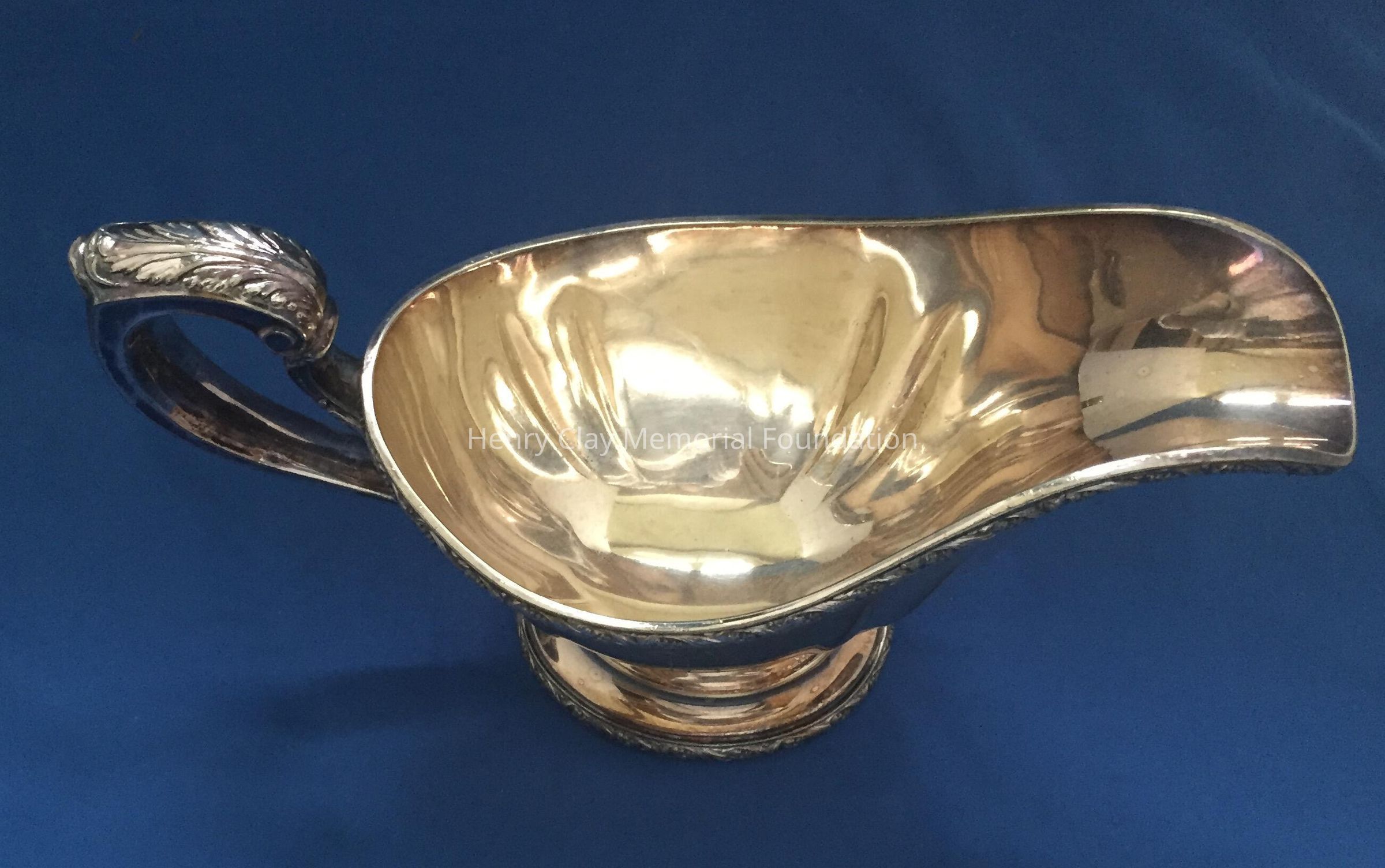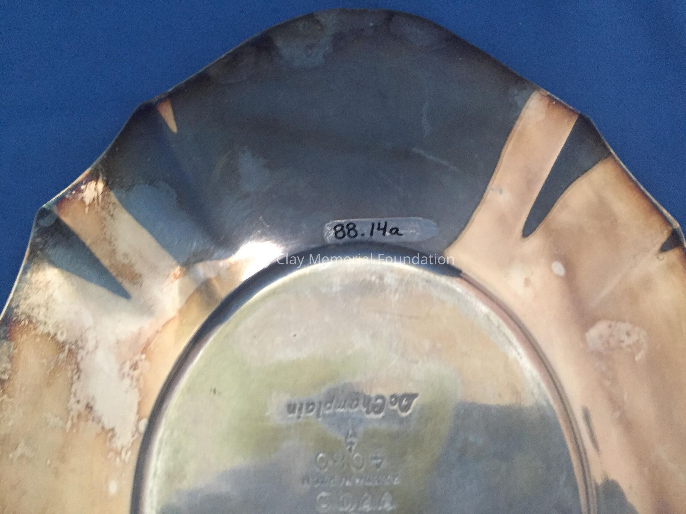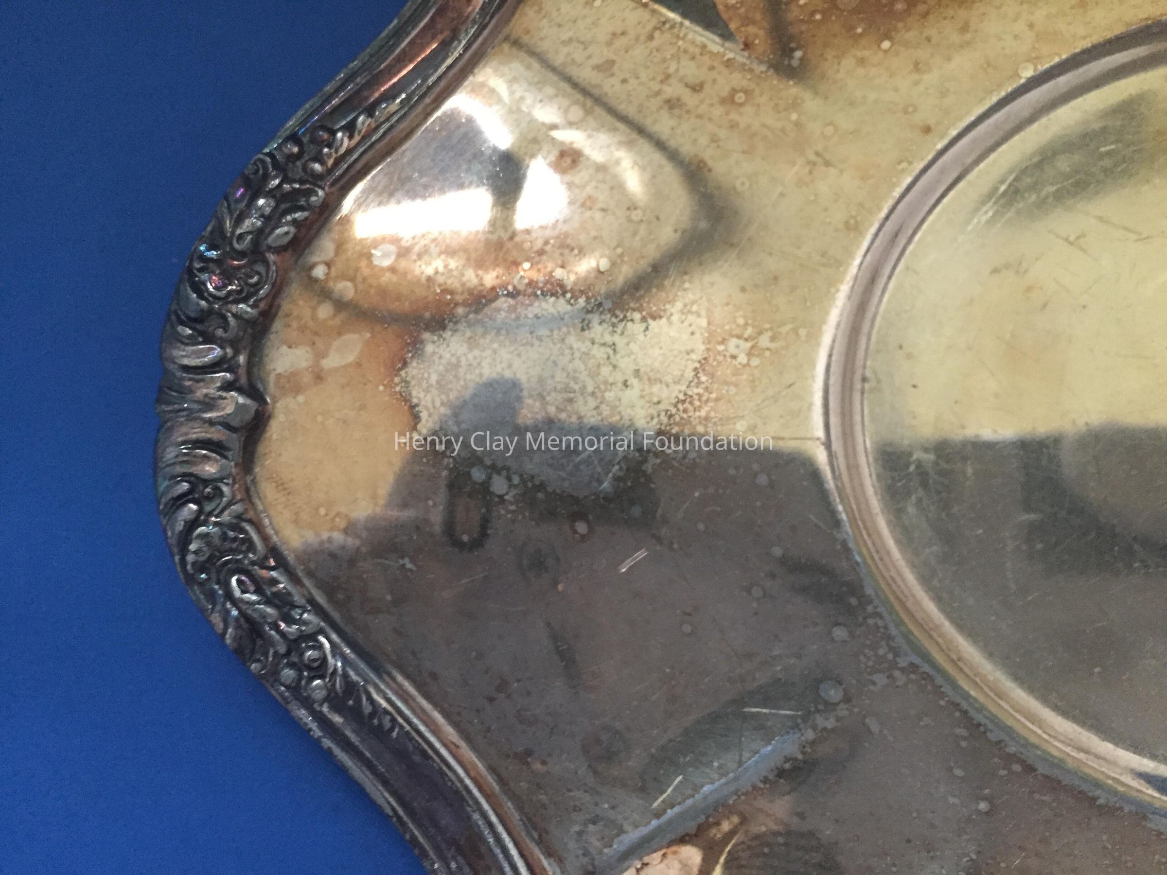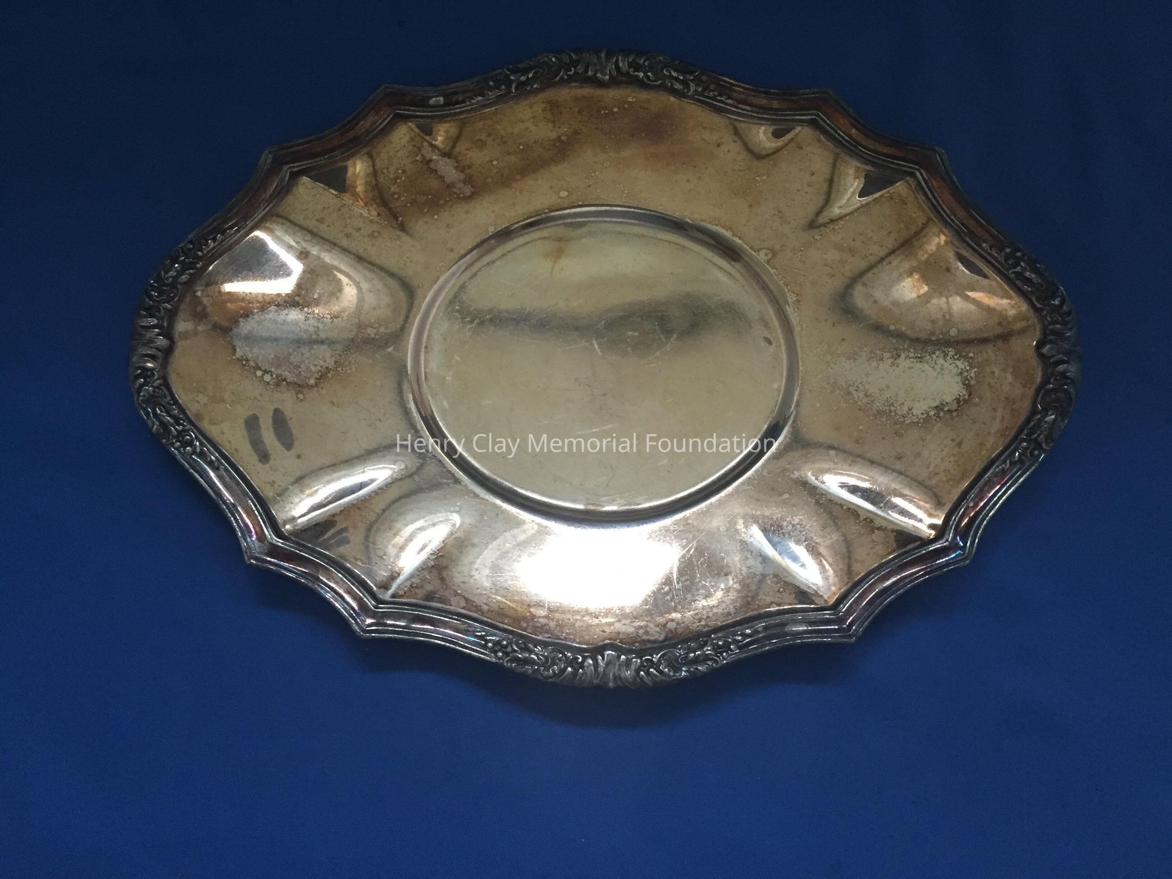Silver plated with foral design around rim and base. Handle has leaf design on thrumb rest. Monogrammed "B" on one side. Tray included has floral design and reeded rim. Both pieces stamped with hallmark adn "EPNS / Reed & Barton / 4080 / [hallmark] / De Champlain."Dimensions