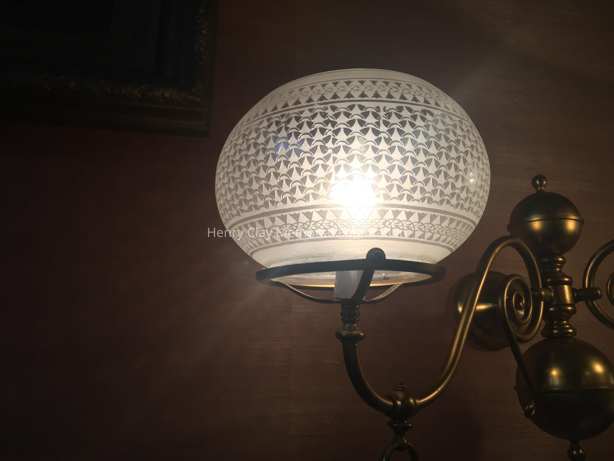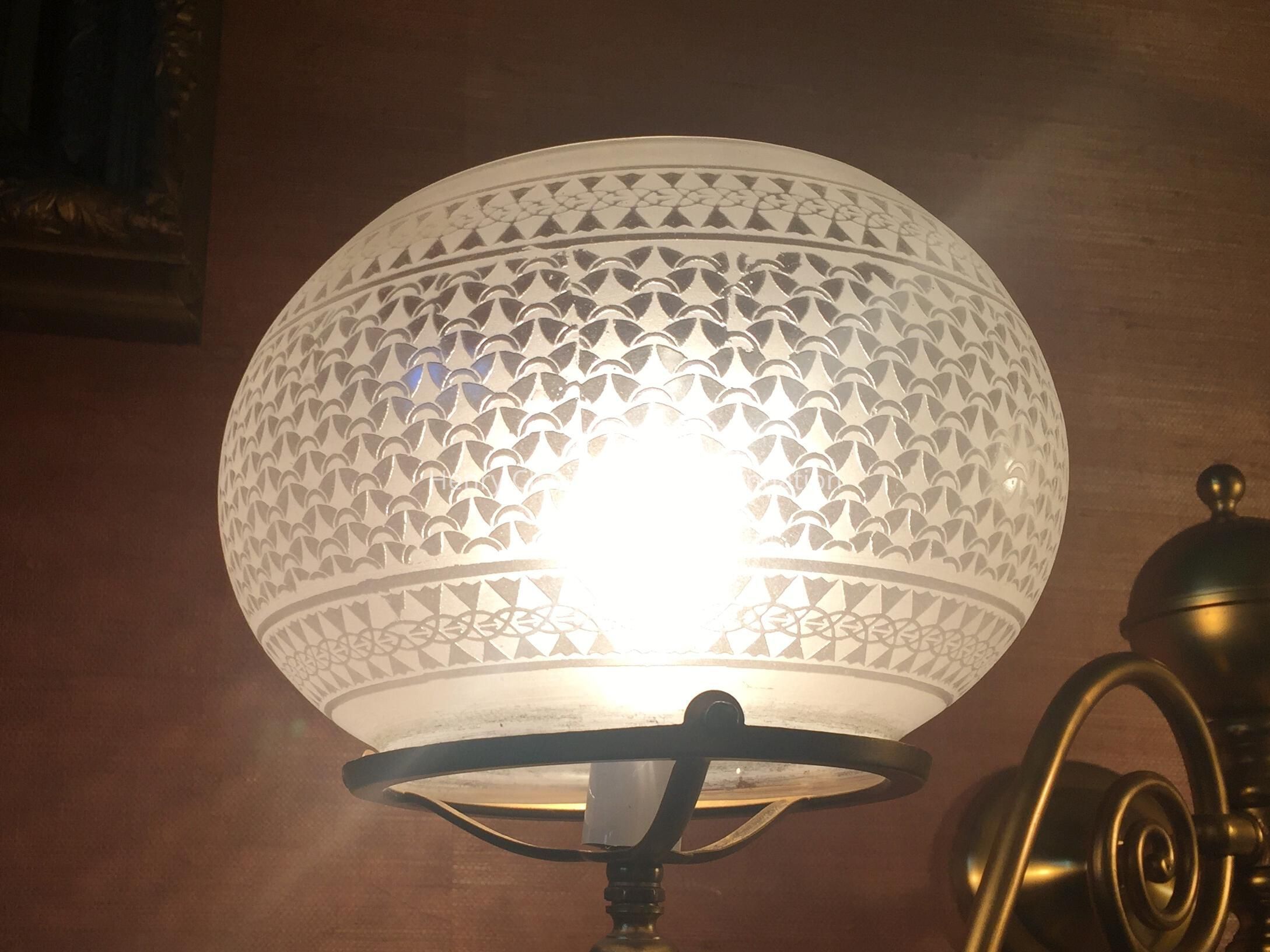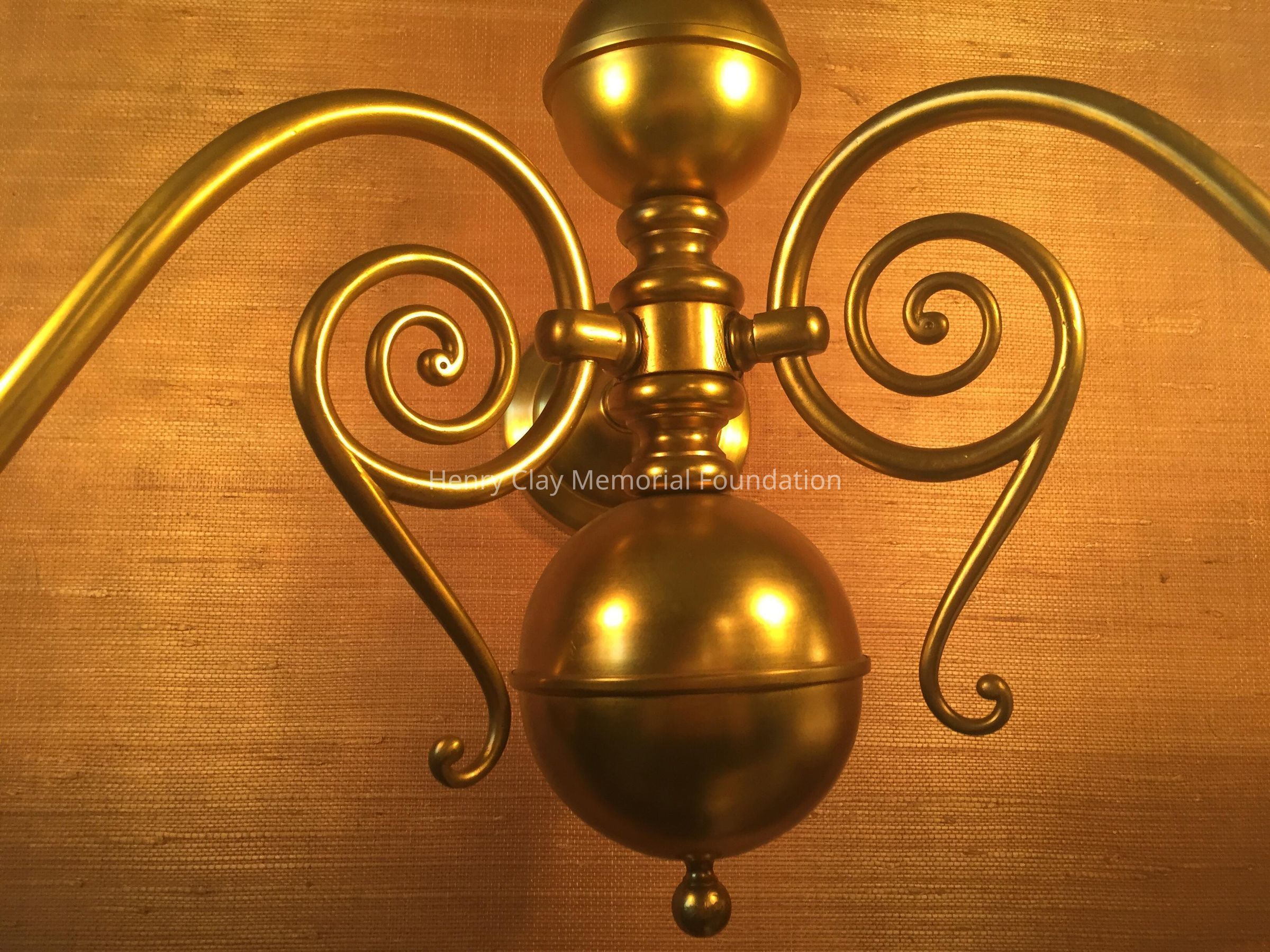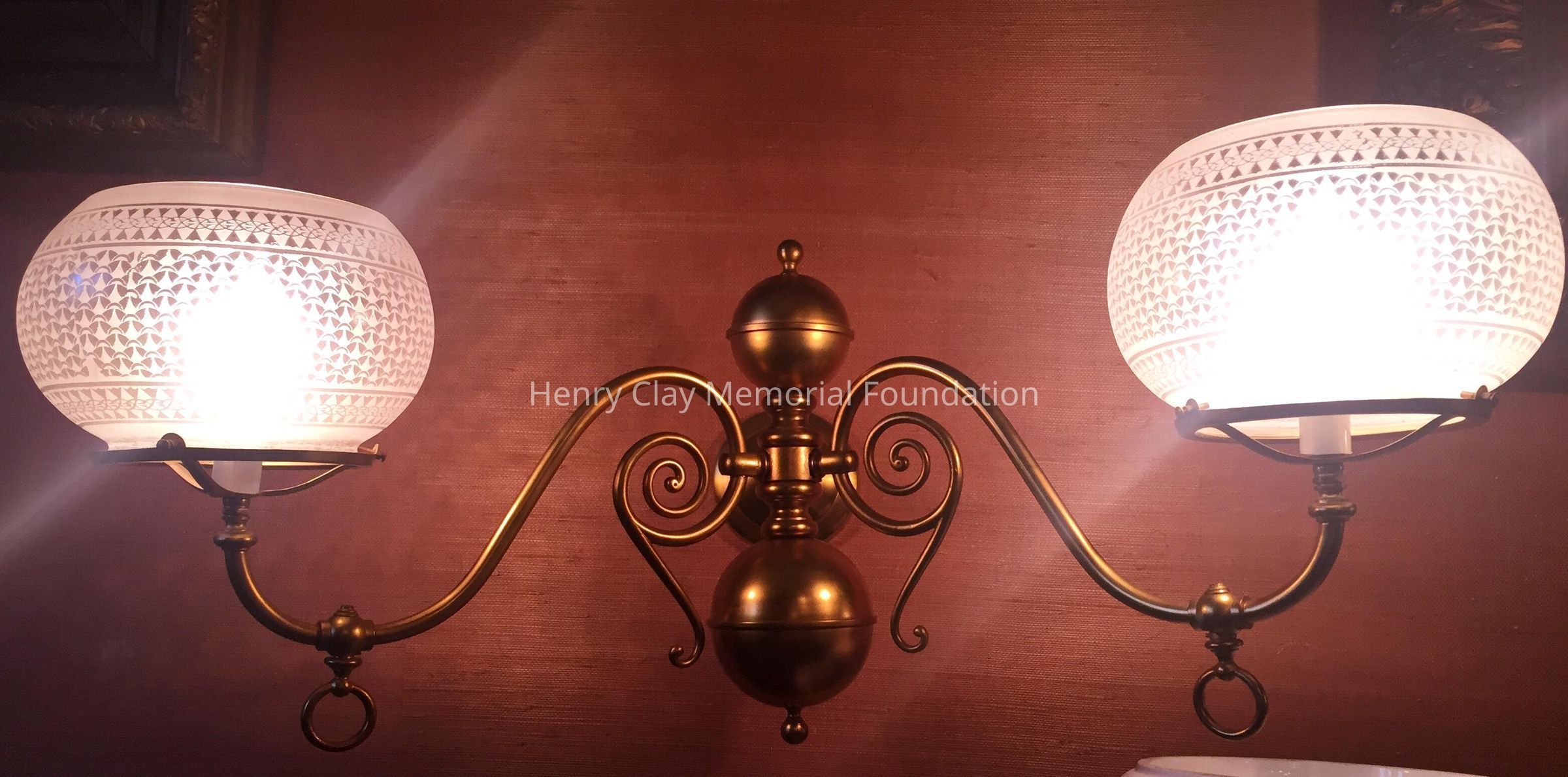 A pair of brass sconces with etched glass globes, two arms, flanking the mantel.