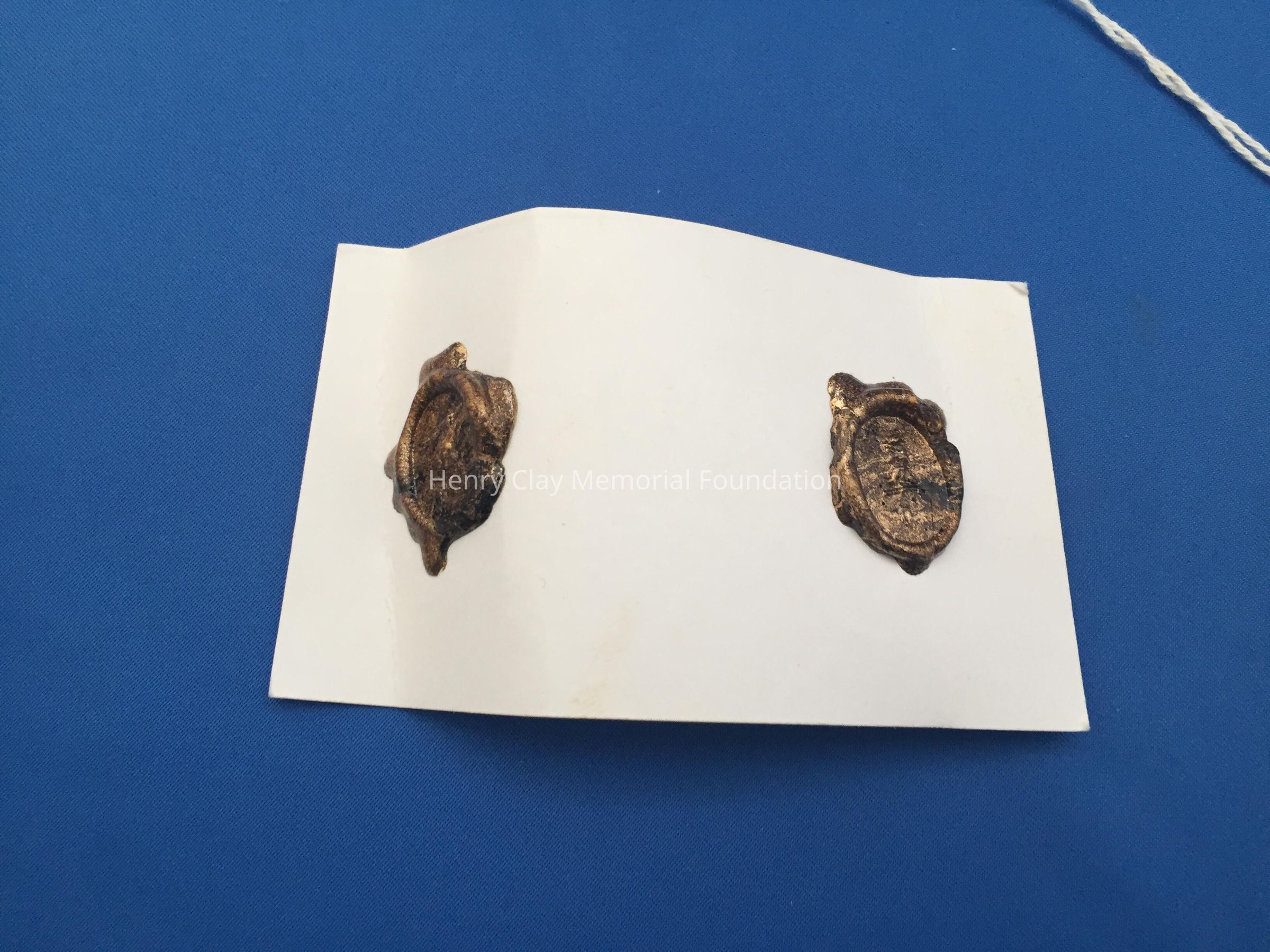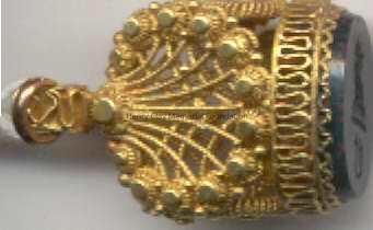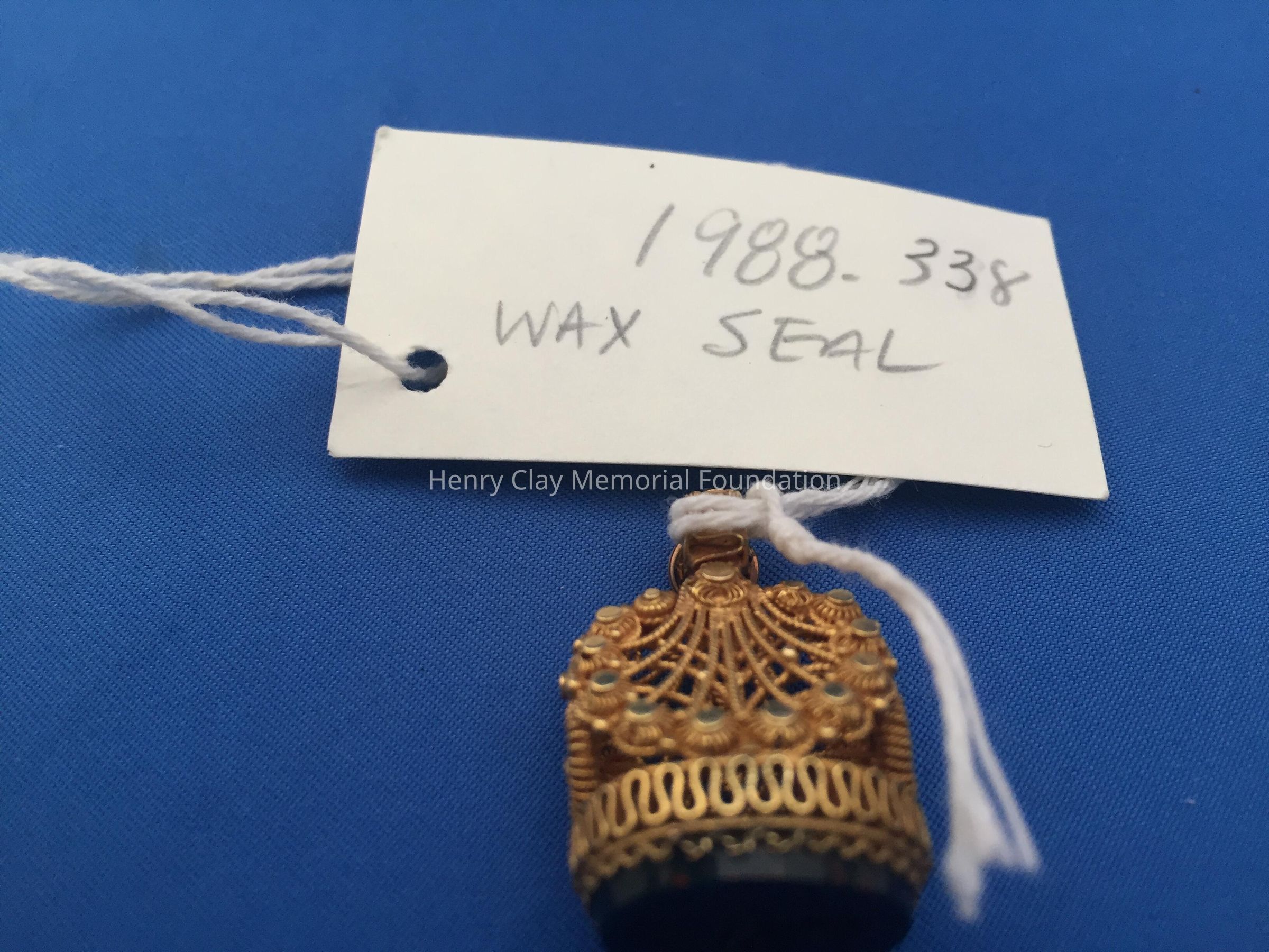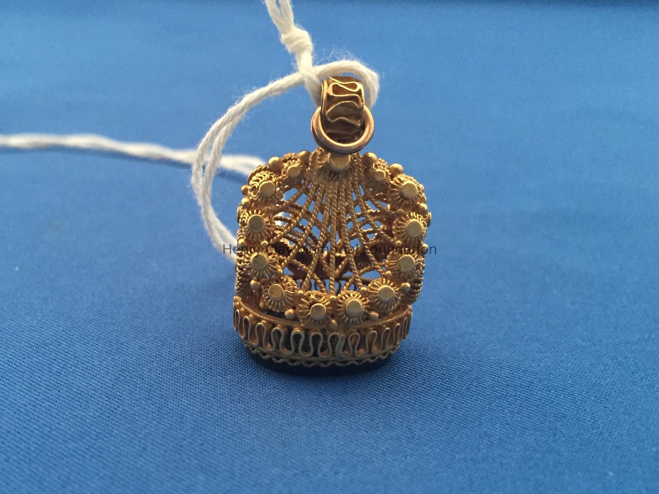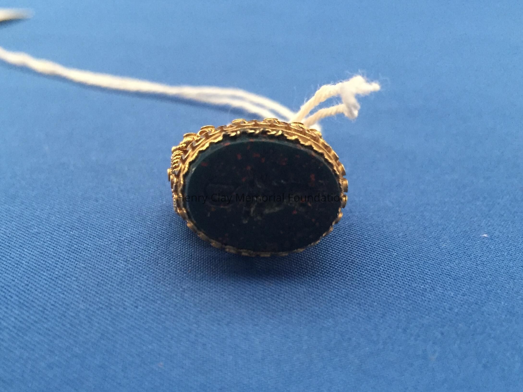 Oval bloodstone seal carved with a lion's head [Clay coat of arms?] above the letter "C". Stone is set in an ornately designed, filigree gold pendant. Pendant has loop at top to hang from chain.Dimensions