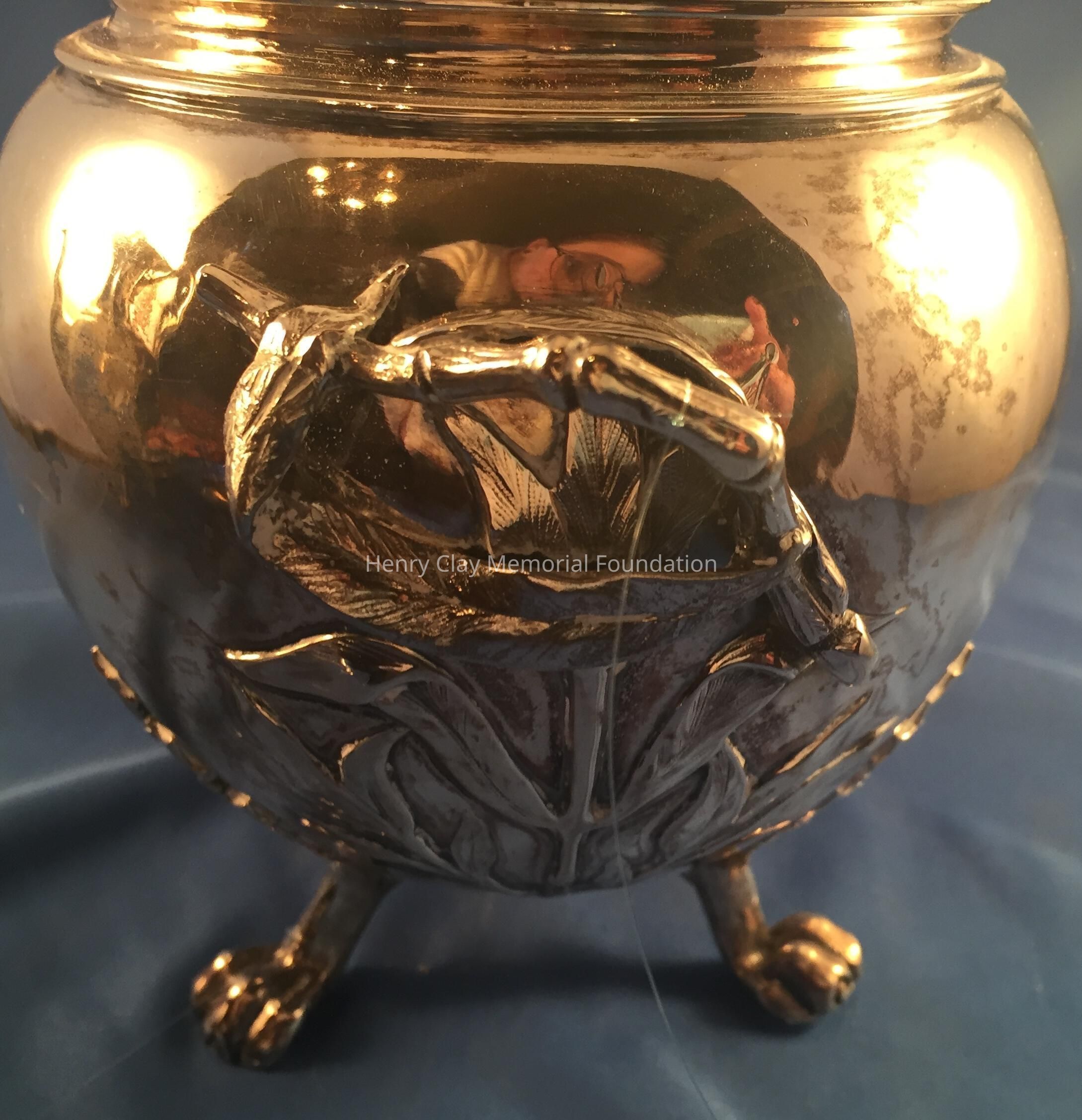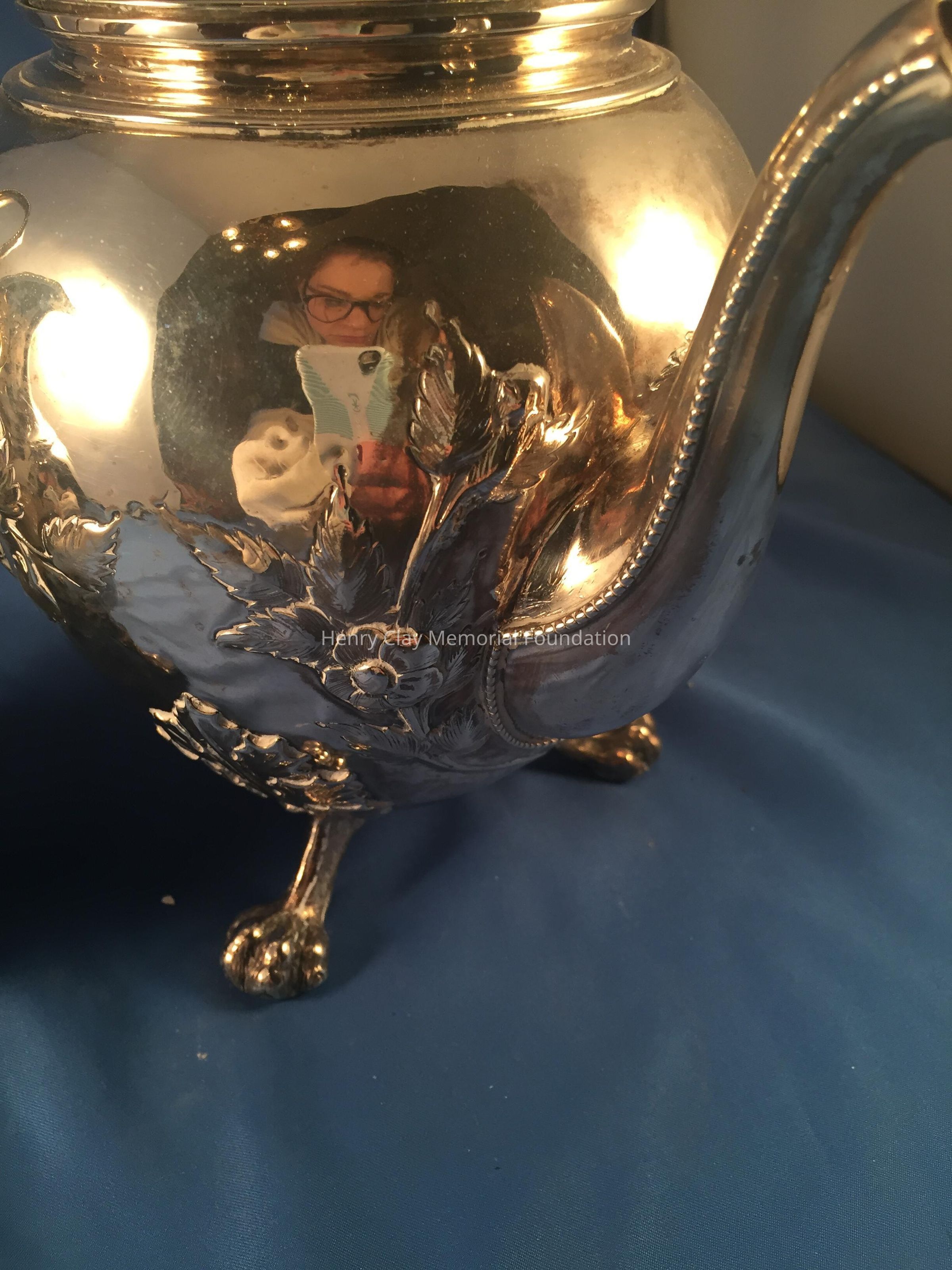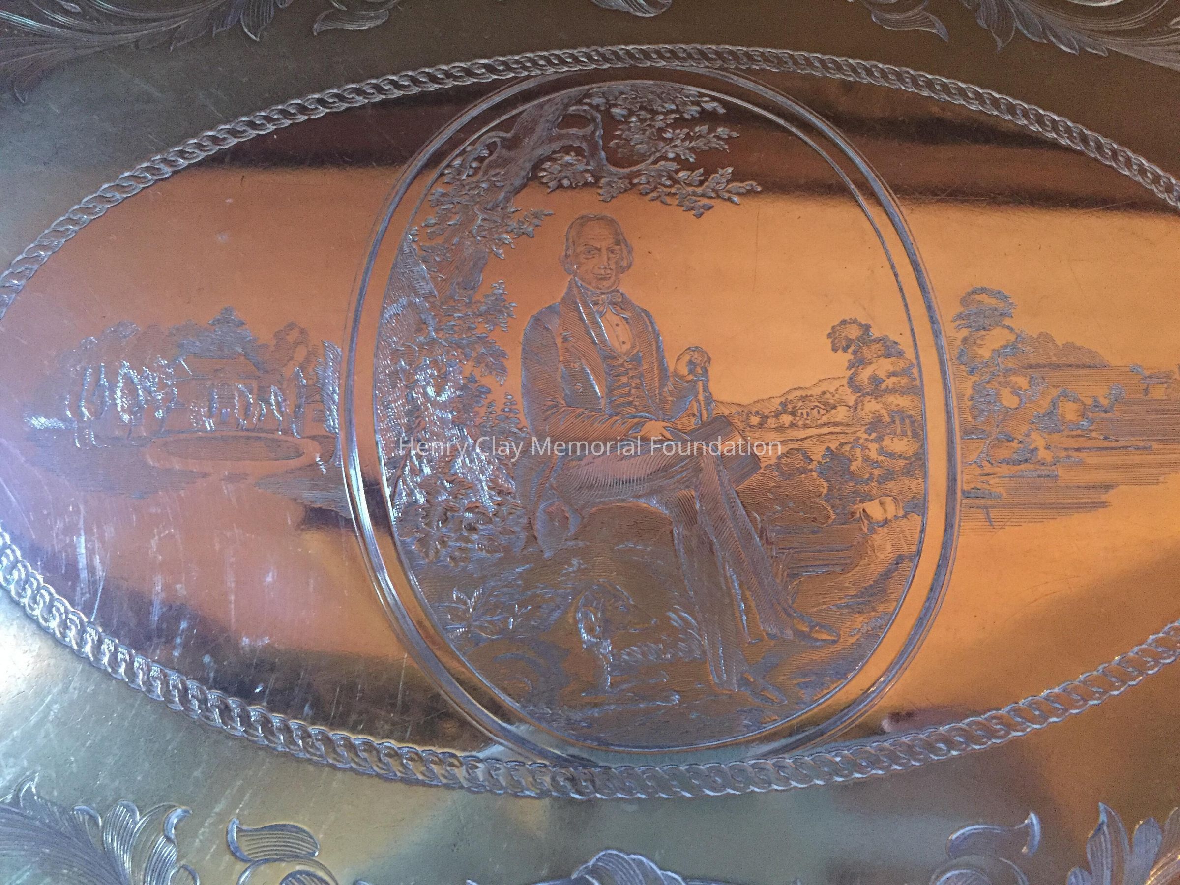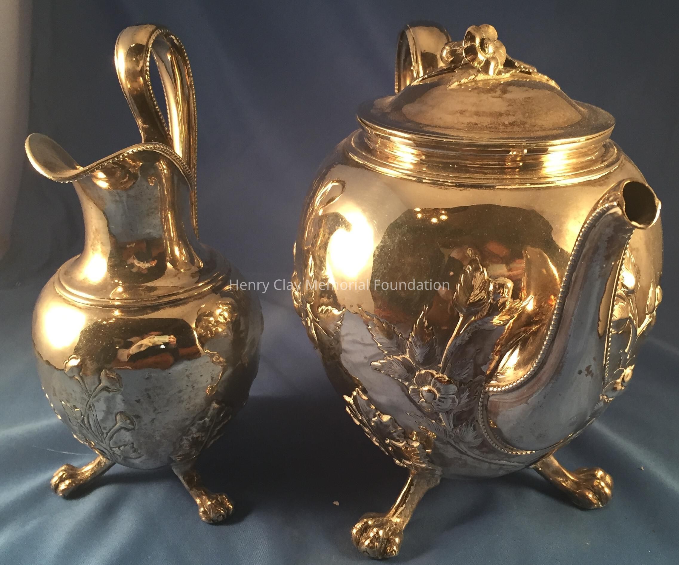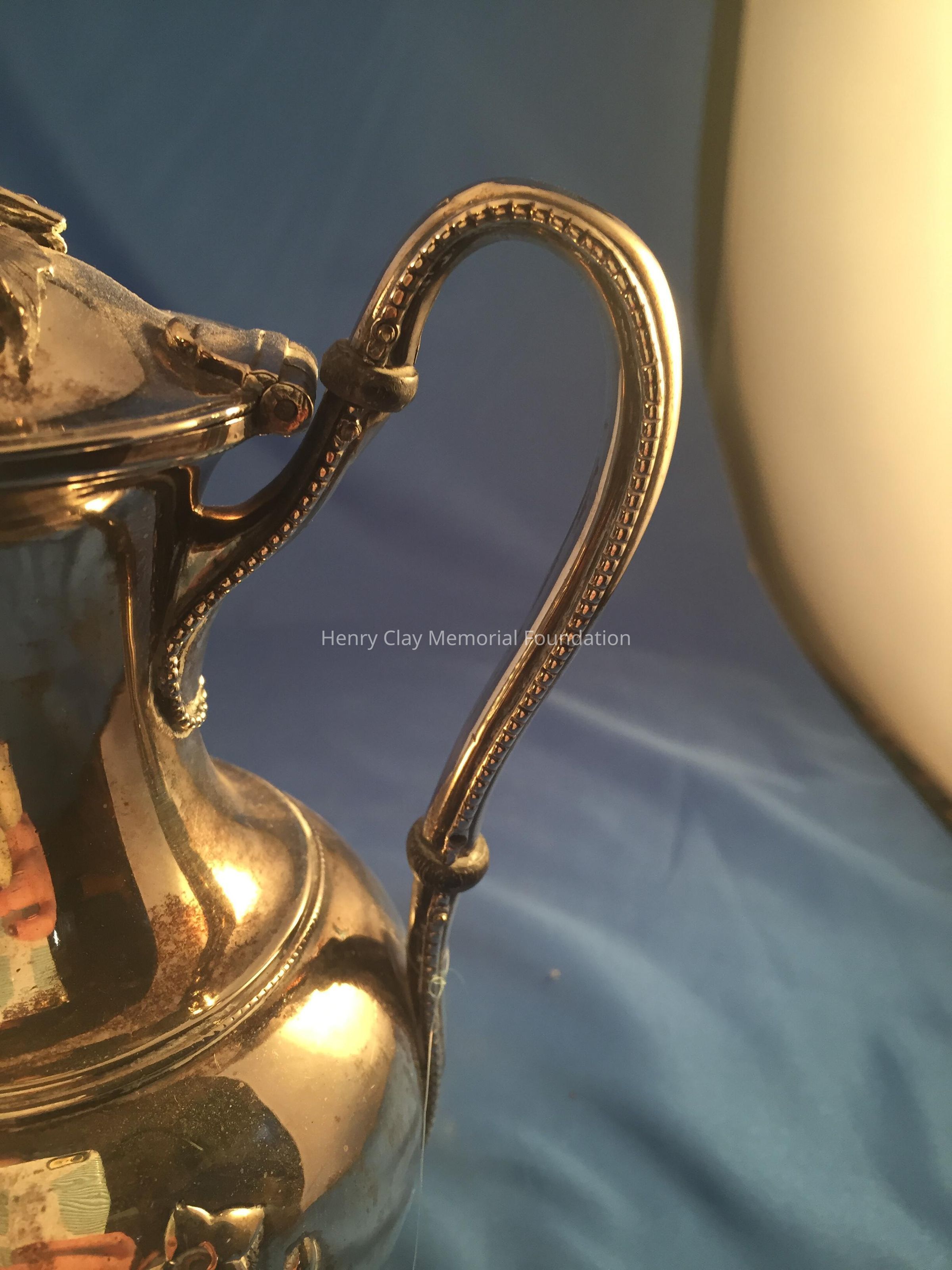 Silver tea service consists of a tray with an engraving of Henry Clay after Dodge's portrait and six matched pieces with applied decoration depicting sugar cane, coffee beans, and tea leaves. Includes a tray, teapot, hot water pot, coffee pot, sugar with lid, creamer, and a waste bowl.