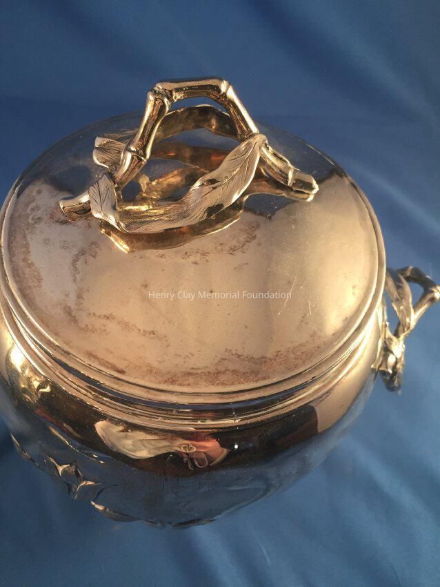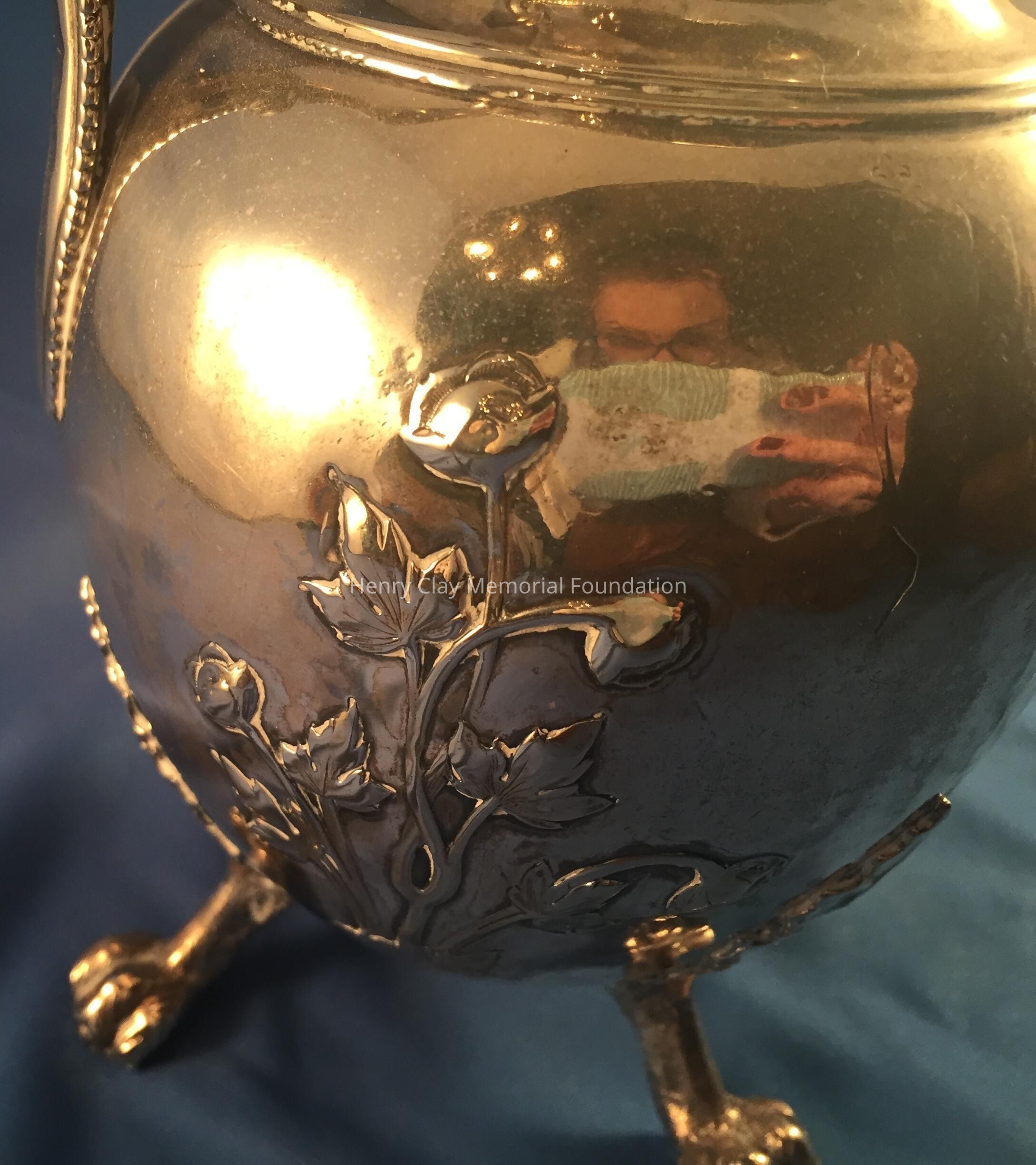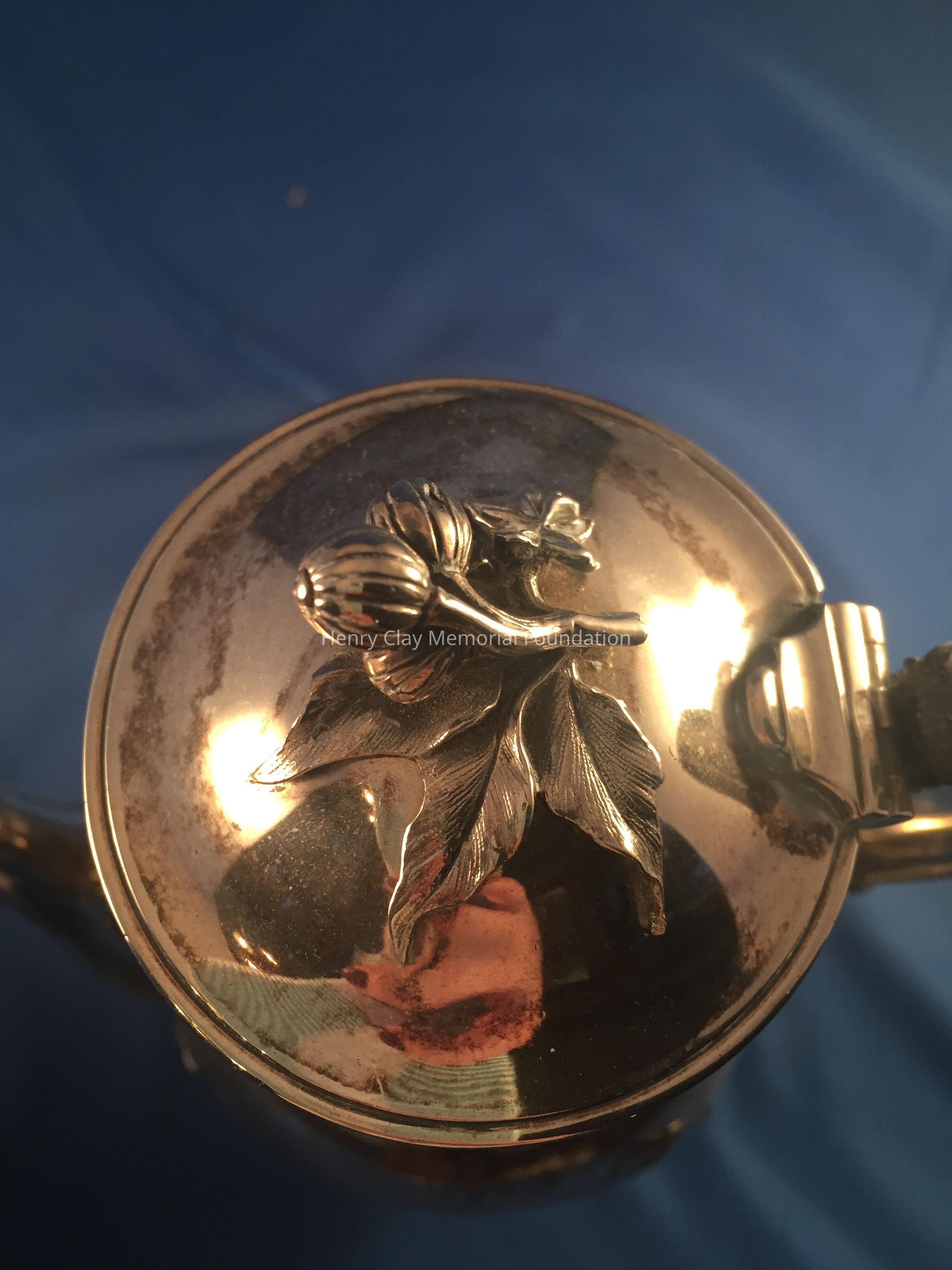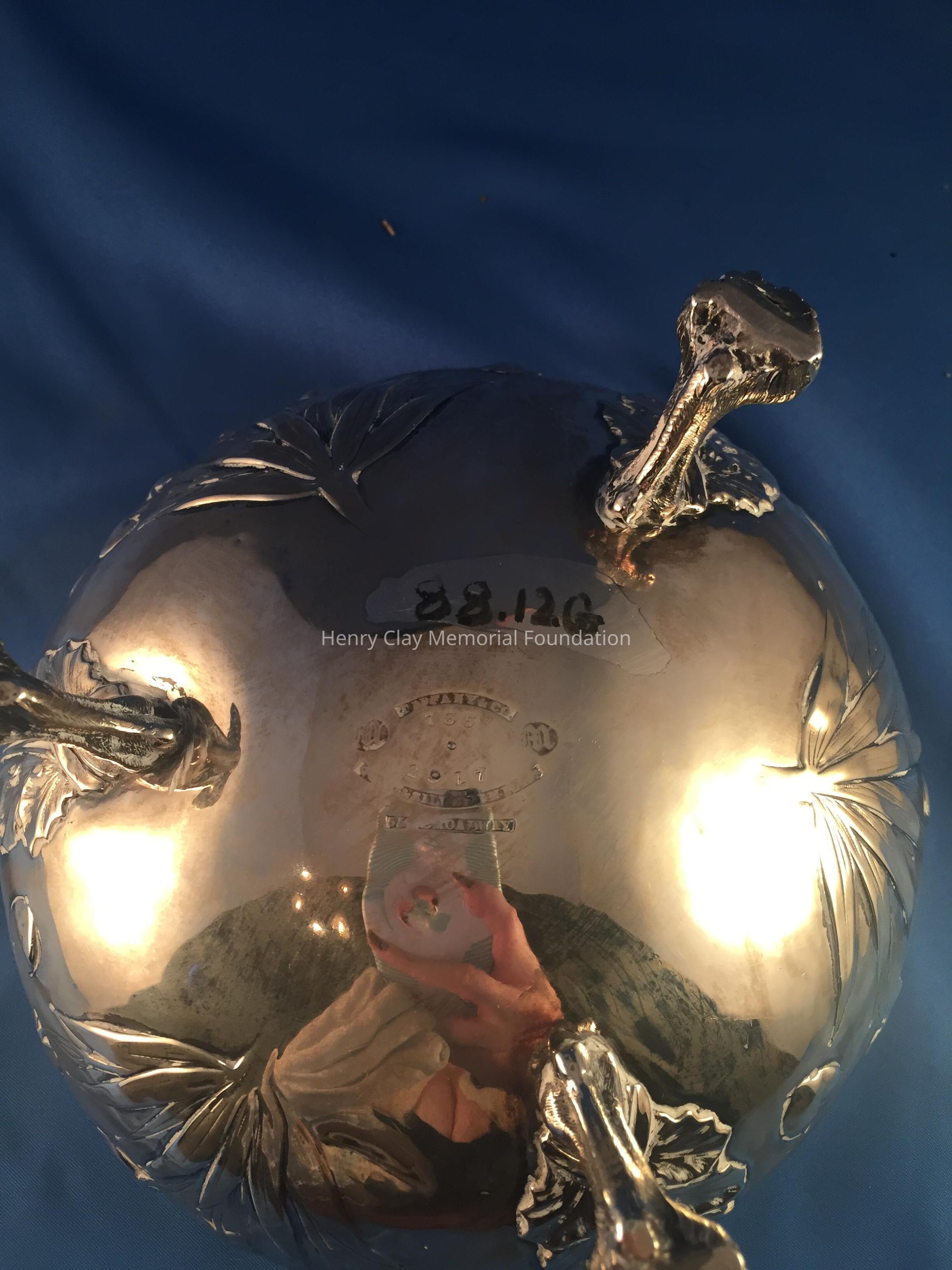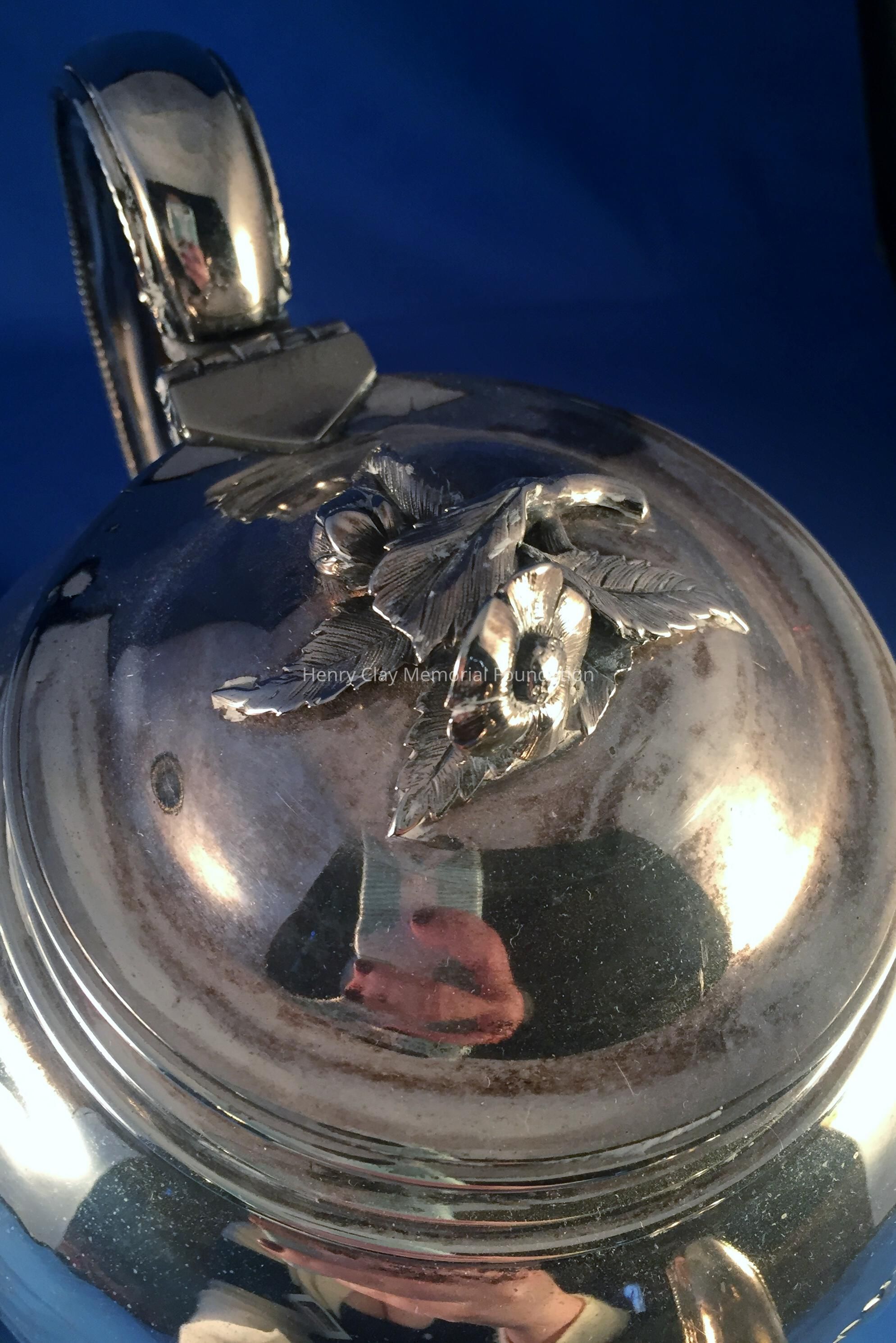 Silver tea service consists of a tray with an engraving of Henry Clay after Dodge's portrait and six matched pieces with applied decoration depicting sugar cane, coffee beans, and tea leaves. Includes a tray, teapot, hot water pot, coffee pot, sugar with lid, creamer, and a waste bowl.