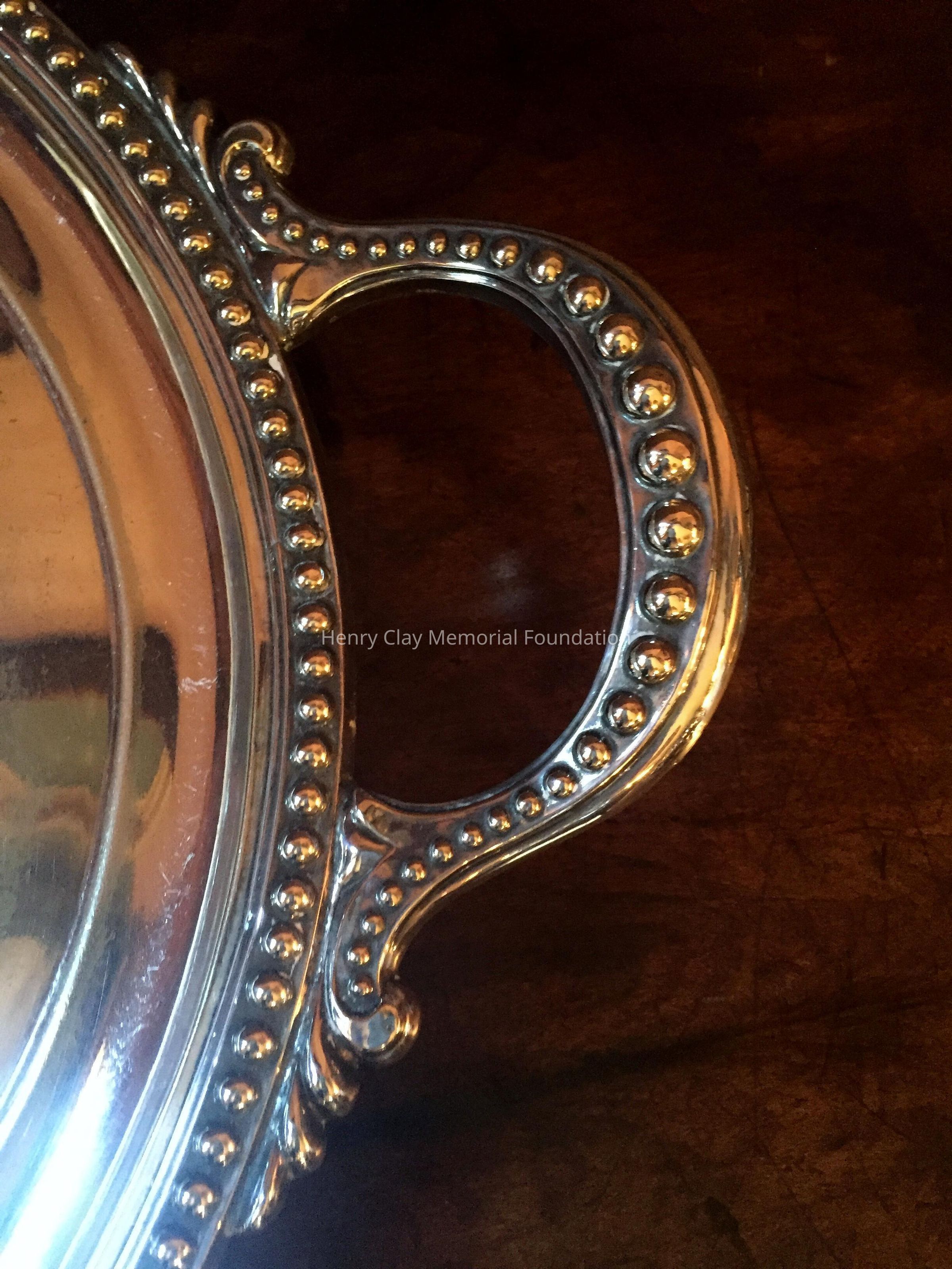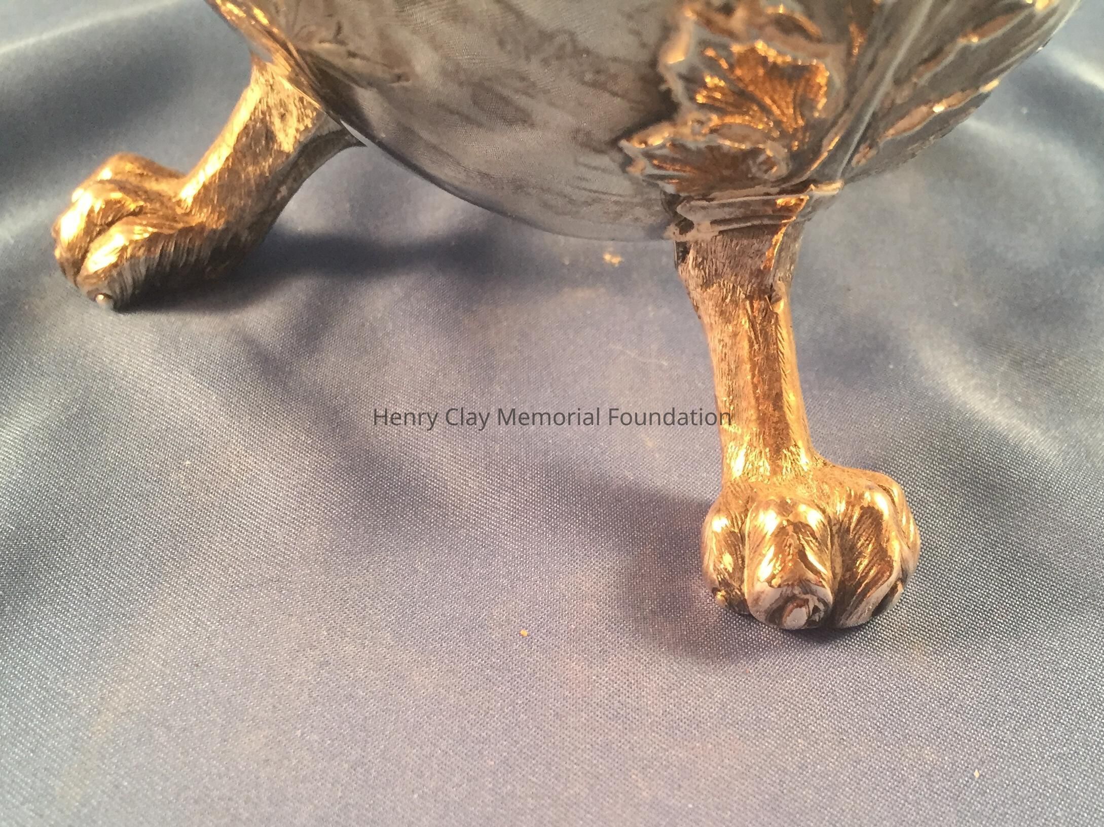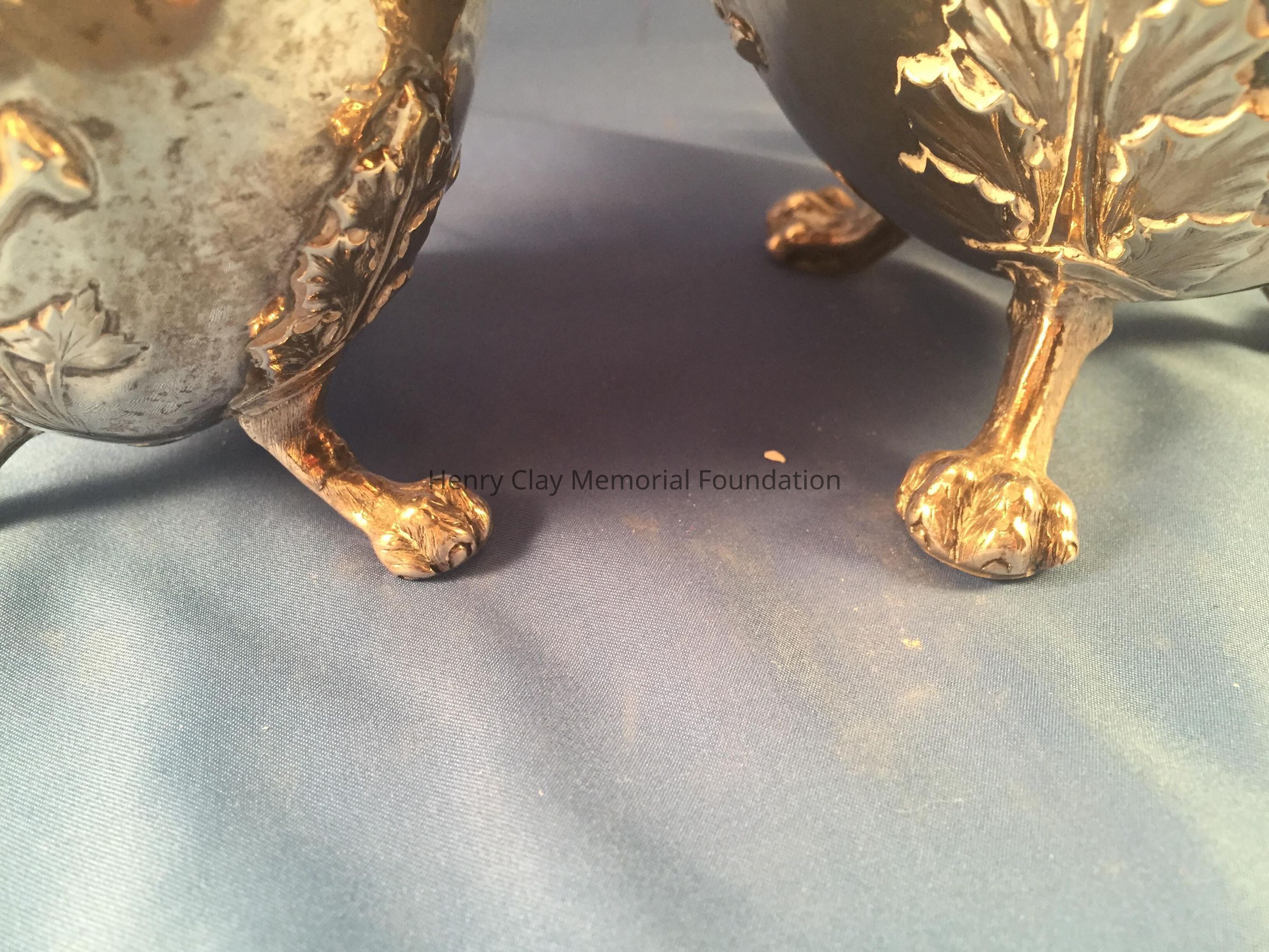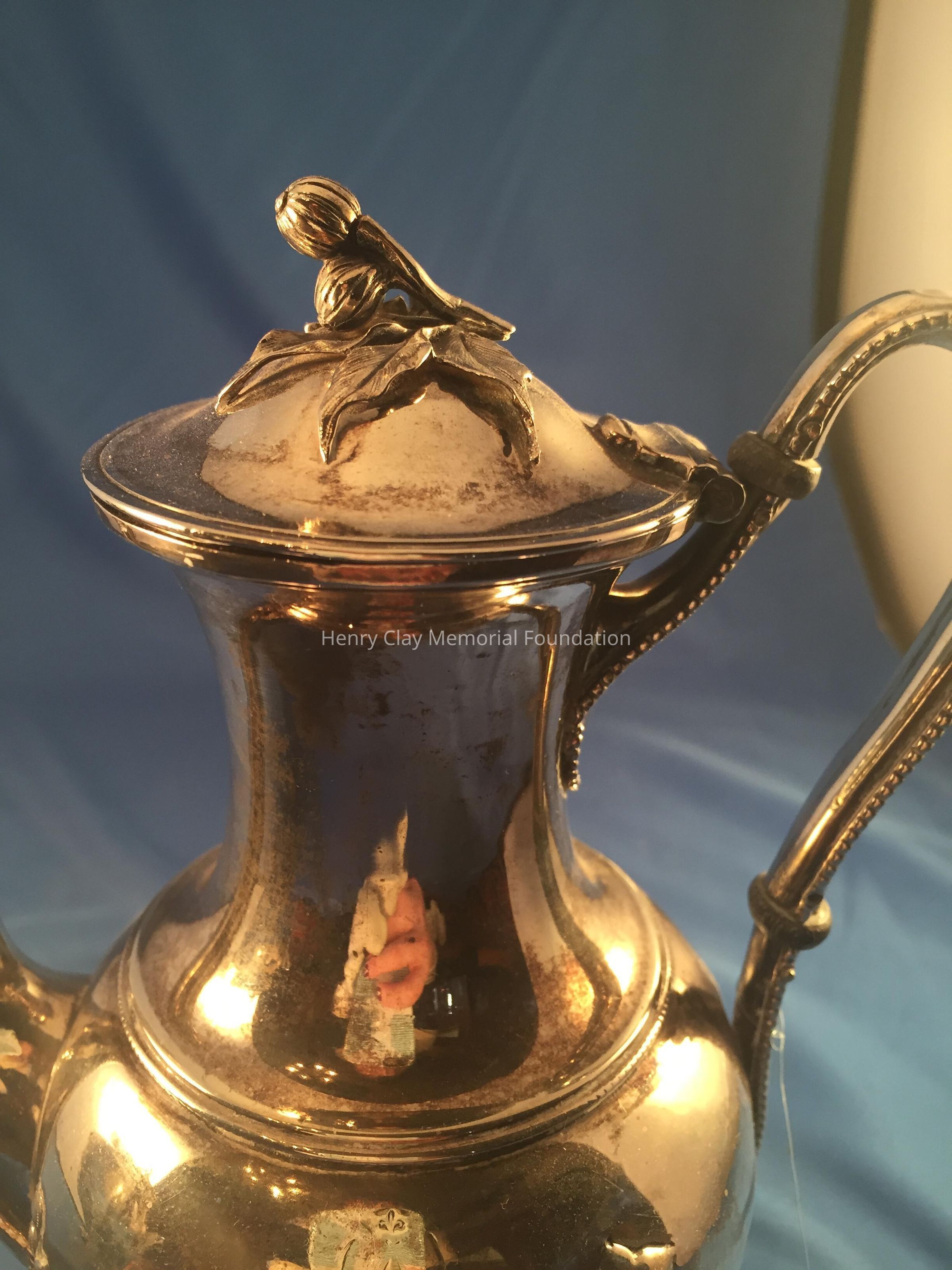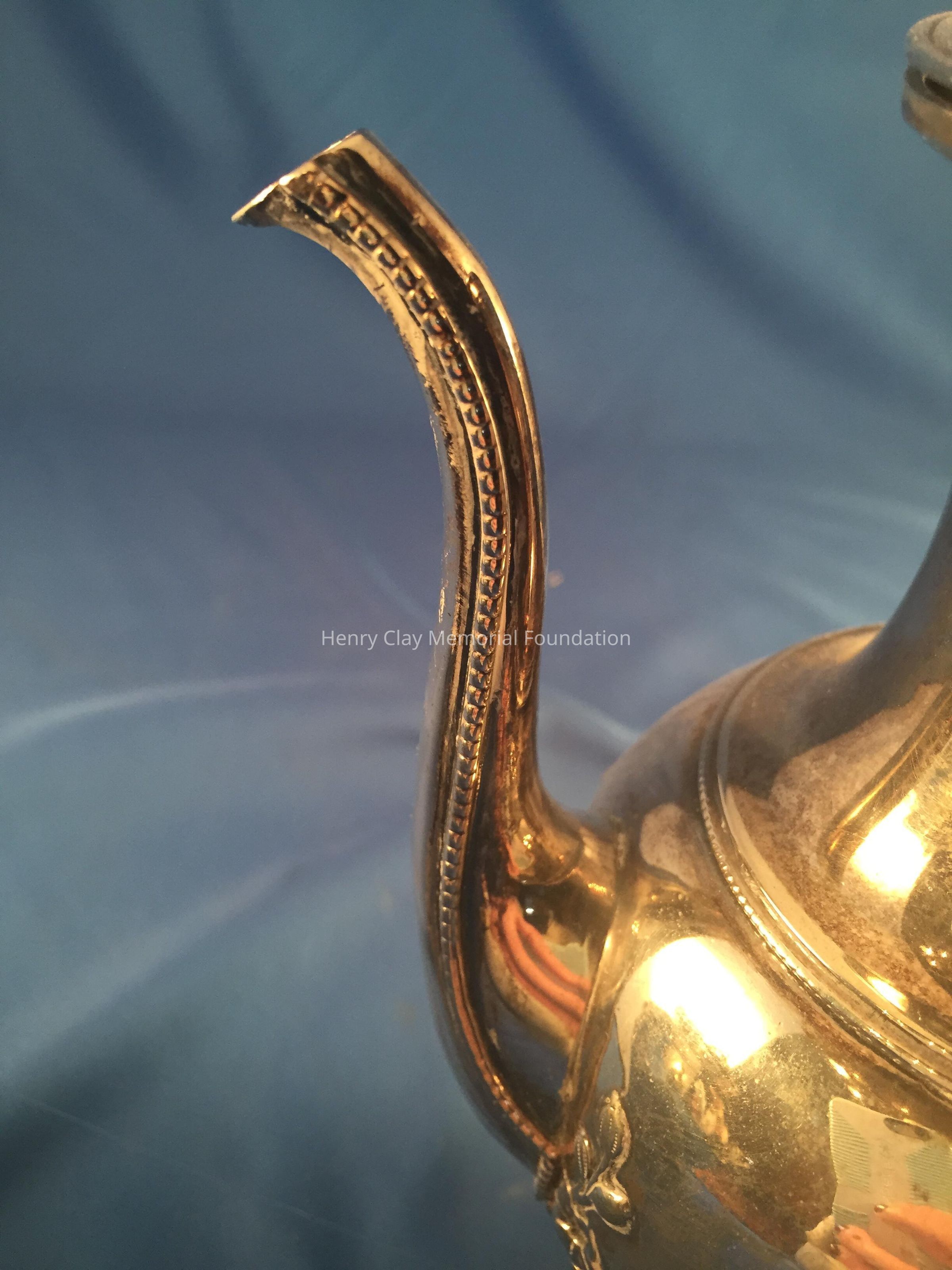 Silver tea service consists of a tray with an engraving of Henry Clay after Dodge's portrait and six matched pieces with applied decoration depicting sugar cane, coffee beans, and tea leaves. Includes a tray, teapot, hot water pot, coffee pot, sugar with lid, creamer, and a waste bowl.