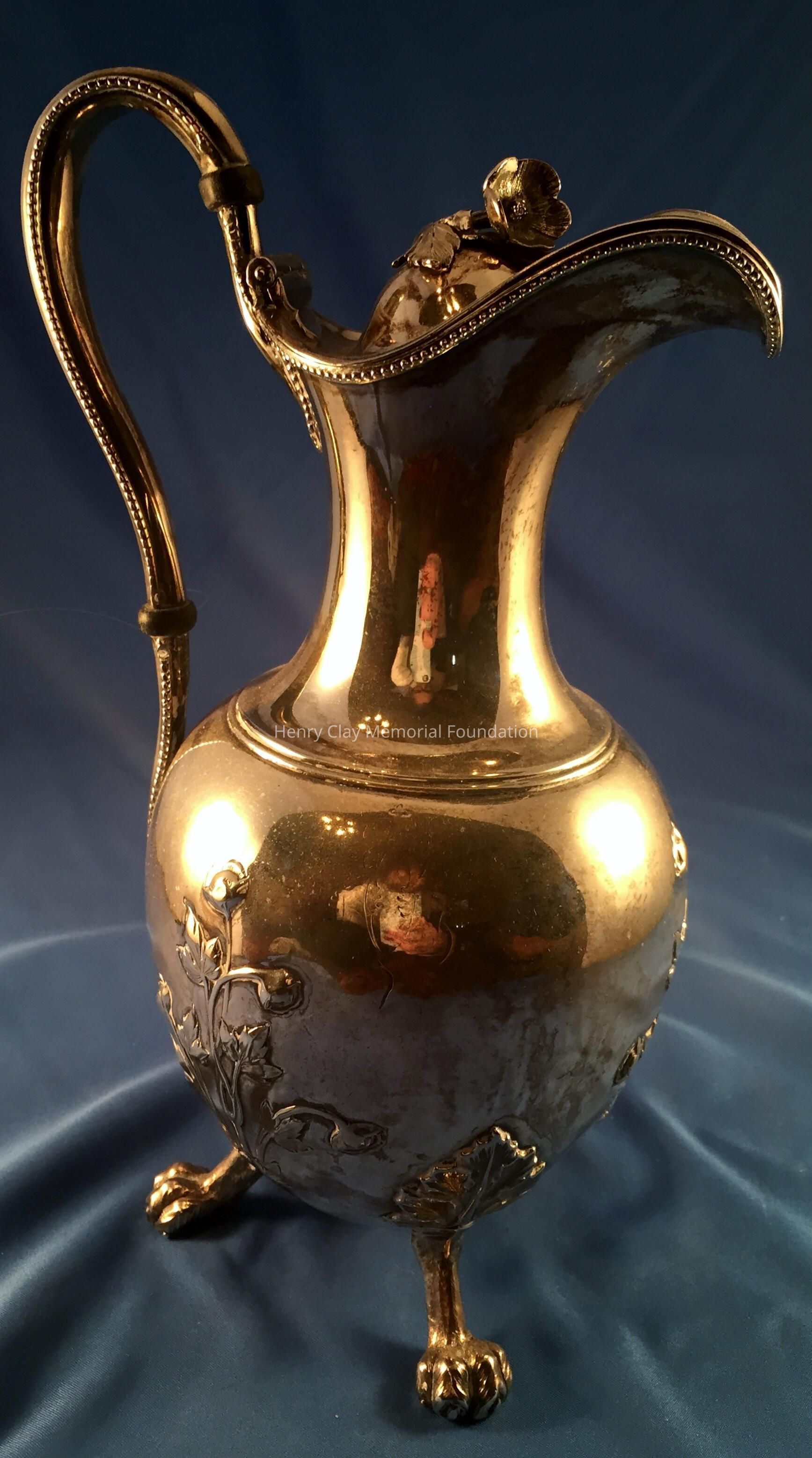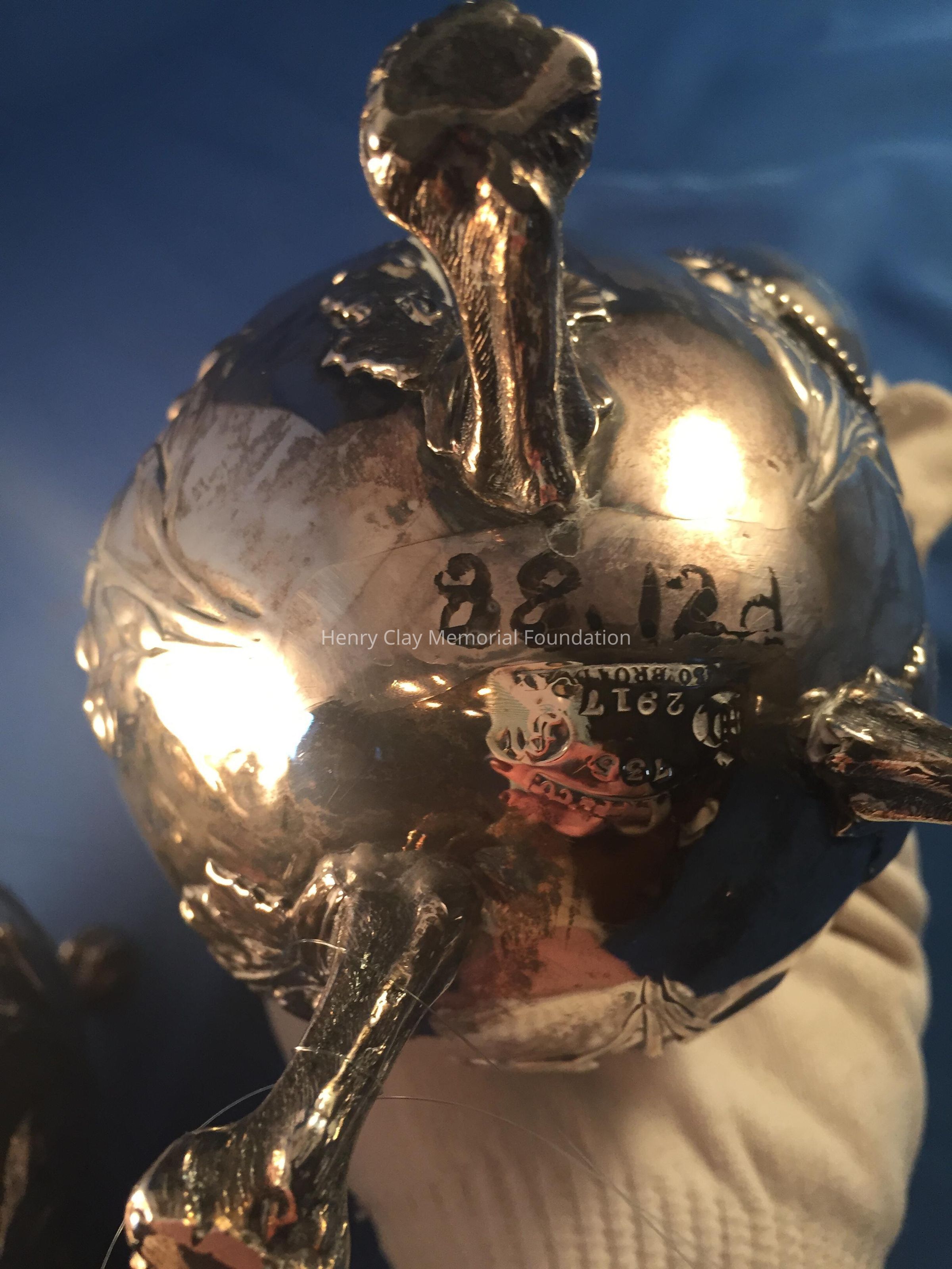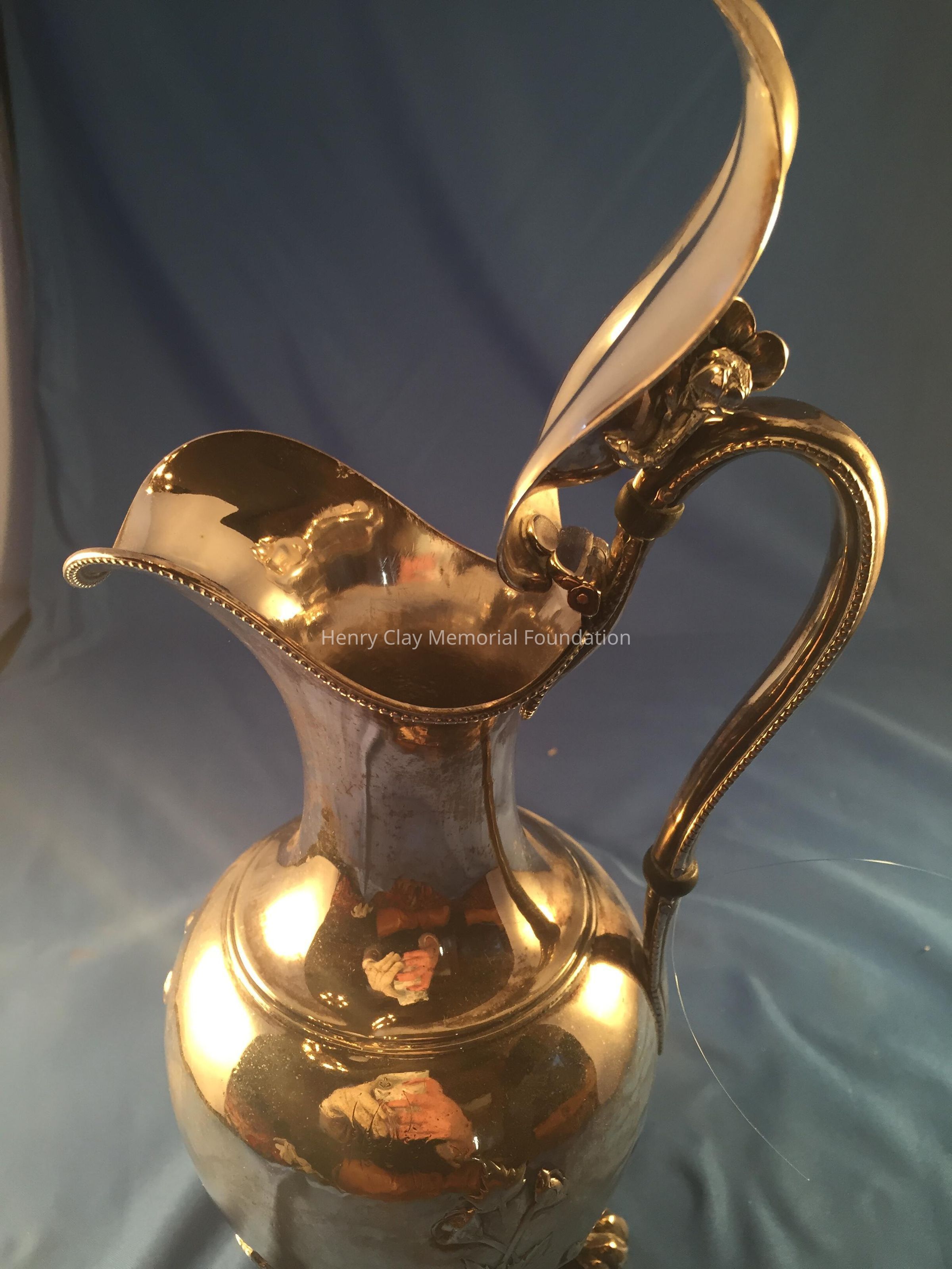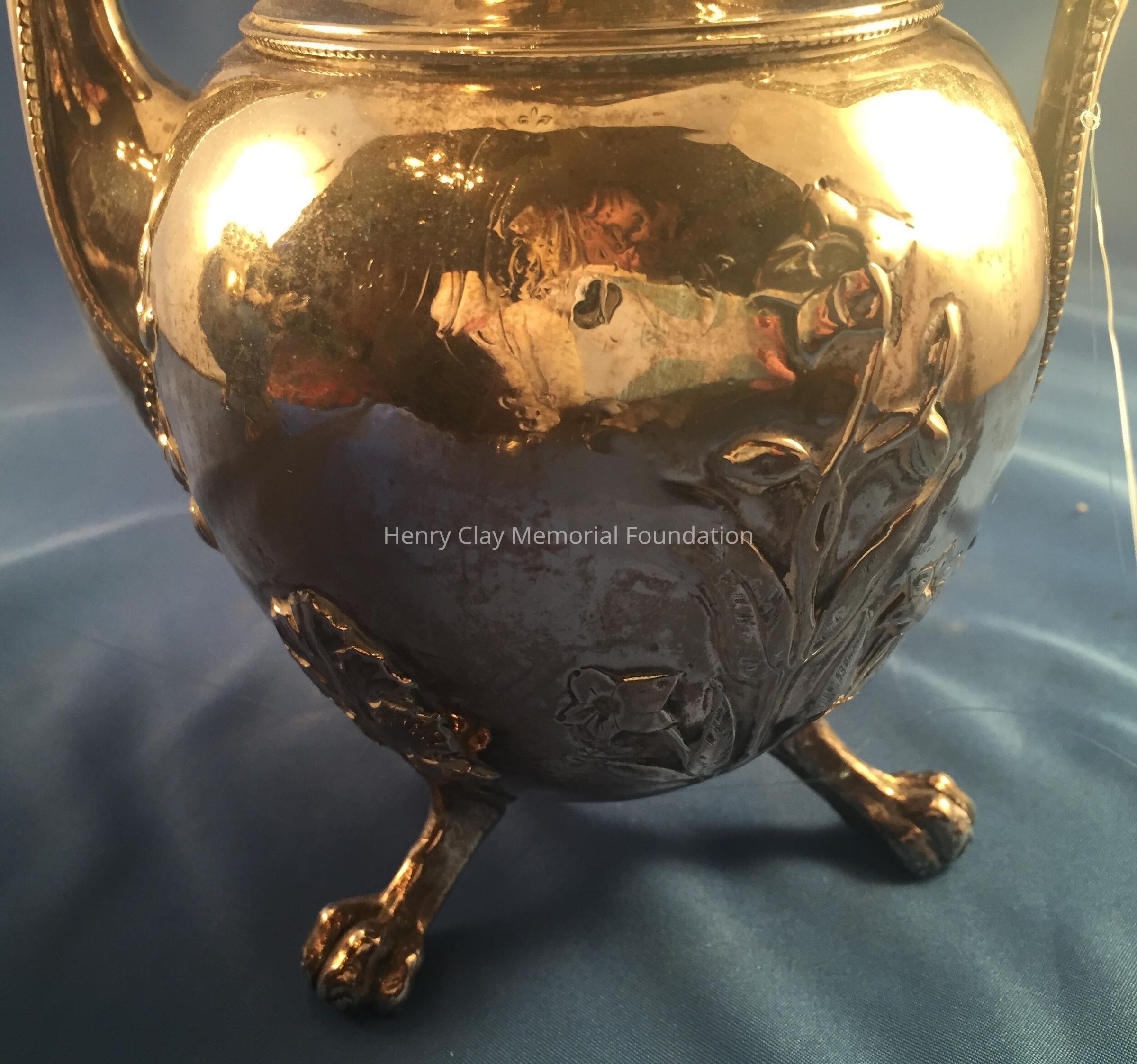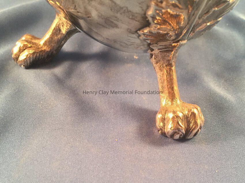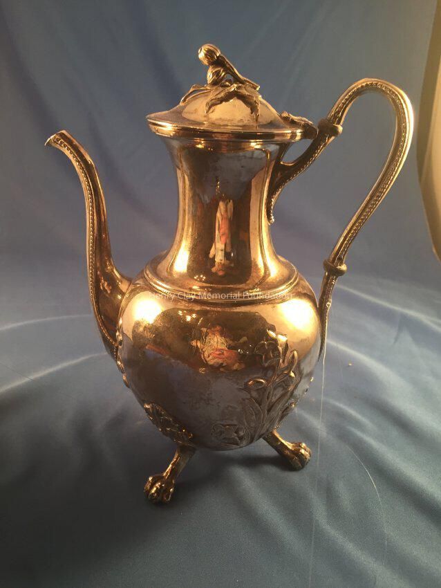 Silver tea service consists of a tray with an engraving of Henry Clay after Dodge's portrait and six matched pieces with applied decoration depicting sugar cane, coffee beans, and tea leaves. Includes a tray, teapot, hot water pot, coffee pot, sugar with lid, creamer, and a waste bowl.